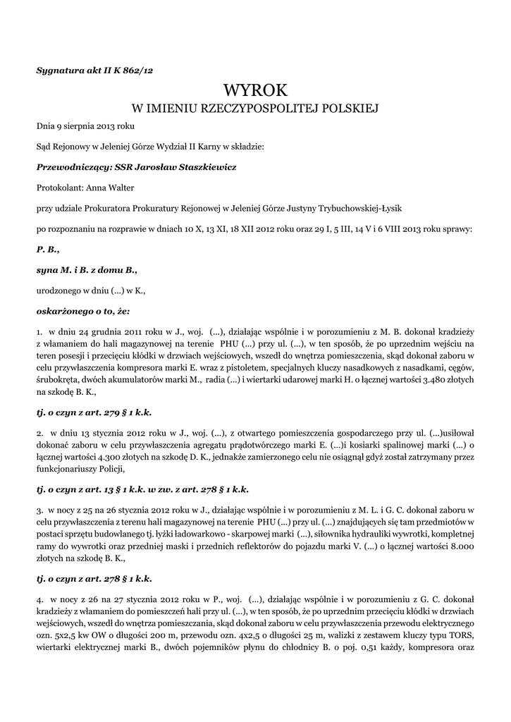 Sygnatura akt II K 862/12 WYROK W IMIENIU RZECZYPOSPOLITEJ POLSKIEJ Dnia 9 sierpnia 2013 roku Sąd Rejonowy w Jeleniej Górze Wydział II Karny w składzie: Przewodniczący: SSR Jarosław Staszkiewicz Protokolant: Anna Walter przy udziale Prokuratora Prokuratury Rejonowej w Jeleniej Górze Justyny Trybuchowskiej-Łysik po rozpoznaniu na rozprawie w dniach 10 X, 13 XI, 18 XII 2012 roku oraz 29 I, 5 III, 14 V i 6 VIII 2013 roku sprawy: P. B., syna M. i B. z domu B., urodzonego w dniu (...) w K., oskarżonego o to, że: 1. w dniu 24 grudnia 2011 roku w J., woj. (...), działając wspólnie i w porozumieniu z M. B. dokonał kradzieży z włamaniem do hali magazynowej na terenie PHU (...) przy ul. (...), w ten sposób, że po uprzednim wejściu na teren posesji i przecięciu kłódki w drzwiach wejściowych, wszedł do wnętrza pomieszczenia, skąd dokonał zaboru w celu przywłaszczenia kompresora marki E. wraz z pistoletem, specjalnych kluczy nasadkowych z nasadkami, cęgów, śrubokręta, dwóch akumulatorów marki M., radia (...) i wiertarki udarowej marki H. o łącznej wartości 3.480 złotych na szkodę B. K., tj. o czyn z art. 279 § 1 k.k. 2. w dniu 13 stycznia 2012 roku w J., woj. (...), z otwartego pomieszczenia gospodarczego przy ul. (...)usiłował dokonać zaboru w celu przywłaszczenia agregatu prądotwórczego marki E. (...)i kosiarki spalinowej marki (...) o łącznej wartości 4.300 złotych na szkodę D. K., jednakże zamierzonego celu nie osiągnął gdyż został zatrzymany przez funkcjonariuszy Policji, tj. o czyn z art. 13 § 1 k.k. w zw. z art. 278 § 1 k.k. 3. w nocy z 25 na 26 stycznia 2012 roku w J., działając wspólnie i w porozumieniu z M. L. i G. C. dokonał zaboru w celu przywłaszczenia z terenu hali magazynowej na terenie PHU (...) przy ul. (...) znajdujących się tam przedmiotów w postaci sprzętu budowlanego tj. łyżki ładowarkowo - skarpowej marki (...), siłownika hydrauliki wywrotki, kompletnej ramy do wywrotki oraz przedniej maski i przednich reflektorów do pojazdu marki V. (...) o łącznej wartości 8.000 złotych na szkodę B. K., tj. o czyn z art. 278 § 1 k.k. 4. w nocy z 26 na 27 stycznia 2012 roku w P., woj. (...), działając wspólnie i w porozumieniu z G. C. dokonał kradzieży z włamaniem do pomieszczeń hali przy ul. (...), w ten sposób, że po uprzednim przecięciu kłódki w drzwiach wejściowych, wszedł do wnętrza pomieszczania, skąd dokonał zaboru w celu przywłaszczenia przewodu elektrycznego ozn. 5x2,5 kw OW o długości 200 m, przewodu ozn. 4x2,5 o długości 25 m, walizki z zestawem kluczy typu TORS, wiertarki elektrycznej marki B., dwóch pojemników płynu do chłodnicy B. o poj. 0,51 każdy, kompresora oraz hydraulicznego rębaka do drewna i przedłużacza elektrycznego o łącznej wartości 2.550 złotych na szkodę Z. W., T. S. i Szkoły Podstawowej w P., tj. o czyn z art. 279 § 1 k.k. oraz M. B., syna M. i B. z domu B., urodzonego w dniu (...) w J. oskarżonego o to, że: 5. w dniu 24 grudnia 2011 roku w J., woj. (...), działając wspólnie i w porozumieniu z P. B. dokonał kradzieży z włamaniem do hali magazynowej na terenie PHU (...) przy ul. (...), w ten sposób, że po uprzednim wejściu na teren posesji i przecięciu kłódki w drzwiach wejściowych, wszedł do wnętrza pomieszczenia, skąd dokonał zaboru w celu przywłaszczenia kompresora marki E. wraz z pistoletem, specjalnych kluczy nasadkowych z nasadkami, cęgi, śrubokręta, dwóch akumulatorów marki M., radia (...), wiertarki udarowej marki H. o łącznej wartości 3.480 złotych na szkodę B. K., tj. o czyn z art. 279 § 1 k.k. I. uznaje oskarżonego P. B. za winnego popełnienia zarzucanych mu czynów, opisanych w punktach 1 i 4 części wstępnej wyroku przy wyeliminowaniu z opisu pierwszego z tych czynów stwierdzenia o dokonaniu przestępstwa wspólnie i w porozumieniu z M. B. oraz przy wskazaniu, iż czyn ten miał miejsce w dniu 23 lub 24 grudnia 2011 roku, to jest występków z art. 279 § 1 k.k., przy przyjęciu, iż stanowiły one elementy ciągu przestępstw i za to, na podstawie art. 279 § 1 k.k. w zw. z art. 91 § 1 k.k., wymierza mu karę roku i 4 ( czterech ) miesięcy pozbawienia wolności; II. uznaje oskarżonego P. B. za winnego popełnienia zarzucanych mu czynów, opisanych w punktach 2 i 3 części wstępnej wyroku, to jest występków z art. 13 § 1 k.k. w zw. z art. 278 § 1 k.k. oraz z art. 278 § 1 k.k., przy przyjęciu, iż stanowiły one elementy ciągu przestępstw i za to, na podstawie art. 278 § 1 k.k. w zw. z art. 91 § 1 k.k., wymierza mu karę 10 ( dziesięciu ) miesięcy pozbawienia wolności; III. na podstawie art. art. 86 § 1 k.k. w zw. z art. 91 § 2 k.k., orzeczone w pkt. I i II części dyspozytywnej wyroku wobec oskarżonego P. B. kary pozbawienia wolności łączy i wymierza karę łączną roku i 6 ( sześciu ) miesięcy pozbawienia wolności; IV. na podstawie art. 69 § 1 i 2 k.k. oraz art. 70 § 1 pkt 1 k.k. warunkowo zawiesza wykonanie orzeczonej wobec oskarżonego P. B. łącznej kary pozbawienia wolności na okres próby wynoszący 5 ( pięć ) lat; V. na podstawie art. 72 § 1 pkt 4 i 5 k.k., zobowiązuje oskarżonego P. B. w okresie próby do powstrzymania się od używania środków odurzających oraz do podjęcia stałej pracy zarobkowej; VI. na podstawie art. 72 § 2 k.k., zobowiązuje oskarżonego P. B. do naprawienia szkody w części poprzez zapłatę na rzecz: B. K. kwoty 400 ( czterystu ) złotych, zaś na rzecz Z. W. kwoty 500 ( pięciuset ) złotych, obu w terminie 2 ( dwóch ) lat od dnia uprawomocnienia się wyroku; VII. na podstawie art. 63 § 1 k.k., na poczet orzeczonej wobec oskarżonego P. B. łącznej kary pozbawienia wolności zalicza okres jego zatrzymania w sprawie w dniach 13, 14, 27, 28 i 29 I 2012 roku, VIII. uniewinnia oskarżonego M. B. od popełnienia zarzucanego mu czynu, opisanego w punkcie 5 części wstępnej wyroku; IX. na podstawie art. 231 § 1 k.p.k., składa do d