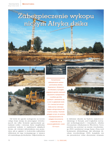 Geoinżynieria GEOINŻYNIERIA drogi mosty tunele Zabezpieczenie wykopu niczym Afryka dzika Arkadiusz Stawiarski Zakład Robót Inżynieryjnych Henryk Chrobok i Hubert Chrobok Sp.j. Fot. 1. Układanie zbrojenia płyty fundamentowej w wykopie zabezpieczonym ścianką z grodzic Kompleksowe Fot. 2. zabezpieczenie wykopu Realizacja robót ziemnych z jednoczesnym prowadzeniem pompowania wody z wykopu pod budowę obiektu Fot. 3. Wykonanie chudego betonu na części zabezpieczenia oddanej do użytku Fot. 5. Wykop realizowany do głębokości 6,95 m. Ścianka podparta pośrednio przy pomocy kotew Oceanarium i Afrykarium we Wrocławiu wymagało pogrążenia grodzic stalowych do poziomu występowania w podłożu gruntów spoistych i zakotwienia się w nich na głębokość około 2 m, tworząc tym samym białą wannę i odcinając dopływ wód gruntowych do Fot. 4. wnętrza wykopu. Trudność Odcinek ścianki stalowej pogrążany przy użyciu prasy hydraulicznej firmy Giken polegała na tym, że warstwy nieprzepuszczalne nie Od wielu lat ogrody zoologiczne na terenie całego kraju starają się przyciągnąć zwiedzających nie tylko licznymi egzotycznymi gatunkami roślin i zwierząt, które moglibyśmy podziwiać jedynie w najdalszych zakątkach świata, ale również infrastrukturą oraz pomysłem, jak je oglądać w środowisku najbardziej zbliżonym do tego występującego w miejscu ich naturalnego pochodzenia. Odpowiedzią na 72 zalegały równomiernie i znajdowały się na znacznej głębokości, nawet 12 m p.p.t. lipiec - wrzesień 3 / 2013 [44] te dylematy okazała się budowa najnowocześniejszego w Europie, pod względem rozwiązań technologicznych i wizualnych, obiektu Oceanarium i Afrykarium we Wrocławiu. Nowy pawilon ma powstać na terenie wrocławskiego ZOO i przykuwać uwagę fauną i florą wód kontynentu afrykańskiego. Jak informuje dyrekcja wrocławskiego ZOO, kompleks ten ma prezentować różne ekosystemy związane GEOINŻYNIERIA Geoinżynieria drogi mosty tunele ze środowiskiem wodnym Czarnego Lądu, a liczne akwaria, zbiorniki oraz baseny zlokalizowane w jego wnętrzu, przedstawiać m.in. rafę koralową Morza Czerwonego, czy słodkowodne jeziora Malawi i Tanganika wraz z ich mieszkańcami. Aby tak wyjątkowy projekt mógł zostać wprowadzony w życie, w pierwszej kolejności należało wykonać zabezpieczenie wykopu o głębokości sięgającej maksymalnie 6,95 m p.p.t. na odcinku łącznie 574 mb. Konstrukcja miała pozwolić na bezpieczne oraz „suche”, ze względu na wysoki poziom występowania wód gruntowych, prowadzenie robót fundamentowych w sąsiedztwie istniejących budynków mieszkalnych zwierząt oraz ich wybiegów. I tak, dnia 26.04.2012 r. doszło do podpisania umowy pomiędzy Generalnym Wykonawcą budowy Afrykarium – Przedsiębiorstwem Budowlanym Inter-System S.A. oraz Zakładem Robót Inżynieryjnych Henryk Chrobok i Hubert Chrobok Sp.J., na wykonanie kompleksowego zabezpieczenia wykopu pod budowę przedmiotowej inwestycji. Idea proponowanego przez nas zabezpieczenia zakładała pogrążenie grodzic stalowych do poziomu występowania w podłożu gruntów spoistych i zakotwienie się w nich na głębokość około 2 m, tworząc tym samym białą wannę i odcinając dopływ wód gruntowych do wnętrza wykopu. Trudność polegała na tym, że warstwy nieprzepuszczalne nie zalegały równomiernie i znajdowały się na znacznej głębokości, nawet 12 m p.p.t. wg dostarczonej na etapie przetargu dokumentacji geotechnicznej. Co więcej, wykonane przekroje geologiczne nie pokrywały się z planowanym przebiegiem zabezpieczenia. Tym samym istniało duże ryzyko, że warstwa glin piaszczystych lokalnie może występować głębiej niż przypuszczano. Na takie ryzyko nikt nie mógł sobie pozwolić, dlatego przed przystąpieniem do realizacji zamówienia zlecono wykonanie dodatkowych otworów geotechnicznych do głębokości 16 m, zlokalizowanych wzdłuż trasy przedmiotowej ścianki stalowej co około 26 m. Po analizie wstępnych wyników dodatkowych wierceń przeprowadzonych przez firmę Inż-Geo z Wrocławia, warstwy spoiste, nieprzepuszczalne zalegały znacznie niżej niż w posiadanej wcześniej dokumentacji, stanowiącej podstawę założeń projektowych. Różnica poziomów stropów warstw nieprzepuszczalnych wg starej i nowej geologii wynosiła miejscami nawet 4 m. Sytuacja ta wymagała zweryfikowania rozwiązania konstrukcyjnego pod kątem odpowiedniego doboru długości brusów stalowych. W konsekwencji zwiększono ją z 14 m do 15–16 m, gwarantując odcięcie od wód gruntowych i spełniając kryterium szczelności stawiane naszemu zabezpieczeniu. Ponadto, z uwagi na duże parcie gruntu na obudowę wykopu oraz dodatkowe obciążenia od stóp fundamentowych czterech żurawi wieżowych, stateczność konstrukcji zapewniono podpierając ją pośrednio za pomocą jednego rzędu systemowych kotew gruntowych GONAR R51N o nośności 440 kN i długości 16 m. Obciążenie od jednej łapy żurawia wynosiło do 633 kN. Łączenie wykonano ponad 100 szt. kotew gruntowych. Pogrążenie ścianki stalowej odbywało się przy wykorzystaniu wibromłotów bezrezonansowych o wysokiej częstotliwości typu IPC 28RF, Tunkers HVB 100 oraz prasy hydraulicznej do statycznego wciskania grodzic japońskiej firmy Giken. Wymogiem zamawiającego było, aby na części zabezpieczenia w planie instalować w ziemi profile stalowe metodą lipiec - wrzesień 3 / 2013 [44] 73 Geoinżynieria GEOINŻYNIERIA drogi mosty tunele Rys. 1. Przykładowy przekrój z dodatkowej dokumentacji geotechnicznej z widocznym przegłębieniem warstwy gruntów spoistych. Czerwoną linią zaznaczony został strop gruntów nieprzepuszczalnych wg starej dokumentacji bezwibracyjną. Było to spowodowane lokalizacją w bezpośrednim sąsiedztwie prowadzonych robót starego, zabytkowego wodociągu 800 oraz istniejących budynków mieszkalnych dla zwierząt. W celu maksymalnego przyspieszenia prac były on
