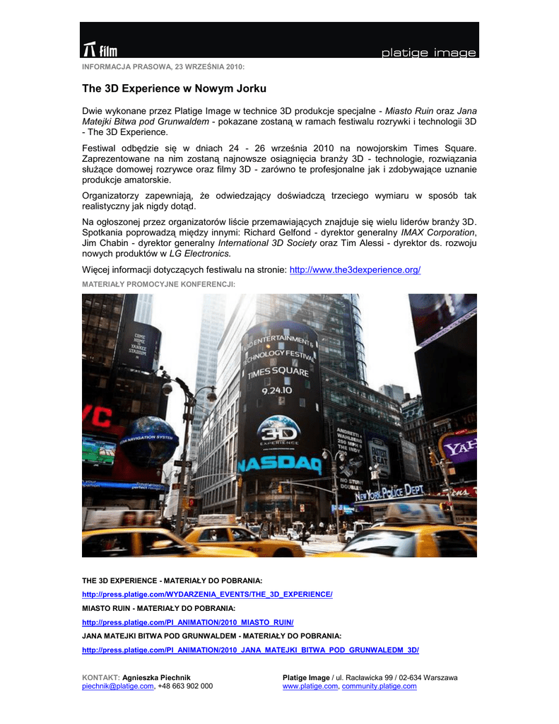 INFORMACJA PRASOWA, 23 WRZEŚNIA 2010: The 3D Experience w Nowym Jorku Dwie wykonane przez Platige Image w technice 3D produkcje specjalne - Miasto Ruin oraz Jana Matejki Bitwa pod Grunwaldem - pokazane zostaną w ramach festiwalu rozrywki i technologii 3D - The 3D Experience. Festiwal odbędzie się w dniach 24 - 26 września 2010 na nowojorskim Times Square. Zaprezentowane na nim zostaną najnowsze osiągnięcia branży 3D - technologie, rozwiązania służące domowej rozrywce oraz filmy 3D - zarówno te profesjonalne jak i zdobywające uznanie produkcje amatorskie. Organizatorzy zapewniają, że odwiedzający doświadczą trzeciego wymiaru w sposób tak realistyczny jak nigdy dotąd. Na ogłoszonej przez organizatorów liście przemawiających znajduje się wielu liderów branży 3D. Spotkania poprowadzą między innymi: Richard Gelfond - dyrektor generalny IMAX Corporation, Jim Chabin - dyrektor generalny International 3D Society oraz Tim Alessi - dyrektor ds. rozwoju nowych produktów w LG Electronics. Więcej informacji dotyczących festiwalu na stronie: http://www.the3dexperience.org/ MATERIAŁY PROMOCYJNE KONFERENCJI: THE 3D EXPERIENCE - MATERIAŁY DO POBRANIA: http://press.platige.com/WYDARZENIA_EVENTS/THE_3D_EXPERIENCE/ MIASTO RUIN - MATERIAŁY DO POBRANIA: http://press.platige.com/PI_ANIMATION/2010_MIASTO_RUIN/ JANA MATEJKI BITWA POD GRUNWALDEM - MATERIAŁY DO POBRANIA: http://press.platige.com/PI_ANIMATION/2010_JANA_MATEJKI_BITWA_POD_GRUNWALEDM_3D/ KONTAKT: Agnieszka Piechnik [email protected], +48 663 902 000 Platige Image / ul. Racławicka 99 / 02-634 Warszawa www.platige.com, community.platige.com