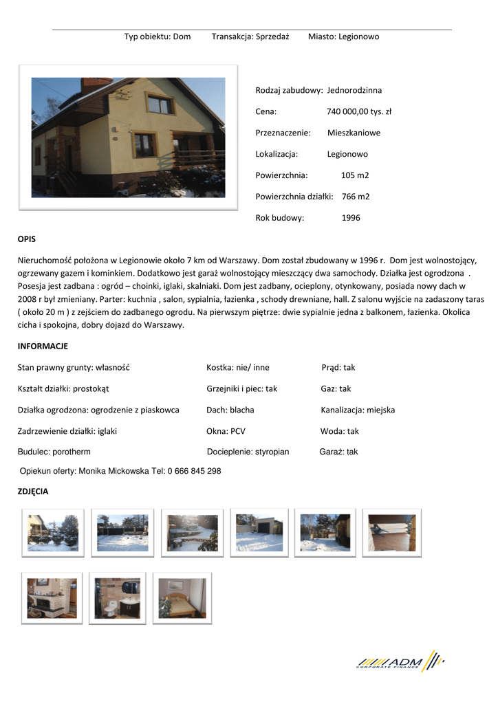 Typ obiektu: Dom Transakcja: Sprzedaż Miasto: Legionowo Rodzaj zabudowy: Jednorodzinna Cena: 740 000,00 tys. zł Przeznaczenie: Mieszkaniowe Lokalizacja: Legionowo Powierzchnia: 105 m2 Powierzchnia działki: 766 m2 Rok budowy: 1996 OPIS Nieruchomość położona w Legionowie około 7 km od Warszawy. Dom został zbudowany w 1996 r. Dom jest wolnostojący, ogrzewany gazem i kominkiem. Dodatkowo jest garaż wolnostojący mieszczący dwa samochody. Działka jest ogrodzona . Posesja jest zadbana : ogród – choinki, iglaki, skalniaki. Dom jest zadbany, ocieplony, otynkowany, posiada nowy dach w 2008 r był zmieniany. Parter: kuchnia , salon, sypialnia, łazienka , schody drewniane, hall. Z salonu wyjście na zadaszony taras ( około 20 m ) z zejściem do zadbanego ogrodu. Na pierwszym piętrze: dwie sypialnie jedna z balkonem, łazienka. Okolica cicha i spokojna, dobry dojazd do Warszawy. INFORMACJE Stan prawny grunty: własność Kostka: nie/ inne Prąd: tak Kształt działki: prostokąt Grzejniki i piec: tak Gaz: tak Działka ogrodzona: ogrodzenie z piaskowca Dach: blacha Kanalizacja: miejska Zadrzewienie działki: iglaki Okna: PCV Woda: tak Budulec: porotherm Docieplenie: styropian Garaż: tak Opiekun oferty: Monika Mickowska Tel: 0 666 845 298 ZDJĘCIA