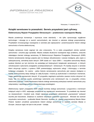 Warszawa, 11 sierpnia 2011 r. Ksi& ki serwisowe to przesz o'(. Serwis przysz o'ci jest cyfrowy. Elektroniczny Rejestr Przegl&dów Okresowych – prze omowe rozwi&zanie Mazdy. Mazda prze amuje konwencje i wyznacza nowe standardy – nie tylko opracowuj c wyj tkowe technologie i stosuj c je w swoich samochodach, ale równie" w zakresie obs ugi posprzeda"nej. Przyk adem innowacyjnego rozwi zania w serwisie jest zapisywanie i przechowywanie historii obs ugi samochodu w formie elektronicznej. Ksi "ka serwisowa mo"e zagin ' lub ulec zniszczeniu. To w wielu przypadkach obni"a warto)' samochodu i utrudnia jego sprzeda". Mazda znalaz a skuteczne rozwi zanie tego problemu, znacznie u atwiaj ce równie" obs ug* serwisow . W Elektronicznym Rejestrze Przegl dów Okresowych (DSR) historia serwisowania danego pojazdu jest na bie" co aktualizowana i zawsze dost*pna, jako zapis w zabezpieczonej, centralnej bazie danych. DSR dzia a od 1 lipca 2006 r. i wszystkie samochody Mazdy wydane klientom po tym terminie nie posiadaj ju" tradycyjnych ksi "eczek serwisowych, w których odnotowywano wykonanie przegl dów przedsprzeda"nych i okresowych. Po ka"dej wizycie w serwisie klient otrzymuje wydruk z systemu DSR potwierdzaj cy wykonanie us ugi i informuj cy o terminie kolejnego przegl du. Co wa"ne - pe na historia serwisowania samochodu jest zawsze dost*pna w ka"dej autoryzowanej stacji obs ugi (w ca ej Europie) i mo"na j wydrukowa' w dowolnym momencie, maj c gwarancj* poprawno)ci danych. W przypadku zagini*cia wydruków zawsze mo"na otrzyma' ich kopi*. Nie ma równie" ryzyka powtórnego wykonania prac serwisowych (np. w przypadku zmiany w a)ciciela pojazdu). Udokumentowana historia obs ugi serwisowej podwy"sza warto)' samochodu przy odsprzeda"y i zapobiega próbom manipulacji jego przebiegiem. Elektroniczny rejestr przegl dów DSR u atwia kontrol obs ugi samochodu i przypomina o terminach kolejnych wizyt w ASO, wp ywaj c pozytywnie na regularno#$ serwisowania. To przek ada si równie' na niezawodno#$ i trwa o#$ auta. Dzi ki rejestracji przebiegów jakiekolwiek „poprawianie” wskaza* licznika jest bezcelowe. Zwi ksza to zaufanie nabywców pojazdów u'ywanych. Wzrasta te' warto#$ rezydualna samochodu – podkre)la Marek Siennicki, dyrektor ds. obs ugi posprzeda"nej Mazda Motor Poland. System umo'liwia sprawdzenie historii obs ugi samochodu w ka'dym serwisie Mazdy w Europie. Jeszcze nigdy nie by o to tak proste – dodaje. Mazda Motor Logistics Europe Sp. z o.o. Oddzia w Polsce ul. I ecka 24, 02-135 Warszawa Mazda Motor Logistics Europe Sp. z o.o. Oddzia w Polsce ul. I ecka 24, 02-135 Warszawa Kontakt dla mediów: Magdalena W*glewska tel. 022 318 19 80, kom. 606 600 260 e-mail: [email protected] strona prasowa: www.mazda-press.pl Mazda Motor Logistics Europe Sp. z o.o. Oddzia w Polsce ul. I ecka 24, 02-135 Warszawa