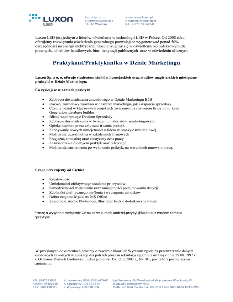 Luxon Sp. z o.o. Ul Krzywoustego 85b 51-166 Wrocław www: www.luxon.pl e-mail: [email protected] tel: +48 71 733 60 50 Luxon LED jest jednym z liderów oświetlenia w technologii LED w Polsce. Od 2008 roku oferujemy rozwiązania oświetlenia generalnego pozwalające wygenerować ponad 50% oszczędności na energii elektrycznej. Specjalizujemy się w oświetleniu kompleksowym dla przemysłu, obiektów handlowych, biur, instytucji publicznych oraz w oświetleniu ulicznym. Praktykant/Praktykantka w Dziale Marketingu Luxon Sp. z o. o. oferuje studentom studiów licencjackich oraz studiów magisterskich miesięczne praktyki w Dziale Marketingu. Co zyskujesz w ramach praktyk: Zdobycie doświadczenia zawodowego w Dziale Marketingu B2B Rozwój zawodowy zarówno w obszarze marketingu, jak i wsparcia sprzedaży Czynny udział w kluczowych projektach związanych z rozwojem firmy m.in. Lead Generation ,database builder Bliską współpracę z Działem Sprzedaży Zdobycie doświadczenia w tworzeniu materiałów marketingowych Opiekę mentora przez cały czas trwania praktyk Zdobywanie nowych umiejętności u lidera w branży oświetleniowej Możliwość uczestnictwa w szkoleniach firmowych Przyjazną atmosferę oraz elastyczny czas pracy Zaświadczenie o odbyciu praktyk oraz referencje Możliwość zatrudnienia po wykonaniu praktyk, na warunkach umowy o pracę. Czego oczekujemy od Ciebie: Kreatywność Umiejętności efektywnego ustalania priorytetów Samodzielności w działaniu oraz umiejętności podejmowania decyzji Zdolności analitycznego myślenia i wyciągania wniosków Dobra znajomość pakietu MS Office Znajomość Adobe Photoshop, Illustrator będzie dodatkowym atutem Proszę o wysyłanie wyłącznie CV na adres e-mail: [email protected] z tytułem tematu “praktyki”. W przesłanych dokumentach prosimy o zawarcie klauzuli: Wyrażam zgodę na przetwarzanie danych osobowych zawartych w aplikacji dla potrzeb procesu rekrutacji zgodnie z ustawą z dnia 29.08.1997 r. o Ochronie Danych Osobowych, tekst jednolity: Dz. U. z 2002 r., Nr 101, poz. 926 z późniejszymi zmianami. NIP: 8942513867 REGON: 93202548 KRS: 0000138301 Nr rejestrowy GIOŚ: E0016476W K. Zakładowy: 100 000 PLN K. Wpłacony: 100 000 PLN Sąd Rejonowy dla Wrocławia-Fabrycznej we Wrocławiu, VI Wydział Gospodarczy KRS; Raiffeisen Bank Polska S.A.: 08 1750 1064 0000 0000 1033 6918
