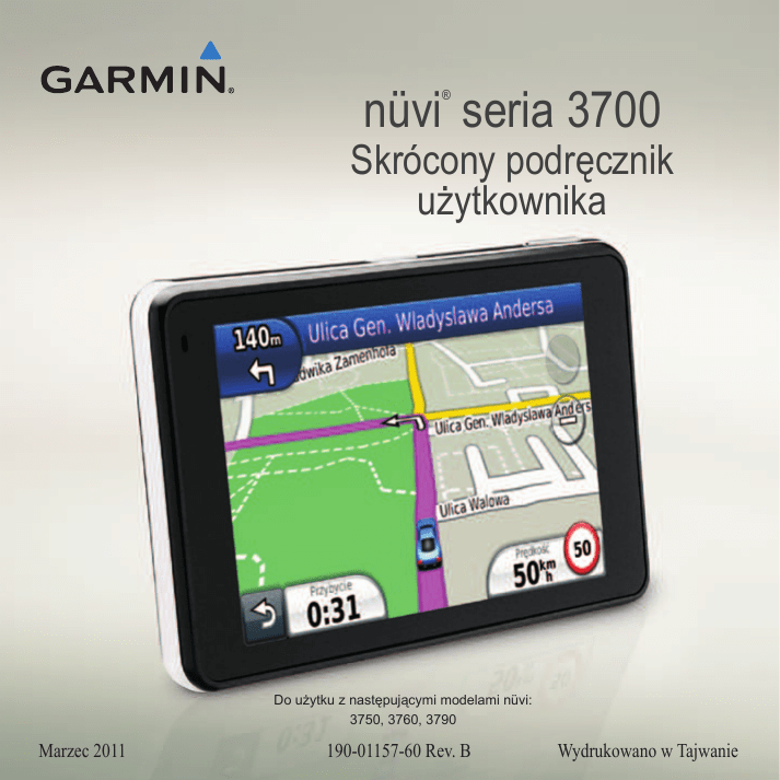 nüvi seria 3700 ® Skrócony podręcznik użytkownika Do użytku z następującymi modelami nüvi: 3750, 3760, 3790 Marzec 2011 190-01157-60 Rev. B Wydrukowano w Tajwanie Rozpoczęcie pracy z urządzeniem ‹ OSTRZEŻENIE Należy zapoznać się z zamieszczoną w instrukcji obsługi częścią Ważne informacje dotyczące bezpieczeństwa i produktu zawierającą ostrzeżenia i wiele istotnych wskazówek. Przy pierwszym użyciu urządzenia nüvi wykonaj następujące czynności: 1. Podłącz urządzenie do zasilania (strona 2). 2. Zamontuj urządzenie nüvi (strona 3). 3. Skonfiguruj urządzenie (strona 4). 4. Zlokalizuj satelity (strona 4). 5. Zapoznaj się z menu głównym (strona 5). Podłączanie urządzenia do zasilania Przewody zasilające Do urządzenia dołączone są dwa przewody zasilające. Każde ze złączy pasuje tylko do odpowiedniego portu. • Przewód zasilający z gniazda zapalniczki ➊ doprowadza zasilanie do uchwytu. Przewód zasilający z gniazda zapalniczki ma złącze z kątem prostym. • Kabel micro-USB ➋ służy do podłączania urządzenia do komputera. Na przedniej części kabla micro-USB widnieje litera „B”. ➊ ➋ Podłącz urządzenie do przewodu zasilającego podłączonego do gniazda zapalniczki w pojeździe. Urządzenie nüvi ładuje się podczas jazdy. 2 Skrócony podręcznik użytkownika nüvi seria 3700 Montowanie urządzenia ‹ OSTRZEŻENIE Ten produkt jest zasilany przez baterię litowo-jonową. Aby uniknąć ryzyka uszkodzenia ciała lub produktu w wyniku wystawienia baterii na działanie wysokich temperatur, należy urządzenie zabierać ze sobą przy wysiadaniu z samochodu albo przechowywać w miejscu nienarażonym na bezpośrednie działanie promieni słonecznych. Uwaga Przed zamontowaniem urządzenia w samochodzie zapoznaj się z przewodnikiem Ważne informacje dotyczące bezpieczeństwa i produktu zawierającym informacje prawne dotyczące montażu na szybie przedniej. 4. Zatrzaśnij uchwyt na ramieniu przyssawki. Uchwyt Uchwyt montażowy z przyssawką Przewód zasilający z gniazda zapalniczki Głośnik 5. Umieść dolną część urządzenia w uchwycie. 6. Przechyl urządzenie do tyłu, tak aby zatrzasnęło się na swoim miejscu. 1. Zdejmij przezroczystą folię z przyssawki. 2. Umieść przyssawkę na szybie przedniej. 3. Przesuń dźwignię do tyłu, w kierunku szyby. Skrócony podręcznik użytkownika nüvi seria 3700 Złącze przewodu zasilania z gniazda zapalniczki 3 Konfigurowanie urządzenia 1. Podłącz przewód zasilający z gniazda zapalniczki do uchwytu. 2. Podłącz drugi koniec przewodu zasilającego do gniazda zapalniczki w samochodzie. Urządzenie powinno włączyć się automatycznie, jeśli jest podłączone do gniazda a pojazd jest uruchomiony. 3. Wykonaj instrukcje wyświetlane na ekranie. 4. Jeśli korzystasz z odbiornika komunikatów drogowych w Europie, podłącz do niego zewnętrzną antenę i przymocuj ją do przedniej szyby za pomocą przyssawek. 4 Osłona panelu przedniego Mikrofon Głośnik (na panelu tylnym) Przycisk zasilania Złącze Micro-B Odbieranie sygnału z satelitów Słupki wskazują moc sygnału z satelitów. 1. Udaj się w teren otwarty, z dala od wysokich budynków i drzew. 2. Jeśli zajdzie potrzeba, włącz urządzenie. Odebranie sygnału z satelitów może potrwać kilka minut. Jeśli co najmniej jeden słupek zmieni kolor na zielony, oznacza to, że urządzenie odebrało sygnał z satelitów. Skrócony podręcznik użytkownika nüvi seria 3700 Menu główne ➊ ➋ ➌ Wyszukiwanie punktów szczególnych ➍ ➎ ➏ ➐ ➑ ➒ ➊ ➋ ➌ ➍ ➎ ➏ ➐ ➑ ➒ Moc sygnału z satelitów GPS. Dotknij, aby wybrać środek transportu. Dotknij, aby znaleźć cel podróży. Dotknij, aby wyświetlić mapę. Dotknij, aby zatrzymać trasę. Dotknij, aby wyznaczyć objazd dla trasy. Dotknij, aby wykonać połączenie, gdy urządzenie jest podłączone do zgodnego telefonu komórkowego. Więcej informacji można uzyskać na stronie www.garmin.com/bluetooth. Dotknij, aby wyregulować głośność. Dotknij, aby otworzyć menu narzędzi i ustawień. 1. W menu głównym dotknij kolejno Dokąd? > Punkty szczególne. 2. Wybierz kategorię i podkategorię, jeśli to konieczne. 3. Wybierz cel podróży. 4. Dotknij Jedź!. Znajdowanie miejsca poprzez literowanie nazwy 1. W menu głównym dotknij kolejno Dokąd? > Punkty szczególne > Literuj nazwę. 2. Podaj nazwę celu podróży. 3. Dotknij Gotowe. 4. Wybierz cel podróży. 5. Dotknij Jedź!. Wyszukiwanie w pobliżu innej lokalizacji 1. W menu głównym dotknij kolejno > Blisko. Dokąd? > 2. Wybierz opcję. Skrócony podręcznik użytkownika nüvi seria 3700 5 Podróż wyznaczoną trasą Trasa jest oznaczona na mapie karmazynową linią. Gdy użytkownik zjedzie z wyznaczonej trasy, urządzenie ponownie przelicza trasę. Podczas jazdy po głównych drogach może zostać wyświetlona ikona ograniczenia prędkości. ➋ ➌ ➊ ➑ ➍ ➊ ➎ ➏ ➐ Dotknij, aby wyświetlić stronę Następny zwrot. Jeśli widok skrzyżowania jest dostępny, zostanie wyświetlona strona Widok skrzyżowania. ➋ Dotknij, aby wyświetlić stronę Lista zwrotów. ➌ Dotknij, aby powiększać i zmniejszać. ➍ Dotknij, aby powrócić do menu głównego. 6 ➎ ➏ Dotknij, aby zmienić pole danych. Dotknij, aby wyświetlić stronę Gdzie jestem?. ➐ Dotknij, aby wyświetlić stronę Komputer podróży. ➑ Dotknij mapy i przeciągnij ją, aby zobaczyć inny obszar. Dodawanie postoju Dodanie postoju jest możliwe podczas podróży wyznaczoną trasą. 1. Dotknij , aby powrócić do menu głównego. 2. Dotknij Dokąd?. 3. Wyszukaj dodatkowy postój. 4. Wybierz postój z listy wyników wyszukiwania. 5. Dotknij Jedź!. 6. Dotknij Dodaj do bieżącej trasy. Skrócony podręcznik użytkownika nüvi seria 3700 Korzystanie z objazdu Wybranie objazdu jest możliwe podczas podróży wyznaczoną trasą. 1. Dotknij , aby powrócić do menu głównego. 2. Dotknij Objazd. Jeśli trasa, 