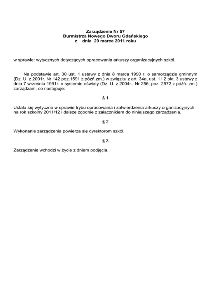 Zarządzenie Nr 57 Burmistrza Nowego Dworu Gdańskiego z dnia 29 marca 2011 roku w sprawie: wytycznych dotyczących opracowania arkuszy organizacyjnych szkół. Na podstawie art. 30 ust. 1 ustawy z dnia 8 marca 1990 r. o samorządzie gminnym (Dz. U. z 2001r. Nr 142 poz.1591 z późń.zm.) w związku z art. 34a, ust. 1 i 2 pkt. 3 ustawy z dnia 7 września 1991r. o systemie oświaty (Dz. U. z 2004r., Nr 256, poz. 2572 z późń. zm.) zarządzam, co następuje: §1 Ustala się wytyczne w sprawie trybu opracowania i zatwierdzenia arkuszy organizacyjnych na rok szkolny 2011/12 i dalsze zgodnie z załącznikiem do niniejszego zarządzenia. §2 Wykonanie zarządzenia powierza się dyrektorom szkół. §3 Zarządzenie wchodzi w życie z dniem podjęcia. I. PODSTAWY PRAWNE 1. Przy sporządzaniu arkusza organizacyjnego należy kierować się: a) aktualnymi przepisami prawa oświatowego, ze szczególnym uwzględnieniem rozporządzeń Ministra Edukacji Narodowej: w sprawie ramowych planów nauczania, w sprawie szczegółowych kwalifikacji wymaganych od nauczycieli oraz w sprawie ramowych statutów przedszkoli i szkół publicznych b) uchwałą Nr 127/XVIII/2000 Rady Miejskiej w Nowym Dworze Gdańskim w sprawie zniżki godzin dla nauczycieli, którym powierzono stanowiska kierownicze, c) uchwałą nr 222/XXVII/2009 Rady Miejskiej w Nowym Dworze Gdańskim w sprawie obowiązkowego wymiaru zajęć dla pedagogów, psychologów i logopedów. II ZASADY DOTYCZĄCE ORGANIZACJI 1. Przyjmowanie uczniów z poza obwodu szkoły jest możliwe wówczas, jeśli nie spowoduje to konieczności zwiększania liczby oddziałów przewidzianych do zatwierdzenia w projekcie organizacyjnym i wynikających z liczby uczniów zamieszkałych w obwodzie szkoły. 2. Podział na grupy występuje na: a) lekcjach informatyki, jeśli liczba uczniów w klasie przekracza 24, z tym, że liczba uczniów nie może być wyższa niż liczba stanowisk komputerowych, b) lekcjach języków obcych, jeśli liczba uczniów wynosi 25 i więcej, c) lekcjach wychowania fizycznego, jeśli liczba uczniów w klasie przekracza 26 – jednocześnie mogą być tworzone grupy międzyoddziałowe i miedzyklasowe. 3. Ustala się limity zatrudnienia na następujących stanowiskach: a) pedagog - szkoła do 150 uczniów ¼ etatu, - szkoła od 151 do 300 uczniów ½ etatu, - szkoły powyżej 300 uczniów 1 etat, b) psycholog - Gimnazjum nr 1 1 etat, c) logopeda - Szkoła Podstawowa Nr 1 ½ etatu, - Szkoła Podstawowa Nr 2 ½ etatu, - Miejskie Przedszkole Nr 4 1 etat, d) bibliotekarz - szkoły do 300 uczniów 1 godzina na każde 10 uczniów, - szkoły powyżej 300 uczniów 1 etat, e) nauczyciel świetlicy - szkoły do 100 uczniów ½ etatu, - szkoły od 101 – 200 uczniów 1 etat, - szkoły od 201 – 300 uczniów 1 ½ etatu, - szkoły powyżej 300 uczniów 2 etaty 4. Formy, sposoby i okres udzielania pomocy psychologiczno - pedagogicznej uczniom oraz wymiar godzin zajęć ustala dyrektor szkoły z uwzględnieniem godzin, o których mowa w art. 42 ust. 2 pkt 2 ustawy Karta Nauczyciela. 5. Przydział godzin ponadwymiarowych dla nauczycieli powyżej ¼ wymiaru etatu jest możliwe po uzgodnieniu z organem prowadzącym. 6. Godziny ponadwymiarowe, o ile nie wynikają z organizacji nauczania, w wymiarze powyżej 5 godzin tygodniowo należy wykazać jako wakaty. 7. Nauczycielom, którym powierzono funkcje kierownicze mogą być przydzielone godziny ponadwymiarowe tylko w wyjątkowych wypadkach, za zgodą Burmistrza. 8. W szczególnie uzasadnionych przypadkach Burmistrz może wyrazić zgodę na zwiększenie liczby godzin bądź liczby etatów nauczycielskich. . III SPORZĄDZANIE I ZATWIERDZANIE ARKUSZY ORGANIZACYJNYCH 1. Projekt organizacyjny powinien zawierać, zgodnie z planem nauczania przyjętym dla danego etapu edukacyjnego: a) tygodniowy wymiar godzin poszczególnych przedmiotów, b) liczbę godzin : - do dyspozycji dyrektora, - religii, - nauczania indywidualnego, - zajęć rewalidacyjnych, - bibliotekarza, logopedy, pedagoga, psychologa, nauczyciela świetlicy. 2. W arkuszu należy wpisać czytelnie imię i nazwisko nauczyciela, wykształceniekierunek, stopień awansu zawodowego, staż pracy. 3. Projekt powinien być zaopiniowany przez radę pedagogiczną (nr i data uchwały) i radę rodziców ( w przypadku zajęć dodatkowych, o których mowa w § 2 ust. 5 pkt. 2 rozporządzenia w sprawie ramowych planów nauczania), podpisany i opieczętowany. 4. Do arkusza należy dołączyć: a) szkolny plan nauczania, b) wykaz godzin do dyspozycji dyrektora ( rodzaj zajęć, nauczyciel, ewent. klasa), c) zestawienie godzin przewidzianych do realizacji zgodnie z art. 42 ust. 2 pkt 2 Karty Nauczyciela (wg załącznika nr 3), d) imienny wykaz nauczycieli zatrudnionych w szkole, zawierający także informację o nauczanym przedmiocie (przedmiotach), poziomie wykształcenia, stopniu awansu zawodowego, stażu pracy, wymiarze zatrudnienia ( wg załącznika nr 2), e) wykaz nauczycieli odbywających staż na stopień awansu zawodowego oraz termin podjęcia postępowania egzaminacyjnego lub kwalifikacyjnego (wg załącznika nr 1), f) imienny wykaz pracowników administracji i obsługi (stanowisko, staż pracy, wymiar zatrudnienia, wg załącznika nr 4). 5. Projekt organizacyjny (w dwóch egzemplarzach) dyrektor składa w Urzędzie Miejskim w terminie do 30 kwietnia. 6. Organ prowadzący w trakcie analizy sprawdza przede wszystkim: - zgodność szkolnego planu nauczania w zakresie liczby godzin w cyklu, z uwzględnieniem planów realizowanych w oparciu o podstawy programowe wprowadzające reformę programową (rozporządzenie MEN z 23 grudnia 2008r.), - zgodność szkolnego planu nauczania z ramowym planem nauczania w zakresie liczby godzin do dyspozycji dyrektora, - zasadność podziału na grupy, - zgodność przydziału zajęć edukacyjnych z posiadanymi kwalifikacjami. 7. Burmistrz zatwierdza projekt organizacyjny do 25 maja każdego roku. 8. Dyrektor jest zobowiązany do podjęcia 