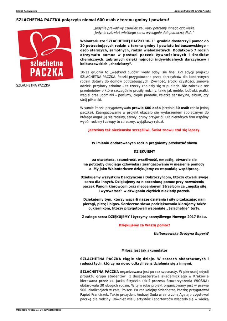 Gmina Kolbuszowa Data wydruku: 08-03-2017 19:54 SZLACHETNA PACZKA połączyła niemal 600 osób z terenu gminy i powiatu! „Jedynie prawdziwy człowiek zauważy potrzeby innego człowieka. Jedynie człowiek wielkiego serca wyciągnie doń pomocną dłoń.” Wolontariusze SZLACHETNEJ PACZKI 10- 11 grudnia dostarczyli pomoc do 20 potrzebujących rodzin z terenu gminy i powiatu kolbuszowskiego – osób starszych, samotnych, rodzin wielodzietnych. Dodatkowo 7 rodzin otrzymało pomoc w postaci paczek żywnościowych i środków chemicznych, zebranych dzięki hojności indywidualnych darczyńców i kolbuszowskich „chodziarzy”. SZLACHETNA PACZKA 10-11 grudnia to „weekend cudów” kiedy odbył się finał XVI edycji projektu SZLACHETNA PACZKA. Paczki przygotowane przez darczyńców dla konkretnych rodzin dotarły do domów potrzebujących. Żywność, środki czystości, zimowa odzież, przybory szkolne – te rzeczy znalazły się w pudłach. Nie zabrakło też przedmiotów o które szczególnie prosiły rodziny, takie jak meble, lodówki, pralki, węgiel oraz upominki – perfumy, ciepłe pantofle, książka sensacyjna, album, czy strój piłkarski. W sumie Paczki przygotowywało prawie 600 osób (średnio 30 osób robiło jedną paczkę). Zaangażowanie w projekt okazało się wydarzeniem społecznym do którego angażują się rodziny, szkoły, grupy przyjaciół. Dla niektórych firm wspólny wybór rodziny i zakupy to coroczny, wyjątkowy rytuał. Jesteśmy też nieziemsko szczęśliwi. Świat znowu stał się lepszy. W imieniu obdarowanych rodzin pragniemy przekazać słowa DZIĘKUJEMY za otwartość, szczodrość, wrażliwość, empatię, otwarcie się na potrzeby drugiego człowieka i zaangażowanie w niesienie pomocy a My jako Wolontariusze dziękujemy za wspaniałą współpracę. Dziękujemy wszystkim Darczyńcom i Dobroczyńcom, którzy otwarli swoje serca dla innych. Dziękujemy za nieocenioną pomoc przy rozwożeniu paczek Panom kierowcom oraz nieocenionym Strzelcom za „męską siłę i wytrwałość” w dźwiganiu ciężkich niekiedy paczek. Dziękujemy tym, którzy wsparli nasze działania i siły przekazując nam pierogi, pizzę i bigos. Serdeczne słowa podziękowania kierujemy także cukiernikom, którzy przygotowali wspaniałe „Szlachetne” torty. Z całego serca DZIĘKUJEMY i życzymy szczęśliwego Nowego 2017 Roku. Dziękujemy za Waszą pomoc! Kolbuszowska Drużyna SuperW Miłość jest jak akumulator SZLACHETNA PACZKA ciągle się dzieje. W sercach obdarowanych i radości tych, którzy na nowo odkryli sens dzielenia się z innymi. SZLACHETNA PACZKA organizowana jest po raz szesnasty. W pierwszej edycji projektu grupa studentów z duszpasterstwa akademickiego w Krakowie kierowana przez ks. Jacka Stryczka (dziś prezesa Stowarzyszenia WIOSNA) obdarowała 30 ubogich rodzin. W tym roku projekt organizowany jest w prawie 500 lokalizacjach w całej Polsce. Po raz kolejny Szlachetną Paczkę przygotował Papież Franciszek. Także prezydent Andrzej Duda wraz z żoną Agatą przygotował paczkę dla rodziny. Również wielu artystów i sportowców włączyło się w wielką Obrońców Pokoju 21, 36-100 Kolbuszowa 1 Gmina Kolbuszowa Data wydruku: 08-03-2017 19:54 akcję pomagania. Ludzie zaangażowani w projekt kierują się zasadą „Jeden za wszystkich, wszyscy za jednego”. Wierzą, że postępując zgodnie z nią, sprawiają, że świat zmienia się na lepsze! W SZLACHETNEJ PACZCE wciąż możesz zrobić coś dobrego, nie tylko na święta – masz wiele możliwości, żeby mądrze pomóc: Wpłać na Paczkę i spraw, że dotrzemy do kolejnych rodzin w potrzebie www.szlachetnapaczka.pl/wiecejpaczki Dołącz do Klubu WIOSNA i Przyjaciele i bądź z Paczką przez cały rok http://www.szlachetnapaczka.pl/wip Pamiętaj o nas przekazując 1% podatku– 1% na Paczkę ma moc zmieniania świata na lepsze – KRS Szlachetna Paczka to nie jedyny projekt pomocowy realizowany przez Stowarzyszenie Wiosna (więcej informacji na stronie http://www.szlachetnapaczka.pl/). W tym roku w Kolbuszowej kilkoro dzieci zostało włączone do Projektu Akademia Przyszłości – tu również jest możliwość pomagania – można ufundować indeks lub wesprzeć wpłatą działania Akademii. Obrońców Pokoju 21, 36-100 Kolbuszowa 2