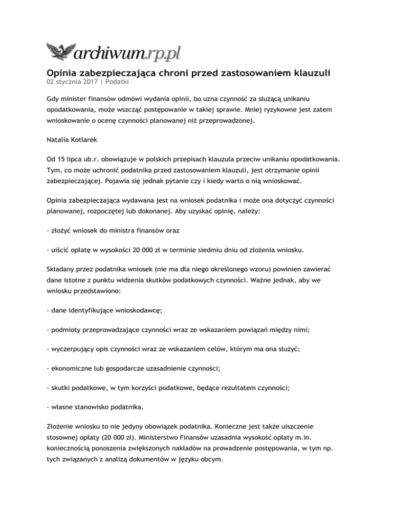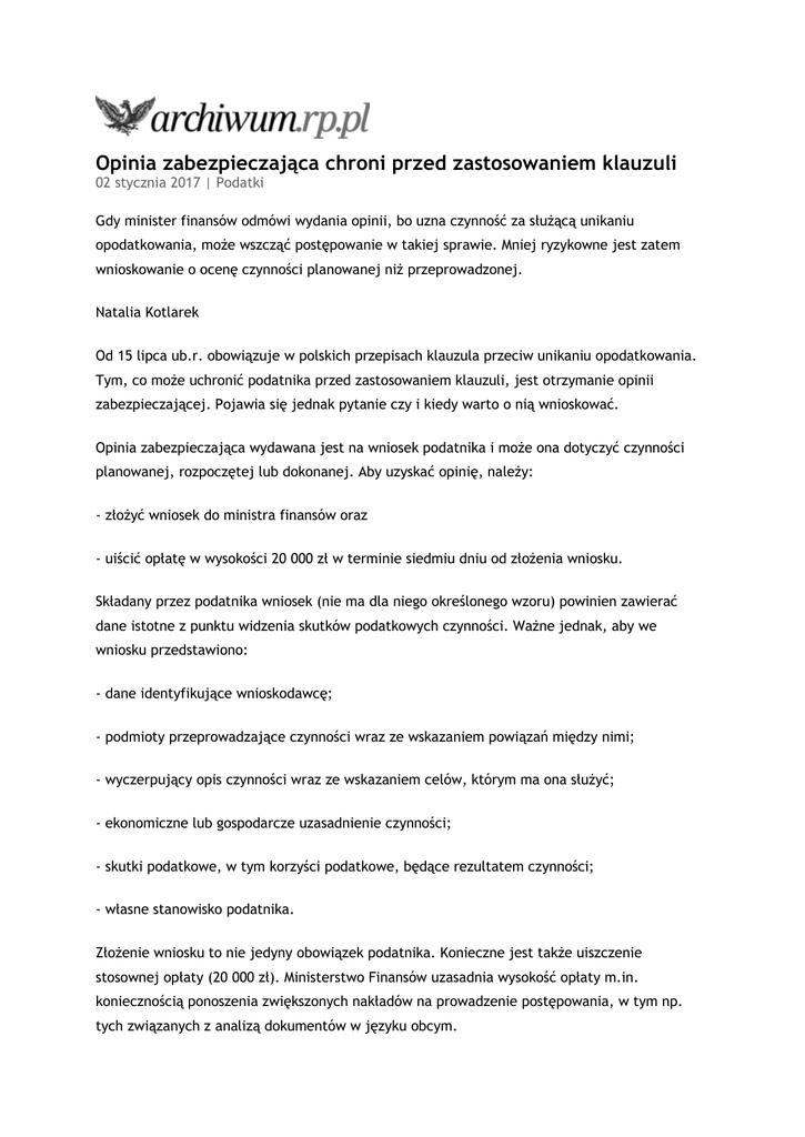 Opinia zabezpieczająca chroni przed zastosowaniem klauzuli 02 stycznia 2017 | Podatki Gdy minister finansów odmówi wydania opinii, bo uzna czynność za służącą unikaniu opodatkowania, może wszcząć postępowanie w takiej sprawie. Mniej ryzykowne jest zatem wnioskowanie o ocenę czynności planowanej niż przeprowadzonej. Natalia Kotlarek Od 15 lipca ub.r. obowiązuje w polskich przepisach klauzula przeciw unikaniu opodatkowania. Tym, co może uchronić podatnika przed zastosowaniem klauzuli, jest otrzymanie opinii zabezpieczającej. Pojawia się jednak pytanie czy i kiedy warto o nią wnioskować. Opinia zabezpieczająca wydawana jest na wniosek podatnika i może ona dotyczyć czynności planowanej, rozpoczętej lub dokonanej. Aby uzyskać opinię, należy: - złożyć wniosek do ministra finansów oraz - uiścić opłatę w wysokości 20 000 zł w terminie siedmiu dniu od złożenia wniosku. Składany przez podatnika wniosek (nie ma dla niego określonego wzoru) powinien zawierać dane istotne z punktu widzenia skutków podatkowych czynności. Ważne jednak, aby we wniosku przedstawiono: - dane identyfikujące wnioskodawcę; - podmioty przeprowadzające czynności wraz ze wskazaniem powiązań między nimi; - wyczerpujący opis czynności wraz ze wskazaniem celów, którym ma ona służyć; - ekonomiczne lub gospodarcze uzasadnienie czynności; - skutki podatkowe, w tym korzyści podatkowe, będące rezultatem czynności; - własne stanowisko podatnika. Złożenie wniosku to nie jedyny obowiązek podatnika. Konieczne jest także uiszczenie stosownej opłaty (20 000 zł). Ministerstwo Finansów uzasadnia wysokość opłaty m.in. koniecznością ponoszenia zwiększonych nakładów na prowadzenie postępowania, w tym np. tych związanych z analizą dokumentów w języku obcym. Po zapoznaniu się z wnioskiem, minister finansów musi określić czy czynności opisane przez podatnika mogą zostać uznane za unikanie opodatkowania w rozumieniu art. 119a ordynacji podatkowej. Opinia wydawana jest bowiem wyłącznie w sytuacji, gdy brak jest przesłanek do zastosowania klauzuli (nie jest wydawana opinia „negatywna" – jak to ma miejsce w przypadku interpretacji indywidualnych). W przypadku odmowy wydania opinii, podatnik ma prawo złożyć skargę do sądu administracyjnego. Wydanie opinii musi nastąpić bez zbędnej zwłoki, jednak nie później niż w terminie sześciu miesięcy od dnia otrzymania wniosku. Tak jak w przypadku interpretacji indywidualnych, opinia może jednak zostać zmieniona z urzędu, jeżeli jest ona sprzeczna z orzecznictwem Trybunału Konstytucyjnego lub Trybunału Sprawiedliwości UE. Zdaniem autorki Natalia Kotlarek, starszy konsultant ABC Tax Spółka doradztwa podatkowego Czy i kiedy warto pytać Otrzymanie opinii zabezpieczającej uniemożliwia zastosowanie klauzuli wobec podatnika (w danej sprawie). Jest zatem narzędziem ochronnym. Pojawia się jednak pytanie jakie mogą być dla podatnika konsekwencje w przypadku otrzymania odmowy wydania opinii. W takiej bowiem sytuacji minister finansów posiada kompleksową informację na temat danej czynności, którą uznaje za służącą unikaniu opodatkowania. Jednocześnie ma prawo wszcząć postępowanie w takiej sprawie, jeżeli wniosek o wydanie opinii dotyczył stanu faktycznego już zaistniałego, a nie dopiero planowanego. W konsekwencji, mniej ryzykowne dla podatnika wydaje się wnioskowanie w zakresie oceny czynności planowanej niż dokonanej.