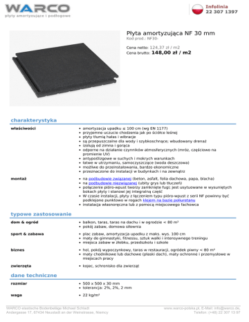 Płyta amortyzująca NF 30 mm Kod prod.: NF30Cena netto: 124,37 zł / m2 Cena brutto: 148,00 zł / m2 charakterystyka właściwości amortyzacja upadku ≤ 100 cm (wg EN 1177) przyjemne uczucie chodzenia jak po ściółce leśnej płyty tłumią hałas i wibracje są przepuszczalne dla wody i szybkoschnące; wbudowany drenaż izolują od zimna i gorąca odporne na działanie czynników atmosferycznych (mróz, częściowo na promienie UV) antypoślizgowe w suchych i mokrych warunkach łatwe w utrzymaniu, samoczyszczące (woda deszczowa) możliwe do przeinstalowania, bardzo ekonomiczne przeznaczone do instalacji w budynkach i na zewnątrz montaż na podbudowie związanej (beton, asfalt, folia dachowa, papa, blacha) na podbudowie niezwiązanej (ubity grys lub tłuczeń) połączenie pióro-wpust tworzy zamknięte fugi; jest usytuowane w wysuniętych bokach płyty i stanowi jej integralną część W czasie instalacji, płyty z łączeniem typu pióro-wpust z serii NF powinny być podklejone punktowo w rogach klejem na bazie poliuretanu instalacja własnoręczna lub z pomocą miejscowego fachowca typowe zastosowanie dom & ogród balkon, taras, taras na dachu i w ogrodzie < 80 m² pokój zabaw, domowa siłownia sport & zabawa plac zabaw, amortyzacja upadku z maks. wys. 100 cm maty do gimnastyki, fitnessu, sztuk walki i intensywnego treningu miejsca zabaw w żłobku, przedszkolu i szkole biznes hol, pokój wypoczynkowy, taras w restauracji, ogródek piwny < 80 m² maty chodnikowe lub dachowe (płaski dach), maty ochronne i przemysłowe w miejscach pracy zwierzęta kojec, schronisko dla zwierząt dane techniczne rozmiar 500 x 500 x 30 mm tolerancja: 2%, 2%, 2 mm waga 22 kg/m² WARCO elastische Bodenbeläge Michael Schladt Andergasse 17, 67434 Neustadt an der Weinstrasse, Niemcy www.warco-polska.pl, E-Mail: [email protected], Telefon: (+48) 22 307 13 97 materiał klasa palności > 90% czarny granulat oponiarski (NR/SBR) < 10% barwiony środek wiążący: poliuretan Efl (EN 13501-1) WARCO elastische Bodenbeläge Michael Schladt Andergasse 17, 67434 Neustadt an der Weinstrasse, Niemcy Powered by TCPDF (www.tcpdf.org) www.warco-polska.pl, E-Mail: [email protected], Telefon: (+48) 22 307 13 97