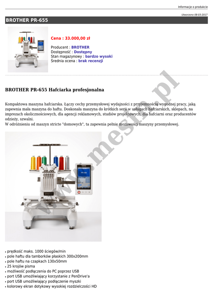 Informacje o produkcie Utworzono 08-03-2017 BROTHER PR-655 Cena : 33.000,00 zł in .p BROTHER PR-655 Hafciarka profesjonalna l Producent : BROTHER Dostępność : Dostępny Stan magazynowy : bardzo wysoki Średnia ocena : brak recenzji w w w .m es Kompaktowa maszyna hafciarska. Łączy cechy przemysłowej wydajności z przyjemnością wygodnej pracy, jaką zapewnia mała maszyna do haftu. Doskonała maszyna do krótkich serii w usługach hafciarskich, sklepach, na imprezach okolicznościowych, dla agencji reklamowych, studiów projektowych, dla hafciarni oraz producentów odzieży, szwalni. W odróżnieniu od maszyn stricte "domowych", ta zapewnia pełnię możliwości maszyny przemysłowej. ● ● ● ● ● ● ● ● prędkość maks. 1000 ściegów/min pole haftu dla tamborków płaskich 300x200mm pole haftu na czapkach 130x50mm 25 krojów pisma możliwość podłączenia do PC poprzez USB port USB umożliwiający korzystanie z PenDrive'a port USB umożliwiający podłączenie myszki kolorowy ekran dotykowy wysokiej rozdzielczości HD ● ● ● ● ● ● .m es in .p l ● możliwość edycji haftu z poziomu panela sterującego automatyczne tworzenie ramek z poziomu panela sterującego czujnik zrywu górnej i dolnej nitki pamięć wewnętrzna funkcja naprawiania haftów nawlekacz igieł oświetlenie o barwie zbliżonej do śiwatła naturalnego w w w PR-650 znakomicie nadaje się do transportu. Dzięki skromnym rozmiarom można przewozić ją na imprezy, festiwale, koncerty i w bardzo krótkim czasie przygotować do pracy. in .p l Informacje o produkcie w w w .m es Maszyna posiada duży kolorowy ekran, na którym można układać napisy korzystając z 25 różnych skalowanych fontów. Napisy można powiększać bez straty jakości. Oprócz skalowania litery można ją układać na łuku o dowolnej krzywiżnie, obracać, zmieniać gęstość ściegu, regulować odległość między literami. Jest też funkcja łączenie projektów dzięki której można projektować polskie znaki. w w w .m es in .p l Automatyczny nawlekacz nitki. Maszyna ma bardzo prosty tor nitki oraz automatyczny nawlekacz igły. Prawdopodobnie jest to najszybsza maszyna na świecie pod względem szybkości nawlekania nitek. Cecha ta w istotny sposób wpływa na wzrost wydajności pracy szczególnie w warunkach małych serii haftów. PR-650 bardzo łatwo przezbraja się z haftu płaskiego na czapki i odwrotnie. W przeciwieństwie do innych maszyn nie trzeba wymieniać płytki ściegowej, nie trzeba podnosić stopki czy zmieniać ustawienia komputera maszyny. in .p l Informacje o produkcie w w w .m es PR-650 bardzo ładnie haftuje. Szczególnie ładnie wychodzą hafty na czapkach. Prawdopodobnie jest to najszybsza maszyna na świecie pod względem szybkości zmiany konfiguracji maszyny. Cecha ta w istotny sposób wpływa na wzrost wydajności pracy szczególnie gdy często haftujemy czapki. Maszynę wyposażono również w czujnik wielkości tamborka. Nie jest zatem możliwe uderzenie igły w tamborek, co jest najczęstszą przyczyną awarii innych hafciarek. W zestawie 4 tamborki: ● ● ● ● 300mmx200mm, 180mmx130mm 100mmx100mm, 60mmx40mm Waga w opakowaniu : 55 kg Waga maszyny : 37 kg Zasilanie : 220 V -230V Wymiary : 512(W) x 589(D) x 586 (H) mm Maszyna czyta pliki : .pes , .dst, .and , .phc Maksymalne pole haftu : 200mm x 300mm Maszynę dowozimy gratis w dowolne miejsce w Polsce na miejscu przeprowadzamy szkolenie około 3 godziny . Do każdej maszyny gratis dokładamy oprogramowanie Stitch era uniwersal , zestaw startowych nici 10 szt , pamięć USB , płytę z haftami o różnorodniej tematyce . in .p es .m Filmy o maszynie : https://www.youtube.com/watch?v=o_DZeYXMKNs https://www.youtube.com/watch?v=cxLAvCiMUMA https://www.youtube.com/watch?v=-7jUAZOfNaw https://www.youtube.com/watch?v=9cjVVL1P1Lk https://www.youtube.com/watch?v=wXHAQ0MmP7g https://www.youtube.com/watch?v=J1Z8lGVoHC8 https://www.youtube.com/watch?v=Q09U9I6uVYU https://www.youtube.com/watch?v=IUjW2CaRzos https://www.youtube.com/watch?v=zdwP17AOY64 https://www.youtube.com/watch?v=N71N5iySNFg https://www.youtube.com/watch?v=bBKa4iy5GOM https://www.youtube.com/watch?v=PItEj38OaSE https://www.youtube.com/watch?v=8bCdrFa-mRo https://www.youtube.com/watch?v=i0BenXWchao https://www.youtube.com/watch?v=Zlb_80kxmII https://www.youtube.com/watch?v=K9LMReUM8AM https://www.youtube.com/watch?v=hmN_hUw4DW0 https://www.youtube.com/watch?v=jq2UXOrNu94 https://www.youtube.com/watch?v=IdQwNL87z3c https://www.youtube.com/watch?v=xpRpHOwpUcw https://www.youtube.com/watch?v=LKmtDj2xqy8 https://www.youtube.com/watch?v=tTgneXwK99w https://www.youtube.com/watch?v=tTgneXwK99w https://www.youtube.com/watch?v=7MrZT5D2zDQ l Cena maszyny 6400 euro netto, przeliczana w dniu sprzedaży według kursu NBP. http://www.nbp.pl/Kursy/KursyA.html w w w test prędkości maszyny Brother są szybsze od Janome MB-4 o 20 %: https://www.youtube.com/watch?v=rIS5LGYAndc