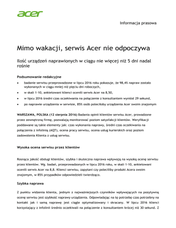 Informacja prasowa Mimo wakacji, serwis Acer nie odpoczywa Ilość urządzeń naprawionych w ciągu nie więcej niż 5 dni nadal rośnie Podsumowanie redakcyjne badanie serwisu przeprowadzone w lipcu 2016 roku pokazuje, że 98,4% napraw zostało wykonanych w ciągu mniej niż pięciu dni roboczych, w skali 1-10, ankietowani klienci ocenili serwis Acer na 8,50, w lipcu 2016 średni czas oczekiwania na połączenie z konsultantem wyniósł 29 sekund, po naprawie urządzenia w serwisie, 85% osób poleciłoby urządzenia Acer swoim znajomym WARSZAWA, POLSKA (12 sierpnia 2016) Badania opinii klientów serwisu Acer, prowadzone przez zewnętrzną firmę, pozwalają monitorować poziom satysfakcji klientów. Weryfikacji poddawane są takie elementy jak: czas wykonania naprawy, średni czas oczekiwania na połączenia z infolinią (AQT), ocena pracy serwisu, ocena usług kurierskich oraz poziom zadowolenia Klienta z usług serwisu. Wysoka ocena serwisu przez klientów Rosnąca jakość obsługi klientów, szybka i skuteczna naprawa wpływają na wysoką ocenę serwisu przez klientów. Wg. badań, przeprowadzonych w lipcu 2016 roku, w skali 1-10, ankietowani ocenili serwis Acer na 8,8. Klienci serwisu, zapytani czy poleciliby produkt Acera swoim znajomym, w 85% przypadków odpowiedzieli twierdząco. Szybka naprawa Z punktu widzenia klienta, jednym z najważniejszych czynników wpływających na pozytywną ocenę serwisu jest szybkość naprawy urządzenia. Odpowiadając na tę potrzebę czas potrzebny na kontakt jak i samą naprawę jest ciągle optymalizowany i skracany. W lipcu 2016 klienci korzystający z infolinii średnio oczekiwali na połączenie z konsultantem krócej niż 30 sekund. Z kolei 98,4% urządzeń spędza w serwisie mniej niż 5 dni roboczych. Tak krótki czas naprawy jest możliwy przede wszystkim dzięki dostępności części zamiennych, których 99,4% znajduje się na miejscu, tj. w centrum logistycznym we Wrocławiu. O firmie Acer Założona w roku 1976 firma Acer prowadzi działalność w dziedzinie technologii informatycznych i komunikacyjnych oraz związanych z nimi usług. Swoją uwagę koncentruje na pracach badawczo-rozwojowych, projektowaniu, marketingu oraz sprzedaży innowacyjnych produktów ułatwiających życie, a także na zapewnianiu pomocy technicznej. Oferta produktów Acer obejmuje komputery PC, monitory, projektory, serwery, tablety i smartfony, a także akcesoria. Firma opracowuje również rozwiązania chmurowe, łącząc Internet przedmiotów. Acer zatrudnia 7000 pracowników i zajmuje 4. miejsce na świecie w ogólnym segmencie komputerów osobistych (IDC 2014). W roku 2014 przychody firmy wyniosły 10,39 miliarda USD. Więcej informacji na stronie www.acer.com. Kontakt dla mediów WĘC Public Relations Jan Trzupek Tel: +48 730 954 282 Email: [email protected] ©2016 Acer. Wszelkie prawa zastrzeżone. Acer oraz logo Acer są zarejestrowanymi znakami towarowymi Acer Inc. Pozostałe znaki towarowe, zarejestrowane znaki towarowe i znaki usługowe, zarówno widoczne, jak i niewidoczne, stanowią własność swoich właścicieli. 2