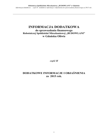 Robotnicza Spółdzielnia Mieszkaniowa „BUDOWLANI” w Gdańsku Informacja dodatkowa - część II - dodatkowe informacje i objaśnienia do sprawozdania finansowego za 2015 rok . INFORMACJA DODATKOWA do sprawozdania finansowego Robotniczej Spółdzielni Mieszkaniowej „BUDOWLANI” w Gdańsku Oliwie część II DODATKOWE INFORMACJE I OBJAŚNIENIA za 2015 rok. 1 Robotnicza Spółdzielnia Mieszkaniowa „BUDOWLANI” w Gdańsku Informacja dodatkowa - część II - dodatkowe informacje i objaśnienia do sprawozdania finansowego za 2015 rok . I. Część - informacje i objaśnienia do bilansu. 1. Szczegółowy zakres zmian wartości grup rodzajowych środków trwałych, wartości niematerialnych i prawnych oraz inwestycji długoterminowych, zawierający stan tych aktywów na początek roku obrotowego, zwiększenia i zmniejszenia z tytułu: aktualizacji wartości, nabycia, przemieszczenia wewnętrznego oraz stan końcowy a dla majątku amortyzowanego - podobne przedstawienie stanów i tytułów zmian dotychczasowej amortyzacji lub umorzenia, przedstawiono w tabeli stanowiącej załącznik nr 1, do informacji dodatkowej. 2. W roku obrotowym wystąpiły zmiany w wartości powierzchni gruntów oddanych spółdzielni w wieczyste użytkowanie przez organy samorządowe .Na podstawie aktu notarialnego - umowa sprzedaży , spółdzielnia zdjęła z ewidencji wieczystego użytkowania grunt o powierzchni 1.155 m². Aktualne stany powierzchni gruntów i ich wartości przedstawiono w poniższej tabeli: Lp. Wyszczególnienie 1 2 3 Gmina Gdańsk – osiedle dolne Gmina Gdańsk – osiedle górne Gmina Sopot RAZEM Stan na początek roku Stan na koniec roku pow. (m2) 27 125,46 wartość (zł) 3 006 168,90 pow. (m2) 25 970,46 wartość (zł) 2 957 658,90 9 027,74 1 020 132,49 9 027,74 1 020 132,49 0,00 0,00 0,00 0,00 36 153,20 4 026 301,39 34 998,20 3 977 791,39 3. W roku sprawozdawczym na podstawie aktów notarialnych o ustanowienie odrębnej własności lokali mieszkalnych spółdzielnia zdjęła z ewidencji gruntów własnych udział właścicieli lokali mieszkalnych w nieruchomościach gruntowych spółdzielni o powierzchni 703,63 m2.. Łącznie w roku sprawozdawczym powierzchnia gruntów własnych Spółdzielni zmniejszyła się o 703,63 m ² Aktualne stany powierzchni i wartości gruntów własnych przedstawiono w poniższej tabeli: 2 Robotnicza Spółdzielnia Mieszkaniowa „BUDOWLANI” w Gdańsku Informacja dodatkowa - część II - dodatkowe informacje i objaśnienia do sprawozdania finansowego za 2015 rok . Lp. Wyszczególnienie 1 2 3 Gmina Gdańsk – osiedle dolne Gmina Gdańsk – osiedle górne Gmina Sopot RAZEM Stan na początek roku Stan na koniec roku pow. (m2) 24 633,08 wartość (zł) 7 407 996,36 pow. (m2) 24 315,66 wartość (zł) 7 327 384,94 20 348,42 5 093 359,47 19 998,18 4 984 450,08 438,78 1 007 854,33 402,81 925 240,51 45 420,28 13 509 210,16 44 716,65 13 237 075,53 4. Aktualne stany powierzchni i wartości udziału w gruncie właścicieli mieszkań, garaży i lokali użytkowych, którzy ustanowili odrębną własność lokali, przedstawiono w poniższej tabeli: Lp. Wyszczególnienie 1 2 3 Gmina Gdańsk – osiedle dolne Gmina Gdańsk – osiedle górne Gmina Sopot RAZEM Stan na początek roku Stan na koniec roku pow. (m2) 29 965,46 wartość (zł) 8 557 966,33 pow. (m2) 30 282,88 wartość (zł) 8 638 577,75 20 680,84 5 914 112,67 21 031,08 6 023 022,06 120,22 276 152,11 156,19 358 765,93 50 766,52 14 748 231,11 51 470,15 15 020 365,74 5. W bilansie spółdzielni w roku obrotowym nie występują wartości nie amortyzowanych lub nie umarzanych przez spółdzielnię środków trwałych, używanych na podstawie umów najmu, dzierżawy i innych umów o podobnym charakterze, w tym umów leasingu. 6. W bilansie spółdzielni w roku obrotowym nie występują zobowiązania wobec budżetu państwa lub jednostek samorządu terytorialnego z tytułu uzyskania prawa własności budynków i budowli. 7. Kapitał (fundusz) podstawowy w kwocie – 48 823 913,52 - wykazany w pasywach bilansu w poz. A. I (81), stanowi fundusz udziałowy spółdzielni, fundusze wkładów mieszkaniowych i budowlanych skorygowany o fundusz z aktualizacji aktywów i pasywów oraz fundusz zaliczek na wkłady budowlane i jest w 100% własnością członków 3 Robotnicza Spółdzielnia Mieszkaniowa „BUDOWLANI” w Gdańsku Informacja dodatkowa - część II - dodatkowe informacje i objaśnienia do sprawozdania finansowego za 2015 rok . spółdzielni. Kapitał (fundusz) zapasowy w kwocie – 19 575 176,58 zł wykazany w pasywach w poz. A IV (84), stanowi fundusz zasobowy spółdzielni. 8. Zmiany stanu kapitału własnego - funduszy spółdzielni - wykazywanych w poz. A (w. 80) pasywów bilansu - na początek i na koniec roku obrotowego, przedstawia poniższa tabela: Lp. I. Rodzaj funduszu Z m i a n y Zwiększenia Stan na koniec zmniejszenia roku – BZ FUNDUSZE PODSTAWOWE I. 1. Fundusz udziałowy I. 2. Fundusz wkładów zaliczkowych I. 3. Fundusz wkładów mieszkaniowych I. 4. Fundusz wkładów budowlanych I. 5. Fundusz aktualizacji aktywów i pasywów. I. 6. Fundusz wolnych śr. obrotowych – zbycie lokali mieszkalnych II. Stan na początek roku – BO Razem FUNDUSZ ZAPASOWY II. 1. Fundusz zasobowy II. 2. Fund zasobowy – wolne środki finansowe Razem VIII. Zysk (strata) netto OGÓŁEM A. FUNDUSZE WŁASNE 390 103,72 8 550,00 4 900,00 393 753,72 0,00 1 450,90 1 450,90 0,00 1 274 574,89 424 653,56 505 564,39 1 193 664,06 51 053 772,59 850 845,07 3 048 286,44 48 856 331,22 - 1 635 318,27 237 001,27 237 167,35 -1 635 484,35 5 162,25 10 486,62 0,00 15 648,87 51 088 295,18 1 532 987,42 3 797 369,08 48 823 913,52 19 602 618,87 106 798,03 484 672,27 19 224 744,63 350 431,95 0,00 0,00 350 431,95 19 953 050,82 106 798,03 484 672,27 19 575 176,58 357 038,88 711 845,24 357 038,88 711 845,24 71 398 384,88 2 351 630,69 4 639 080,23 69 110 935,34 4 Robotnicza Spółdzielnia Mieszkaniowa „BUDOWLANI” w Gdańsku Informacja dodat