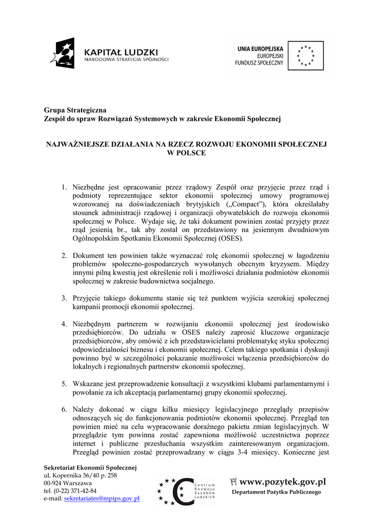 Grupa Strategiczna Zespół do spraw Rozwiązań Systemowych w zakresie Ekonomii Społecznej NAJWAśNIEJSZE DZIAŁANIA NA RZECZ ROZWOJU EKONOMII SPOŁECZNEJ W POLSCE 1. Niezbędne jest opracowanie przez rządowy Zespół oraz przyjęcie przez rząd i podmioty reprezentujące sektor ekonomii społecznej umowy programowej wzorowanej na doświadczeniach brytyjskich („Compact”), która określałaby stosunek administracji rządowej i organizacji obywatelskich do rozwoju ekonomii społecznej w Polsce. Wydaje się, Ŝe taki dokument powinien zostać przyjęty przez rząd jesienią br., tak aby został on przedstawiony na jesiennym dwudniowym Ogólnopolskim Spotkaniu Ekonomii Społecznej (OSES). 2. Dokument ten powinien takŜe wyznaczać rolę ekonomii społecznej w łagodzeniu problemów społeczno-gospodarczych wywołanych obecnym kryzysem. Między innymi pilną kwestią jest określenie roli i moŜliwości działania podmiotów ekonomii społecznej w zakresie budownictwa socjalnego. 3. Przyjęcie takiego dokumentu stanie się teŜ punktem wyjścia szerokiej społecznej kampanii promocji ekonomii społecznej. 4. Niezbędnym partnerem w rozwijaniu ekonomii społecznej jest środowisko przedsiębiorców. Do udziału w OSES naleŜy zaprosić kluczowe organizacje przedsiębiorców, aby omówić z ich przedstawicielami problematykę styku społecznej odpowiedzialności biznesu i ekonomii społecznej. Celem takiego spotkania i dyskusji powinno być w szczególności pokazanie moŜliwości włączenia przedsiębiorców do lokalnych i regionalnych partnerstw ekonomii społecznej. 5. Wskazane jest przeprowadzenie konsultacji z wszystkimi klubami parlamentarnymi i powołanie za ich akceptacją parlamentarnej grupy ekonomii społecznej. 6. NaleŜy dokonać w ciągu kilku miesięcy legislacyjnego przeglądy przepisów odnoszących się do funkcjonowania podmiotów ekonomii społecznej. Przegląd ten powinien mieć na celu wypracowanie doraźnego pakietu zmian legislacyjnych. W przeglądzie tym powinna zostać zapewniona moŜliwość uczestnictwa poprzez internet i publiczne przesłuchania wszystkim zainteresowanym organizacjom. Przegląd powinien zostać przeprowadzany w ciągu 3-4 miesięcy. Konieczne jest Sekretariat Ekonomii Społecznej ul. Kopernika 36/40 p. 258 00-924 Warszawa tel. (0-22) 371-42-84 e-mail: [email protected] Departament PoŜytku Publicznego uchwalenie przez parlament tych doraźnych i w zasadzie juŜ wstępnie rozpoznanych zmian legislacyjnych najpóźniej w IV kwartale br. 7. W nieco dłuŜszym okresie 6-9 miesięcy powinny zostać dokończone prace na projektem ustawy o przedsiębiorczości społecznej, tak aby stał się one przedmiotem prac parlamentarnych najpóźniej z początkiem 2010 r. 8. Problematyka ekonomii społecznej powinna zostać wkomponowana w jeden z priorytetów polskiej prezydencji w Unii Europejskiej w 2011 r. Priorytet ten mógłby dotyczyć zagadnienia „społecznych innowacji” i odnosić się do takich kwestii jak: walka z ubóstwem, migracje oraz właśnie ekonomia społeczna. W tym ostatnim przypadku merytoryczną podstawę inicjatywy będzie stanowić Strategia Rozwoju Ekonomii Społecznej. Pomysł tej inicjatywy powinien jak najszybciej zostać zasygnalizowany w UKIE oraz MSZ. 9. Problematyka ekonomii społecznej powinna stać się równieŜ elementem ustanowionego na 2010 r. przez UE "Europejskiego Roku Walki z Ubóstwem i Wykluczeniem Społecznym". W ramach krajowych priorytetów realizowanych przez Polskę naleŜałoby wyeksponować rolę ekonomii społecznej w działaniach na rzecz aktywnej integracji. 10. Wskazane jest przygotowanie krytycznego analitycznego raportu o przedsiębiorczości społecznej w Polsce i jego regionalnych edycji. Przygotowanie takiego raportu powinno być okazją do wypracowania zestawu wskaźników ewaluacji ekonomii społecznej. Taki raport powinien spełnić równocześnie funkcję raportu ewaluacyjnego realizacji dotychczasowych programów i projektów wspierania ekonomii społecznej. Stanowić zarazem zaląŜek powołania Obserwatorium Ekonomii Społecznej w Polsce. 11. Pilnie powinien zostać przeprowadzony przegląd krajowych i regionalnych projektów systemowych odnoszących się do ekonomii społecznej, pod kątem ich spójności i istotności dla rozwoju ekonomii społecznej w Polsce. Niezbędna jest przy tym ewaluacja dostępu podmiotów ekonomii społecznej do środków unijnych i wykorzystania przez nie tych środków, czym zająć się tym powinna Grupa Finansowa. 12. Do końca 2009 r. - przy wykorzystaniu projektu systemowego CRZL – powinny powstać krajowa i regionalne sieci ośrodków wsparcia ekonomii społecznej. Wszystkie jednostki tworzące tę sieć powinny uzyskać odpowiednią akredytację, która powinna być weryfikowana corocznie na podstawie zewnętrznego audytu. 13. Odpowiedni projekt systemowy powinien takŜe posłuŜyć sfinansowaniu kilku duŜych przedsięwzięć syntetyzujących dorobek wielu wcześniejszych rozproszonych Sekretariat Ekonomii Społecznej ul. Kopernika 36/40 p. 258 00-924 Warszawa tel. (0-22) 371-42-84 e-mail: [email protected] Departament PoŜytku Publicznego projektów wykonanych przez wiele róŜnych organizacji i ich partnerstw. Dotyczy to między innymi zagadnienia audytu społecznego czy funduszy ekonomii społecznej. 14. Do końca br. naleŜy stworzyć koncepcję krótkich kursów przygotowujących do prowadzenia podmiotów es/gs i szczegółową koncepcję Biblioteki Ekonomii Społecznej. Grupa edukacyjna we współpracy z MEN i CODN powinna dąŜyć do przeprowadzenia w 2010 pilotaŜowego szkolenia dla nauczycieli/konsultantów es, a takŜe uruchomienia konkursu dla szkół o tematyce es. Grupa Edukacyjna po przeprowadzeniu analiz wstępnych i przeglądzie dostępnych portali poświęconych gs/es przygotuje rekomendację dotyczącą ewentualnej konieczności tworzenia krajowej Platformy Edukacyjnej Ekonomii Społecznej, która stanowiłaby nowoczesny mechanizm 