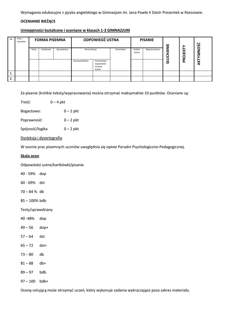 Wymagania edukacyjne z języka angielskiego w Gimnazjum im. Jana Pawła II Sióstr Prezentek w Rzeszowie. OCENIANIE BIEŻĄCE Umiejętności kształcone i oceniane w klasach 1-3 GIMNAZJUM FORMA PISEMNA Testy Kartkówki ODPOWIEDŹ USTNA Sprawdziany Komunikacja Sytuacje/słówka Prezentacje/ wypowiedzi na dany temat Gramatyka PISANIE Krótkie teksty Wypracowania 1. 2. Za pisanie (krótkie teksty/wypracowania) można otrzymać maksymalnie 10 punktów. Oceniane są: Treść: 0 – 4 pkt Bogactowo: 0 – 2 pkt Poprawność: 0 – 2 pkt Spójność/logika 0 – 2 pkt Dysleksja i dysortografia W ocenie prac pisemnych uczniów uwzględnia się opinie Poradni Psychologiczno-Pedagogicznej. Skala ocen Odpowiedzi ustne/kartkówki/pisanie 40 - 59% dop 60 - 69% dst 70 – 84 % db 85 – 100% bdb Testy/sprawdziany 40 -48% dop 49 – 56 dop+ 57 – 64 dst 65 – 72 dst+ 73 – 80 db 81 – 88 db+ 89 – 97 bdb 97 – 100 bdb+ Ocenę celującą może otrzymać uczeń, który wykonuje zadania wykraczające poza zakres materiału. AKTYWNOŚĆ Imię i nazwisko PROJEKTY . SŁUCHANIE Lp Poprawa oceny lub nieobecność na sprawdzianie/kartkówce Sprawdzian/kartkówkę można poprawić w terminie ustalonym przez nauczyciela najpóźniej w terminie 2 tygodni od daty jego oddania. Formę poprawy określa nauczyciel. Osoby nieobecne piszą zaległy sprawdzian/zaległą kartkówkę w terminie podanym przez nauczyciela OCENA PÓŁROCZNA I ROCZNA Ocena półroczna i roczna jest średnią ważoną ocen cząstkowych. Na ocenę półroczną i roczną mają wpływ: a. Uzyskane oceny cząstkowe Ocena : Ze sprawdzianu Z projektu długoterminowego Z projektu krótkoterminowego (do dwóch tygodni) Z odpowiedzi ustnej Z pisania Z kartkówki Za aktywność Za zadanie Z prac dodatkowych np. lekturki, referaty Za osiągnięcia w konkursach/olipmiadach Waga oceny razy 3 razy 3 razy 2 razy 2 razy 2 razy 2 razy 1 razy 1 razy 1 od 3 do 6 razy w zależności od rangi konkursu b. Frekwencja ucznia na zajęciach c. Aktywność na lekcjach d. Wkład pracy, wysiłek wkładany w opanowanie materiału e. Wykonywanie prac dodatkowych f. Aktywny i regularny udział w kołach zainteresowań na warunkach określonych przez prowadzącego nauczyciela g. Osiągnięcia w konkursach i olimpiadach UZYSKANIE WYŻSZEJ NIŻ PRZEWIDYWANA ROCZNEJ OCENY KLASYFIKACYJNEJ Uczeń może uzyskać ocenę wyższą niż przewidywana (najwyżej o jeden stopień) jeżeli. a. napisze w terminie ustalonym przez nauczyciela sprawdzian z materiału określonego przez nauczyciela i uzyska z niego ocenę, która nie obniży jego średniej ważonej (dotyczy uczniów, którzy nie mają oceny ze sprawdzianu w półroczu) b. napisze test obejmujący zakres materiału od początku roku i uzyska z tego testu ocenę wyższą niż przewidywana (dotyczy wyjątkowych sytuacji np. długa nieobecność w szkole spowodowana chorobą) c. brał aktywny i regularny udział w kołach zainteresowań na warunkach określonych przez prowadzącego nauczyciela ( d. otrzymał tytuł laureata lub finalisty Konkursu Kuratoryjnego Języka Angielskiego lub Olimpiady Języka Angielskiego dla Gimnazjalistów