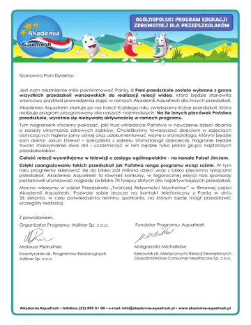 Szanowna Pani Dyrektor, Jest nam niezmiernie miło poinformować Panią, iż Pani przedszkole zostało wybrane z grona wszystkich przedszkoli warszawskich do realizacji relacji wideo, która będzie stanowiła wzorcowy przykład prowadzenia zajęć w ramach Akademii Aquafresh dla innych przedszkoli. Akademia Aquafresh startuje po raz trzeci! Każdego roku zwiększamy liczbę przedszkoli, która realizuje program przygotowany dla naszych najmłodszych. Na tle innych placówek Państwa przedszkole, wyróżnia się niebywałą aktywnością w ramach programu. Tym nagraniem chcemy pokazać, jaki trud wkładacie Państwo w nauczenie dzieci dbania o zasady utrzymania zdrowych ząbków. Chcielibyśmy towarzyszyć dzieciom w zajęciach dotyczących higieny jamy ustnej oraz udokumentować wizytę u stomatologa, którym będzie sam doktor Jakub Dziewit – specjalista z zakresu stomatologii dziecięcej. Nagranie będzie trwało maksymalnie dwa dni i uczestniczyć w nim będzie tylko jedna grupa najstarszych przedszkolaków. Całość relacji wyemitujemy w telewizji o zasięgu ogólnopolskim - na kanale Polsat JimJam. Dzięki zaangażowaniu takich przedszkoli jak Państwa ranga programu wciąż rośnie. W tym roku pragniemy skierować się do blisko pół miliona dzieci wraz z blisko pięcioma tysiącami przedszkoli. Akademia Aquafresh to również konkursy, w tegorocznej edycji nasi sponsorzy postanowili ufundować nagrody za blisko 70 tysięcy złotych dla najaktywniejszych przedszkoli. Mocno wierzymy w udział Przedszkola „Twórczej Aktywności Muchomor” w filmowej części Akademii Aquafresh. Pozwolę sobie jeszcze na kontakt telefoniczny z Panią w dniu 26 sierpnia, w celu potwierdzenia terminu spotkania, na którym będę mógł przedstawić szczegóły realizacji. Z poważaniem, Organizator Programu: Adliner Sp. z o.o. Fundator Programu: Aquafresh Mateusz Pietruliński Małgorzata Michałków Koordynator ds. Programów Edukacyjnych Adliner Sp. z o.o Kierownik ds. Medycznych i Relacji Zewnętrznych GlaxoSmithKline Consumer Healthcare Sp. z o.o.