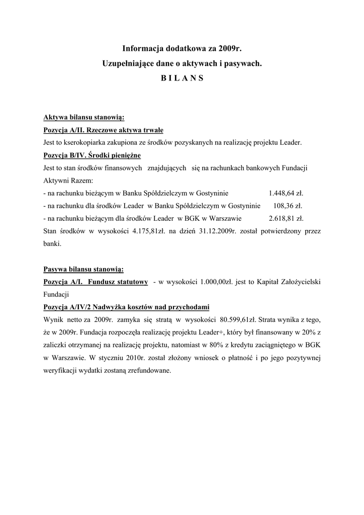 Informacja dodatkowa za 2009r. Uzupełniające dane o aktywach i pasywach. BILANS Aktywa bilansu stanowią: Pozycja A/II. Rzeczowe aktywa trwałe Jest to kserokopiarka zakupiona ze środków pozyskanych na realizację projektu Leader. Pozycja B/IV. Środki pieniężne Jest to stan środków finansowych znajdujących się na rachunkach bankowych Fundacji Aktywni Razem: - na rachunku bieżącym w Banku Spółdzielczym w Gostyninie - na rachunku dla środków Leader w Banku Spółdzielczym w Gostyninie - na rachunku bieżącym dla środków Leader w BGK w Warszawie 1.448,64 zł. 108,36 zł. 2.618,81 zł. Stan środków w wysokości 4.175,81zł. na dzień 31.12.2009r. został potwierdzony przez banki. Pasywa bilansu stanowią: Pozycja A/I. Fundusz statutowy - w wysokości 1.000,00zł. jest to Kapitał Założycielski Fundacji Pozycja A/IV/2 Nadwyżka kosztów nad przychodami Wynik netto za 2009r. zamyka się stratą w wysokości 80.599,61zł. Strata wynika z tego, że w 2009r. Fundacja rozpoczęła realizację projektu Leader+, który był finansowany w 20% z zaliczki otrzymanej na realizację projektu, natomiast w 80% z kredytu zaciągniętego w BGK w Warszawie. W styczniu 2010r. został złożony wniosek o płatność i po jego pozytywnej weryfikacji wydatki zostaną zrefundowane. RACHUNEK WYNIKÓW Na pozycję A. Przychody z działalności statutowej (w PLN) składają się: Poz. A/2 „Inne przychody określone statutem oraz dotacje i subwencje” 111.124,46 w tym: 1. Dotacje z Urzędu Marszałkowskiego - Mazowieckie tradycje Chopinowskie . - dotacja na Program LEADER - Sztuka zaczarowana muzyką – Lucień 2009 - Mazowieckie spotkania 2009 - Festiwal Folkloru i Kultury Ziemi Kujawskiej i Mazowieckiej 2. Wsparcie działalności Fundacji przez SGTPG w Łącku 3. Darowizna z Banku Spółdzielczego w Gostyninie 4. Zysk za 2008r. przeksięgowany na przychody statutowe 101.483,60 w tym: 8.000,00 26.483,60 9.000,00 8.000,00 50.000,00 7.000,00 500,00 2.140,86 Poz. B. „Koszty realizacji zadań statutowych” 131.701,83 1. Program LEADER 56.686,79 w tym: 1. Informowanie o obszarze objętym LSR 23.099,79 2. Szkolenia pracowników LGD, członków zarządu LGD oraz członków organów decyzyjnych LGD 13.131,80 3. Realizacja wydarzeń promocyjnych i kulturalnych 4. Aktywizowanie społeczności lokalnej 14.249,35 6.205,85 2. Mazowieckie tradycje Chopinowskie 8.000,00 3. Sztuka zaczarowana muzyką – Lucień 2009 9.000,00 4. Mazowieckie spotkania 2009 8.009,70 5. Festiwal Folkloru i Kultury Ziemi Kujawskiej i Mazowieckiej 50.005,34 Na pozycję D. „Koszty administracyjne” składają się: Razem koszty administracyjne 60.072,72 1. Wynagrodzenia i inne świadczenia na rzecz pracowników 25.023,92 2. Usługi obce (telefon, czynsz, utrzymanie serwera wirtualnego, doradztwo prawne 4.215,00 3. Materiały i wyposażenie (szafy, krzesła, fotele biurowe, materiały biurowe 25.660,49 2 4. Delegacje pracowników 2.668,86 5. Usługi bankowe 1.048,51 6. Amortyzacja 235,10 7. Pozostałe koszty 1.220,84 Na pozycję G. „Przychody finansowe” składają się: Odsetki od środków na bieżącym rachunku bankowym 50,48 W związku z powstałą stratą w wysokości 80.599,61zł. związaną z realizacją Projektu Leader wnioskuję o pozostawienie jej do rozliczenia w 2010r. Łąck, 10.03.2010r. Podpis osoby sporządzającej Podpisy członków Zarządu 3