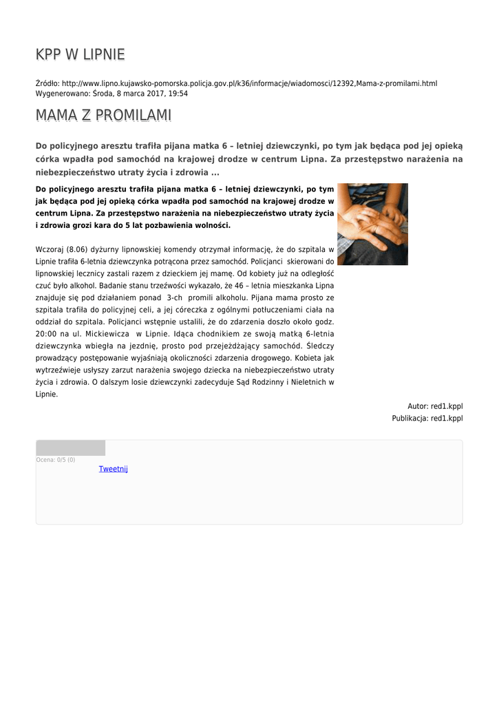 KPP W LIPNIE Źródło: http://www.lipno.kujawsko-pomorska.policja.gov.pl/k36/informacje/wiadomosci/12392,Mama-z-promilami.html Wygenerowano: Środa, 8 marca 2017, 19:54 MAMA Z PROMILAMI Do policyjnego aresztu trafiła pijana matka 6 – letniej dziewczynki, po tym jak będąca pod jej opieką córka wpadła pod samochód na krajowej drodze w centrum Lipna. Za przestępstwo narażenia na niebezpieczeństwo utraty życia i zdrowia ... Do policyjnego aresztu trafiła pijana matka 6 – letniej dziewczynki, po tym jak będąca pod jej opieką córka wpadła pod samochód na krajowej drodze w centrum Lipna. Za przestępstwo narażenia na niebezpieczeństwo utraty życia i zdrowia grozi kara do 5 lat pozbawienia wolności. Wczoraj (8.06) dyżurny lipnowskiej komendy otrzymał informację, że do szpitala w Lipnie trafiła 6-letnia dziewczynka potrącona przez samochód. Policjanci skierowani do lipnowskiej lecznicy zastali razem z dzieckiem jej mamę. Od kobiety już na odległość czuć było alkohol. Badanie stanu trzeźwości wykazało, że 46 – letnia mieszkanka Lipna znajduje się pod działaniem ponad 3-ch promili alkoholu. Pijana mama prosto ze szpitala trafiła do policyjnej celi, a jej córeczka z ogólnymi potłuczeniami ciała na oddział do szpitala. Policjanci wstępnie ustalili, że do zdarzenia doszło około godz. 20:00 na ul. Mickiewicza w Lipnie. Idąca chodnikiem ze swoją matką 6-letnia dziewczynka wbiegła na jezdnię, prosto pod przejeżdżający samochód. Śledczy prowadzący postępowanie wyjaśniają okoliczności zdarzenia drogowego. Kobieta jak wytrzeźwieje usłyszy zarzut narażenia swojego dziecka na niebezpieczeństwo utraty życia i zdrowia. O dalszym losie dziewczynki zadecyduje Sąd Rodzinny i Nieletnich w Lipnie. Autor: red1.kppl Publikacja: red1.kppl Ocena: 0/5 (0) Tweetnij
