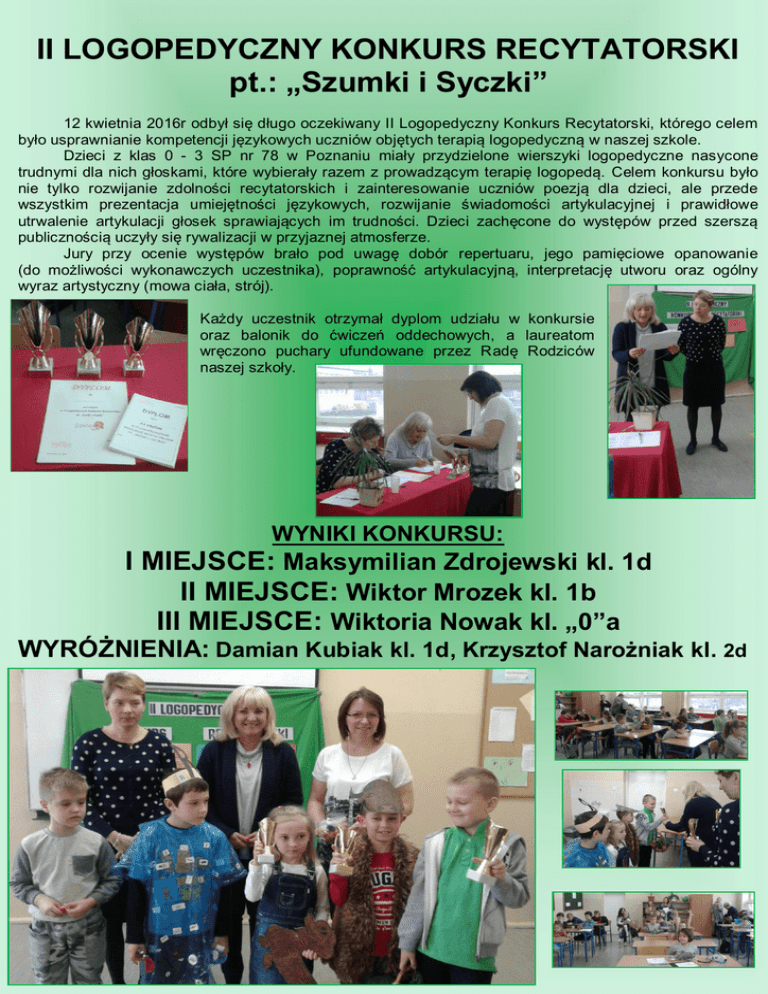 II LOGOPEDYCZNY KONKURS RECYTATORSKI pt.: „Szumki i Syczki” 12 kwietnia 2016r odbył się długo oczekiwany II Logopedyczny Konkurs Recytatorski, którego celem było usprawnianie kompetencji językowych uczniów objętych terapią logopedyczną w naszej szkole. Dzieci z klas 0 - 3 SP nr 78 w Poznaniu miały przydzielone wierszyki logopedyczne nasycone trudnymi dla nich głoskami, które wybierały razem z prowadzącym terapię logopedą. Celem konkursu było nie tylko rozwijanie zdolności recytatorskich i zainteresowanie uczniów poezją dla dzieci, ale przede wszystkim prezentacja umiejętności językowych, rozwijanie świadomości artykulacyjnej i prawidłowe utrwalenie artykulacji głosek sprawiających im trudności. Dzieci zachęcone do występów przed szerszą publicznością uczyły się rywalizacji w przyjaznej atmosferze. Jury przy ocenie występów brało pod uwagę dobór repertuaru, jego pamięciowe opanowanie (do możliwości wykonawczych uczestnika), poprawność artykulacyjną, interpretację utworu oraz ogólny wyraz artystyczny (mowa ciała, strój). Każdy uczestnik otrzymał dyplom udziału w konkursie oraz balonik do ćwiczeń oddechowych, a laureatom wręczono puchary ufundowane przez Radę Rodziców naszej szkoły. WYNIKI KONKURSU: I MIEJSCE: Maksymilian Zdrojewski kl. 1d II MIEJSCE: Wiktor Mrozek kl. 1b III MIEJSCE: Wiktoria Nowak kl. „0”a WYRÓŻNIENIA: Damian Kubiak kl. 1d, Krzysztof Narożniak kl. 2d ORGANIZATORZY KONKURSU: Anna Szczepaniak Małgorzata Pogorzelska