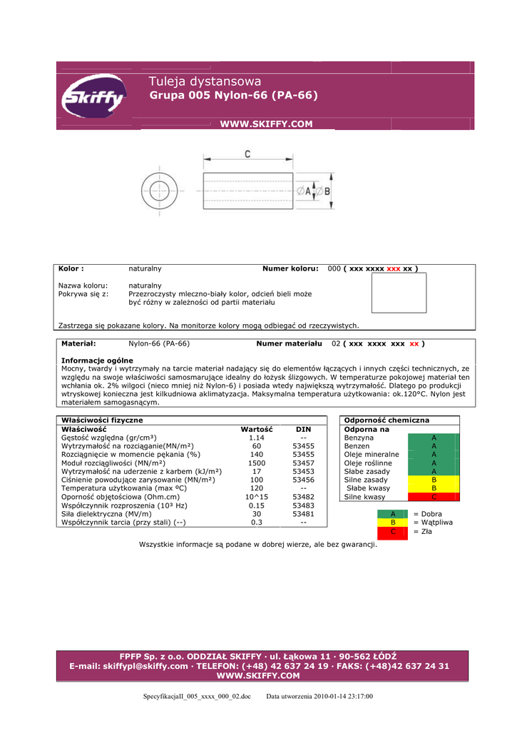 Tuleja dystansowa Grupa 005 Nylon-66 (PA-66) WWW.SKIFFY.COM Kolor : naturalny Numer koloru: Nazwa koloru: Pokrywa si z: naturalny Przezroczysty mleczno-bia y kolor, odcie bieli mo e by ró ny w zale no ci od partii materia u 000 ( xxx xxxx xxx xx ) Zastrzega si pokazane kolory. Na monitorze kolory mog odbiega od rzeczywistych. Materia : Nylon-66 (PA-66) Numer materia u 02 ( xxx xxxx xxx xx ) Informacje ogólne Mocny, twardy i wytrzyma y na tarcie materia nadaj cy si do elementów cz cych i innych cz ci technicznych, ze wzgl du na swoje w ciwo ci samosmaruj ce idealny do ysk lizgowych. W temperaturze pokojowej materia ten wch ania ok. 2% wilgoci (nieco mniej ni Nylon-6) i posiada wtedy najwi ksz wytrzyma . Dlatego po produkcji wtryskowej konieczna jest kilkudniowa aklimatyzacja. Maksymalna temperatura u ytkowania: ok.120°C. Nylon jest materia em samogasn cym. ciwo ci fizyczne ciwo sto wzgl dna (gr/cm³) Wytrzyma na rozci ganie(MN/m²) Rozci gni cie w momencie p kania (%) Modu rozci gliwo ci (MN/m²) Wytrzyma na uderzenie z karbem (kJ/m²) Ci nienie powoduj ce zarysowanie (MN/m²) Temperatura u ytkowania (max ºC) Oporno obj to ciowa (Ohm.cm) Wspó czynnik rozproszenia (10³ Hz) Si a dielektryczna (MV/m) Wspó czynnik tarcia (przy stali) (--) Warto 1.14 60 140 1500 17 100 120 10^15 0.15 30 0.3 DIN -53455 53455 53457 53453 53456 -53482 53483 53481 -- Odporno chemiczna Odporna na Benzyna Benzen Oleje mineralne Oleje ro linne abe zasady Silne zasady S abe kwasy Silne kwasy A B C A A A A A B B C = Dobra = W tpliwa = Za Wszystkie informacje s podane w dobrej wierze, ale bez gwarancji. FPFP Sp. z o.o. ODDZIA SKIFFY · ul. kowa 11 · 90-562 ÓD E-mail: [email protected] · TELEFON: (+48) 42 637 24 19 · FAKS: (+48)42 637 24 31 WWW.SKIFFY.COM SpecyfikacjaII_005_xxxx_000_02.doc Data utworzenia 2010-01-14 23:17:00