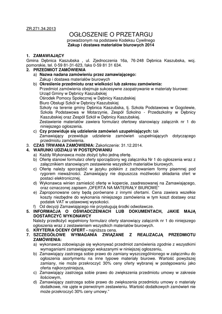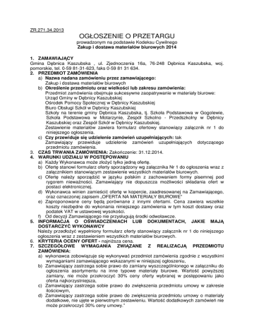 ZR.271.34.2013 OGŁOSZENIE O PRZETARGU prowadzonym na podstawie Kodeksu Cywilnego Zakup i dostawa materiałów biurowych 2014 1. ZAMAWIAJĄCY Gmina Dębnica Kaszubska , ul. Zjednoczenia 16a, 76-248 Dębnica Kaszubska, woj. pomorskie, tel. 0-59 81-31-623, faks 0-59 81 31 634. 2. PRZEDMIOT ZAMÓWIENIA a) Nazwa nadana zamówieniu przez zamawiającego: Zakup i dostawa materiałów biurowych b) Określenie przedmiotu oraz wielkości lub zakresu zamówienia: Przedmiot zamówienia obejmuje sukcesywne zaopatrywanie w materiały biurowe: Urząd Gminy w Dębnicy Kaszubskiej Ośrodek Pomocy Społecznej w Dębnicy Kaszubskiej Biuro Obsługi Szkół w Dębnicy Kaszubskiej Szkoły na terenie gminy Dębnica Kaszubska, tj. Szkoła Podstawowa w Gogolewie, Szkoła Podstawowa w Motarzynie, Zespół Szkolno - Przedszkolny w Dębnicy Kaszubskiej oraz Zespół Szkół w Dębnicy Kaszubskiej. Zestawienie materiałów zawiera formularz ofertowy stanowiący załącznik nr 1 do niniejszego ogłoszenia. c) Czy przewiduje się udzielenie zamówień uzupełniających: tak Zamawiający przewiduje udzielenie zamówień uzupełniających dotyczącego przedmiotu zamówienia. 3. CZAS TRWANIA ZAMÓWIENIA: Zakończenie: 31.12.2014. 4. WARUNKI UDZIAŁU W POSTĘPOWANIU a) Każdy Wykonawca może złożyć tylko jedną ofertę. b) Ofertę stanowi formularz oferty sporządzony wg załącznika Nr 1 do ogłoszenia wraz z załącznikiem stanowiącym zestawienie wszystkich materiałów biurowych. c) Ofertę należy sporządzić w języku polskim z zachowaniem formy pisemnej pod rygorem nieważności. Zamawiający nie dopuszcza możliwości składania ofert w postaci elektronicznej. d) Wykonawca winien zamieścić ofertę w kopercie, zaadresowanej na Zamawiającego, oraz oznaczonej zapisem „OFERTA NA MATERIAŁY BIUROWE” e) Zaproponowane ceny będą porównane z innymi ofertami. Cena zawiera wszelkie koszty niezbędne do wykonania niniejszego zamówienia w tym koszt dostawy oraz podatek VAT w ustawowej wysokości. f) Od decyzji Zamawiającego nie przysługują środki odwoławcze. 5. INFORMACJA O OŚWIADCZENIACH LUB DOKUMENTACH, JAKIE MAJĄ DOSTARCZYĆ WYKONAWCY Należy przedłożyć wypełniony formularz oferty stanowiący załącznik nr 1 do niniejszego ogłoszenia wraz z zestawieniem wszystkich materiałów biurowych. 6. KRYTERIA OCENY OFERT - najniższa cena. 7. SZCZEGÓŁOWE WYMAGANIA ZWIĄZANE Z REALIZACJĄ PRZEDMIOTU ZAMÓWIENIA: a) wykonawca zobowiązuje się wykonywać przedmiot zamówienia zgodnie z wszystkimi wymaganiami zamawiającego wskazanymi w niniejszej ogłoszeniu, b) Zamawiający zastrzega sobie prawo do zamiany wyszczególnionego w załączniku do ogłoszenia asortymentu na inne typowe materiały biurowe. Wartość powyższej zamiany, nie może przekroczyć 30% ceny oferty wybranej w postępowaniu jako oferta najkorzystniejsza, c) Zamawiający zastrzega sobie prawo do zwiększenia przedmiotu umowy w zakresie ilościowym, d) Zamawiający zastrzega sobie prawo do zwiększenia przedmiotu umowy o materiały dodatkowe, nie ujęte w pierwotnym zestawieniu. Wartość dodatkowych zamówień nie może przekroczyć 30% ceny umowy.” e) Zamawiający zastrzega sobie prawo do dokonania przesunięć ilościowych pomiędzy pozycjami wyszczególnionymi w załączniku do umowy. Wartość dokonanych przesunięć nie może przekroczyć 30% ceny oferty wybranej w postępowaniu jako oferta najkorzystniejsza, f) Zamawiający zastrzega sobie prawo ograniczenia przedmiotu umowy w zakresie ilościowym w przypadku, gdy z powodów ekonomicznych, bieżących potrzeb lub innych, nie będzie to leżało w interesie Zamawiającego. g) Zamawiający w zleceniu wskaże zamawiane produkty oraz ich ilość, h) Miejscem dostaw jest: • Urząd Gminy w Dębnicy Kaszubskiej, ul. Zjednoczenia 16 a, 76-248 Dębnica Kaszubska • Ośrodek Pomocy Społecznej, ul. Zjednoczenia 76-248 Dębnica Kaszubska • Biuro Obsługi Szkół ul. Zjednoczenia 16 a, 76-248 Dębnica Kaszubska • Szkoła Podstawowa w Gogolewie, Gogolewo 40, 76-248 Dębnica Kaszubska • Szkoła Podstawowa w Motarzynie, Motarzyno 9a, 76-248 Dębnica Kaszubska • Zespół Szkolno - Przedszkolny w Dębnicy Kaszubskiej, ul. Zjednoczenia 28, 76-248 Dębnica Kaszubska • Zespołu Szkół w Dębnicy Kaszubskiej, ul. Jana III Sobieskiego 3, 76-248 Dębnica Kaszubska, i) przedmiot konkretnego zlecenia zostanie wydany Zamawiającemu w terminie 10 dni od otrzymania przez wykonawcę zlecenia. j) rozliczenia pomiędzy Zamawiającym a Wykonawcą będą następowały po każdym prawidłowo zrealizowanym zleceniu, według cen jednostkowych przedstawionych w ofercie, na podstawie faktycznie zrealizowanych dostaw, k) zapłata wynagrodzenia za dostarczony przedmiot umowy następować będzie po zrealizowaniu każdej z dostaw, na podstawie częściowych faktur wystawionych na poszczególne jednostki, 8. INFORMACJE ADMINISTRACYJNE a) Adres strony internetowej, na której jest dostępna specyfikacja istotnych warunków zamówienia: ug.debnicakaszubska.ibip.pl b) Termin składania ofert: 27.12.2013, miejsce: Urząd Gminy w Dębnicy Kaszubskiej ul. Zjednoczenia 16a 76-248 Dębnica Kaszubska. c) Termin związania ofertą: 30 dni od ostatecznego terminu składania ofert 9. POZOSTAŁE INFORMACJE a) W uzasadnionych przypadkach Zamawiający może przed upływem terminu składania ofert zmienić treść zapisów niniejszego ogłoszenia. Dokonaną w ten sposób zmianę przekazuje się niezwłocznie wszystkim Wykonawcom, którym przekazano informację oraz umieszcza je na stronie internetowej Zamawiającego. b) Jeżeli w wyniku zmiany treści ogłoszenia jest niezbędny dodatkowy czas na wprowadzenie zmian w ofertach, zamawiający przedłuża termin składania ofert i informuje o tym wykonawców oraz zamieszcza informację na stronie internetowej. c) Osobami uprawnionymi do porozumiewania się z Wykonawcami są: Marta Łomża Duszny, tel 059/813 16 23 e-mail: [email protected] d) Zamawiający zastrzega sobie prawo