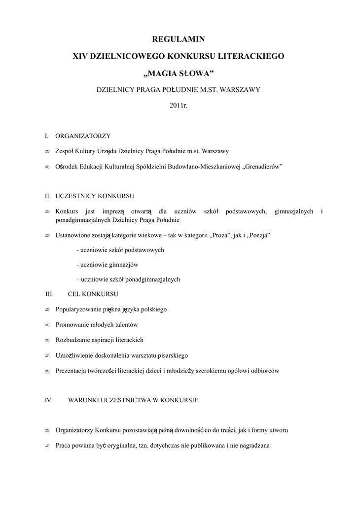 REGULAMIN XIV DZIELNICOWEGO KONKURSU LITERACKIEGO „MAGIA S ŁOWA” DZIELNICY PRAGA PO ŁUDNIE M.ST. WARSZAWY 2011r. I. ORGANIZATORZY • Zespół Kultury Urzędu Dzielnicy Praga Po łudnie m.st. Warszawy • Ośrodek Edukacji Kulturalnej Spó łdzielni Budowlano-Mieszkaniowej „Grenadierów” II. UCZESTNICY KONKURSU • Konkurs jest imprezą otwartą dla uczniów ponadgimnazjalnych Dzielnicy Praga Po łudnie szkó ł • Ustanowione zostają kategorie wiekowe – tak w kategorii „Proza”, jak i „Poezja” podstawowych, gimnazjalnych - uczniowie szkó ł podstawowych - uczniowie gimnazjów - uczniowie szkó ł ponadgimnazjalnych III. CEL KONKURSU • Popularyzowanie piękna języka polskiego • Promowanie m łodych talentów • Rozbudzanie aspiracji literackich • Umożliwienie doskonalenia warsztatu pisarskiego • Prezentacja twórczości literackiej dzieci i m łodzieży szerokiemu ogó łowi odbiorców IV. WARUNKI UCZESTNICTWA W KONKURSIE • Organizatorzy Konkursu pozostawiają pe łną dowolność co do treści, jak i formy utworu • Praca powinna być oryginalna, tzn. dotychczas nie publikowana i nie nagradzana i • Prace należy sk ładać w wersji papierowej (osobiście lub za pośrednictwem poczty) i elektronicznej na adres mailowy [email protected] (wersja elektroniczna jest obowiązkowa), zaznaczając w temacie maila, że jest to praca na Konkurs Literacki • Każda praca konkursowa musi być podpisana. Do każdej pracy musi być za łączona Karta Uczestnika (do pobrania ze strony www.sbm-grenadierow.com.pl) • Maksymalna objętość pracy nie może przekraczać pięciu stron znormalizowanego maszynopisu (tj. 65 znaków w wierszu, 30 wierszy na stronie – dotyczy prozy) • Termin składania prac up ływa 13 maja 2011r. V. OCENA I NAGRODY • Prace ocenia Jury powo łane przez Organizatorów • Jury oceniając prace, będzie bra ło pod uwagę następujące kryteria: - oryginalność utworu - treść i formę utworu - kulturę s łowa - ogólny poziom i wyraz artystyczny • Jury przyzna autorom najlepszych prac nagrody i wyróżnienia • O wynikach poinformujemy faxem, mailem lub telefonicznie. Wyniki zamieszczone będą również na stronie www.sbm-grenadierow.com.pl • Uroczyste wręczenie dyplomów i nagród Laureatom XIV Konkursu Literackiego odbędzie się w Ośrodku Edukacji Kulturalnej w dniu 9 czerwca 2011r. (czwartek) o godz. 12.00 VI. PRZEPISY ORGANIZACYJNE • Prace należy składać/przes łać do dnia 13 maja 2011r. osobiście/listownie i drogą elektroniczną • Organizatorzy zastrzegają sobie prawo publikacji ca łości lub części nades łanych prac w formie książkowej (bez uwzględnienia honorariów) • Sprawy nie ujęte Regulaminem rozstrzygają Organizatorzy w porozumieniu z Jury UWAGA! Prosimy wypełniać Karty zgłoszeniowe w sposób czytelny, nie budzący wątpliwości. Prosimy pamiętać o podstemplowaniu Karty pieczątką Szkoły
