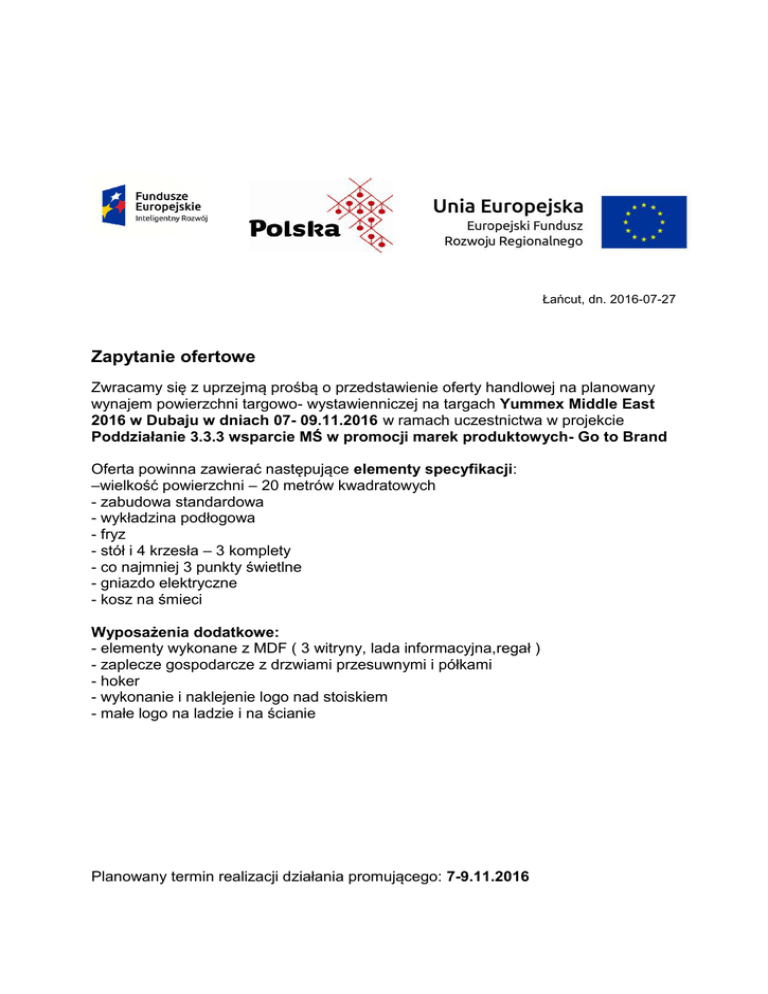 Łańcut, dn. 2016-07-27 Zapytanie ofertowe Zwracamy się z uprzejmą prośbą o przedstawienie oferty handlowej na planowany wynajem powierzchni targowo- wystawienniczej na targach Yummex Middle East 2016 w Dubaju w dniach 07- 09.11.2016 w ramach uczestnictwa w projekcie Poddziałanie 3.3.3 wsparcie MŚ w promocji marek produktowych- Go to Brand Oferta powinna zawierać następujące elementy specyfikacji: –wielkość powierzchni – 20 metrów kwadratowych - zabudowa standardowa - wykładzina podłogowa - fryz - stół i 4 krzesła – 3 komplety - co najmniej 3 punkty świetlne - gniazdo elektryczne - kosz na śmieci Wyposażenia dodatkowe: - elementy wykonane z MDF ( 3 witryny, lada informacyjna,regał ) - zaplecze gospodarcze z drzwiami przesuwnymi i półkami - hoker - wykonanie i naklejenie logo nad stoiskiem - małe logo na ladzie i na ścianie Planowany termin realizacji działania promującego: 7-9.11.2016 Ostateczny termin przedstawienia oferty: w terminie 7 dni. Tryb składania ofert: – droga elektroniczna, przy pomocy wiadomości e-mail wysłanej na adres [email protected] Treść oferty powinna znajdować się w wiadomości e-mail lub w załączniku pozbawionym możliwości edycji. – Faxem na numer +48 17 247 00 42 – w formie tradycyjnej (kurierem, pocztą lub osobiście) na adres: ZAKŁAD PRODUKCYJNO - HANDLOWY "ARGO" SP. Z O.O. UL. WIEJSKA 16 37-100 ŁAŃCUT Zapytanie ofertowe zamieszczono również w siedzibie zamawiającego w miejscu publicznie dostępnym. Zapytanie ofertowe zostało umieszczone na stronie internetowej www.argo.net.pl Wybór najkorzystniejszej oferty nastąpi w oparciu o następujące kryteria: • Cena 50% • Lokalizacja 50% Wyliczenia punktacji będzie odbywać się w następujący sposób: Ad 1 Cena Oferta z najniższą ceną otrzyma 100 pkt., pozostałe oferty będą punktowane wg wzoru: cena rozpatrywanej oferty / cena oferty z najniższą ceną x 100 pkt. Ad 2.Lokalizacja Oferta z najlepszą lokalizacją otrzyma 100 pkt., pozostałe oferty będą punktowane wg wzoru: cena rozpatrywanej oferty / cena oferty z najlepszą lokalizacją x 100 pkt. Zamawiający wybierze najkorzystniejszą ofertę, która uzyska najwyższą ilość punktów w oparciu o ustalone kryteria i podpisze umowę z wybranym wykonawcą.