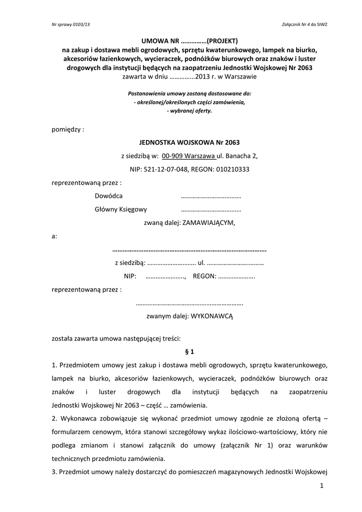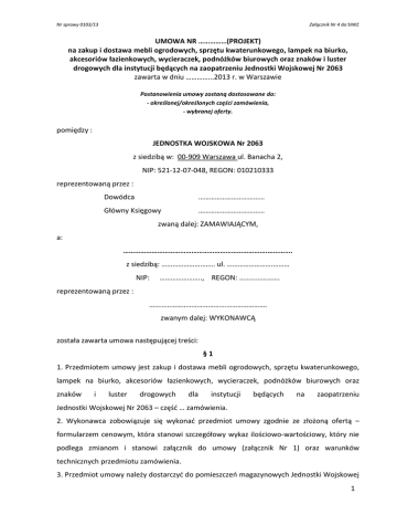 Nr sprawy 0103/13 Załącznik Nr 4 do SIWZ UMOWA NR ……………(PROJEKT) na zakup i dostawa mebli ogrodowych, sprzętu kwaterunkowego, lampek na biurko, akcesoriów łazienkowych, wycieraczek, podnóżków biurowych oraz znaków i luster drogowych dla instytucji będących na zaopatrzeniu Jednostki Wojskowej Nr 2063 zawarta w dniu …………...2013 r. w Warszawie Postanowienia umowy zostaną dostosowane do: - określonej/określonych części zamówienia, - wybranej oferty. pomiędzy : JEDNOSTKA WOJSKOWA Nr 2063 z siedzibą w: 00-909 Warszawa ul. Banacha 2, NIP: 521-12-07-048, REGON: 010210333 reprezentowaną przez : Dowódca ……………………………… Główny Księgowy ……………………………… zwaną dalej: ZAMAWIAJĄCYM, a: ………………………………………………………………….…………. z siedzibą: ………………….……. ul. …………………….……… NIP: ………………….., REGON: …………………. reprezentowaną przez : ………………………………………………………. zwanym dalej: WYKONAWCĄ została zawarta umowa następującej treści: §1 1. Przedmiotem umowy jest zakup i dostawa mebli ogrodowych, sprzętu kwaterunkowego, lampek na biurko, akcesoriów łazienkowych, wycieraczek, podnóżków biurowych oraz znaków i luster drogowych dla instytucji będących na zaopatrzeniu Jednostki Wojskowej Nr 2063 – część … zamówienia. 2. Wykonawca zobowiązuje się wykonać przedmiot umowy zgodnie ze złożoną ofertą – formularzem cenowym, która stanowi szczegółowy wykaz ilościowo-wartościowy, który nie podlega zmianom i stanowi załącznik do umowy (załącznik Nr 1) oraz warunków technicznych przedmiotu zamówienia. 3. Przedmiot umowy należy dostarczyć do pomieszczeń magazynowych Jednostki Wojskowej 1 Nr sprawy 0103/13 Załącznik Nr 4 do SIWZ 2063, 00-909 Warszawa ul. Krzywickiego 34. 4. Przedmiot niniejszego zamówienia musi być dostarczony do Zamawiającego fabrycznie nowy, nie używany, na gwarancji producenta, w oryginalnych opakowaniach producenta 5. Wykonawca udziela na przedmiot umowy gwarancji producenta, minimum 24 miesiące od daty sprzedaży. 6. Strony określają, że awaria urządzenia zostanie usunięta w okresie gwarancji w czasie w maksymalnie do 5 dni roboczych od dnia zgłoszenia awarii, zgodnie z warunkami gwarancji. 7. W przypadku gdy usunięcie awarii w terminie 5 dni roboczych jest niemożliwe Wykonawca na czas naprawy urządzenia na życzenie Zamawiającego zobowiązany jest do zapewnienia Zamawiającemu urządzenia zastępczego. 8. Wykonawca w okresie gwarancji zobowiązuje się do wymiany wadliwych materiałów eksploatacyjnych na wolne od wad. §2 1. Wykonawca zobowiązuje się do dostawy przedmiotu umowy na własny koszt, na warunkach określonych w niniejszej umowie, w ramach wynagrodzenia, o którym mowa w § 4 ust 1. 2. Wykonawca w okresie dostawy ponosi odpowiedzialność za przedmiot umowy, w tym jego ubezpieczenie na okres transportu i dostawy. §3 1. Przedmiot umowy dostarczony zostanie do odbiorcy w terminie do 30 dni od daty podpisania umowy, z zastrzeżeniem ust. 2. 2. Strony ustalają, ze dostawa przedmiotu umowy do odbiorcy nastąpi w terminie 5 dni od daty zgłoszenia wysłanego w formie elektronicznej bądź wysłane faxem. §4 1. Całkowite Wynagrodzenie za przedmiot zamówienia, zgodnie ze złożoną ofertą, wynosi: netto ………………. zł, brutto ……………… zł, słownie brutto: ……………..……………………………………………………. ……../100 złotych. 2. Wynagrodzenie, o którym mowa w ust. 1, zawiera wszystkie elementy dostawy (urządzenie i materiały eksploatacyjne) w tym koszty: opakowań, transportu, ubezpieczenia oraz dostawy. 3. Zapłata za wykonanie przedmiotu umowy dokonana będzie przelewem z rachunku bankowego Zamawiającego na rachunek bankowy Wykonawcy w terminie do 30 dni na 2 Nr sprawy 0103/13 Załącznik Nr 4 do SIWZ podstawie dostarczonej faktury VAT wraz z protokółem odbioru przedmiotu umowy do siedziby Zamawiającego, z zastrzeżeniem postanowień zawartych w § 6 ust. 2. 4. Za zachowanie terminu zapłaty, o którym mowa w ust 1, strony uznają datę obciążenia rachunku bankowego Zamawiającego najpóźniej w ostatnim dniu tego terminu. 5. Za zwłokę w terminie płatności Wykonawcy przysługują odsetki ustawowe. §5 1. Jakościowy i ilościowy odbiór przedmiotu umowy dokonany będzie przez przedstawiciela Zamawiającego, o którym mowa w ust. 4. 2. Potwierdzeniem przekazania przedmiotu umowy będzie protokół przekazania stanowiący załącznik do faktury. 3. Protokół odbioru stanowi integralna część do faktury wystawionej przez Wykonawcę i podpisany przez przedstawiciela Zamawiającego i Wykonawcy. 4. Osobą odpowiedzialną za odbiór przedmiotu umowy jest: ………………………………………..….….– tel. ………….……….. 5. Ze strony Wykonawcy osobą odpowiedzialną za realizację przedmiotu umowy jest: ………………………………………..….….– tel. ………….……….. 6.Zamawiający nie ponosi żadnej odpowiedzialności prawnej za pracowników Wykonawcy w trakcie realizacji przedmiotu umowy. §6 1. W przypadku stwierdzenia przy odbiorze przedmiotu umowy przez przedstawiciela odbiorcy wad w jakości dostarczonego przedmiotu umowy lub stwierdzenia wykonania przez Wykonawcę przedmiotu umowy niezgodnie z zawartą umową, Wykonawca zobowiązuje się najdalej w ciągu 3 kolejnych dni roboczych do wymiany i dostarczenia przedmiotu umowy (urządzenia i materiałów eksploatacyjnych) dobrej jakości zgodnie z zawartą umową na swój (tj. Wykonawcy) koszt. W przypadku odmowy takiej wymiany, Zamawiający odmówi zapłaty za przedmiot umowy lub jego wadliwa część naliczając kary umowne za nie wywiązanie się z realizacji zawartej umowy. 2. W przypadku stwierdzonych zastrzeżeń co do jakości dostarczonego p