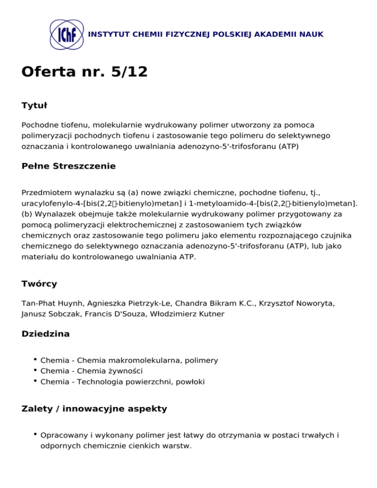 INSTYTUT CHEMII FIZYCZNEJ POLSKIEJ AKADEMII NAUK Oferta nr. 5/12 Tytuł Pochodne tiofenu, molekularnie wydrukowany polimer utworzony za pomoca polimeryzacji pochodnych tiofenu i zastosowanie tego polimeru do selektywnego oznaczania i kontrolowanego uwalniania adenozyno-5'-trifosforanu (ATP) Pełne Streszczenie Przedmiotem wynalazku są (a) nowe związki chemiczne, pochodne tiofenu, tj., uracylofenylo-4-[bis(2,2-bitienylo)metan] i 1-metyloamido-4-[bis(2,2-bitienylo)metan]. (b) Wynalazek obejmuje także molekularnie wydrukowany polimer przygotowany za pomocą polimeryzacji elektrochemicznej z zastosowaniem tych związków chemicznych oraz zastosowanie tego polimeru jako elementu rozpoznającego czujnika chemicznego do selektywnego oznaczania adenozyno-5'-trifosforanu (ATP), lub jako materiału do kontrolowanego uwalniania ATP. Twórcy Tan-Phat Huynh, Agnieszka Pietrzyk-Le, Chandra Bikram K.C., Krzysztof Noworyta, Janusz Sobczak, Francis D'Souza, Włodzimierz Kutner Dziedzina Chemia - Chemia makromolekularna, polimery Chemia - Chemia żywności Chemia - Technologia powierzchni, powłoki Zalety / innowacyjne aspekty Opracowany i wykonany polimer jest łatwy do otrzymania w postaci trwałych i odpornych chemicznie cienkich warstw. Można osadzić go na podłożach o nietypowych powierzchniach. Pozwala na selektywne i odwracalne wiązanie ATP. Chemoczujnik z warstwą rozpoznającą z tego polimeru wykazuje dużą selektywność i czułość w stosunku do ATP oraz znaczącą wykrywalność. Słowa kluczowe adenozyno-5-trifosofran, ATP, chemoczujnik, tiofen, polimer przewodzący, impedymetria pojemnościowa, mikrograwimetria piezoelektryczna Zastosowanie Biosensory, Chemia analityczna, Czujniki pomiarowe, Chemosensory do oznaczania ATP w próbkach biologicznych, Materiał do kontrolowanego uwalniania ATP, Badania kliniczne, Diagnostyka, Inżynieria biomedyczna, Biochemia i Biofizyka, Biologia komórkowa i molekularna, Inżynieria genetyczna, Modelowanie molekularne, Testy In vitro, Dodatki do żywności, Przetwarzanie żywności, Technologia żywności, Kontrola Jakości, Techniki chemiczne Stan zaawansowania etap rozwoju Prawa własności intelektualnej Zgłoszenie patentowe w Wielkiej Brytanii IChF dla Firm ul. Kasprzaka 44/52 01-224 Warszawa TEL: 22 343 33 12 | FAX: 22 343 33 33 [email protected] | NIP: 525-000-87-55