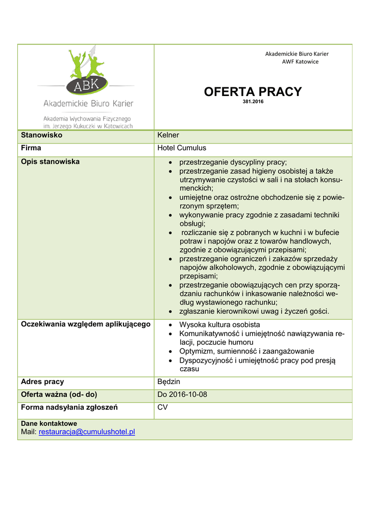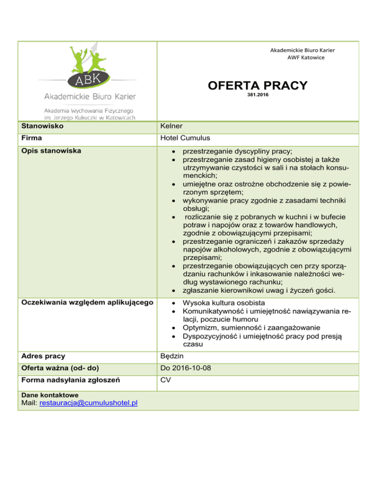 Akademickie Biuro Karier AWF Katowice OFERTA PRACY 381.2016 Stanowisko Kelner Firma Hotel Cumulus Opis stanowiska przestrzeganie dyscypliny pracy; przestrzeganie zasad higieny osobistej a także utrzymywanie czystości w sali i na stołach konsumenckich; umiejętne oraz ostrożne obchodzenie się z powierzonym sprzętem; wykonywanie pracy zgodnie z zasadami techniki obsługi; rozliczanie się z pobranych w kuchni i w bufecie potraw i napojów oraz z towarów handlowych, zgodnie z obowiązującymi przepisami; przestrzeganie ograniczeń i zakazów sprzedaży napojów alkoholowych, zgodnie z obowiązującymi przepisami; przestrzeganie obowiązujących cen przy sporządzaniu rachunków i inkasowanie należności według wystawionego rachunku; zgłaszanie kierownikowi uwag i życzeń gości. Oczekiwania względem aplikującego Wysoka kultura osobista Komunikatywność i umiejętność nawiązywania relacji, poczucie humoru Optymizm, sumienność i zaangażowanie Dyspozycyjność i umiejętność pracy pod presją czasu Adres pracy Będzin Oferta ważna (od- do) Do 2016-10-08 Forma nadsyłania zgłoszeń CV Dane kontaktowe Mail: [email protected]