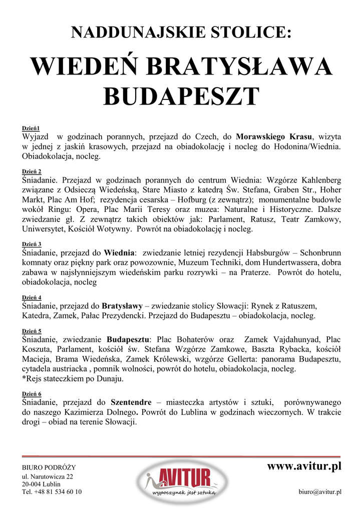 NADDUNAJSKIE STOLICE: WIEDEŃ BRATYSŁAWA BUDAPESZT Dzień1 Wyjazd w godzinach porannych, przejazd do Czech, do Morawskiego Krasu, wizyta w jednej z jaskiń krasowych, przejazd na obiadokolację i nocleg do Hodonina/Wiednia. Obiadokolacja, nocleg. Dzień 2 Śniadanie. Przejazd w godzinach porannych do centrum Wiednia: Wzgórze Kahlenberg związane z Odsieczą Wiedeńską, Stare Miasto z katedrą Św. Stefana, Graben Str., Hoher Markt, Plac Am Hof; rezydencja cesarska – Hofburg (z zewnątrz); monumentalne budowle wokół Ringu: Opera, Plac Marii Teresy oraz muzea: Naturalne i Historyczne. Dalsze zwiedzanie gł. Z zewnątrz takich obiektów jak: Parlament, Ratusz, Teatr Zamkowy, Uniwersytet, Kościół Wotywny. Powrót na obiadokolację i nocleg. Dzień 3 Śniadanie, przejazd do Wiednia: zwiedzanie letniej rezydencji Habsburgów – Schonbrunn komnaty oraz piękny park oraz powozownie, Muzeum Techniki, dom Hundertwassera, dobra zabawa w najsłynniejszym wiedeńskim parku rozrywki – na Praterze. Powrót do hotelu, obiadokolacja, nocleg Dzień 4 Śniadanie, przejazd do Bratysławy – zwiedzanie stolicy Słowacji: Rynek z Ratuszem, Katedra, Zamek, Pałac Prezydencki. Przejazd do Budapesztu – obiadokolacja, nocleg. Dzień 5 Śniadanie, zwiedzanie Budapesztu: Plac Bohaterów oraz Zamek Vajdahunyad, Plac Koszuta, Parlament, kościół św. Stefana Wzgórze Zamkowe, Baszta Rybacka, kościół Macieja, Brama Wiedeńska, Zamek Królewski, wzgórze Gellerta: panorama Budapesztu, cytadela austriacka , pomnik wolności, powrót do hotelu, obiadokolacja, nocleg. *Rejs stateczkiem po Dunaju. Dzień 6 Śniadanie, przejazd do Szentendre – miasteczka artystów i sztuki, porównywanego do naszego Kazimierza Dolnego. Powrót do Lublina w godzinach wieczornych. W trakcie drogi – obiad na terenie Słowacji. BIURO PODRÓŻY ul. Narutowicza 22 20-004 Lublin Tel. +48 81 534 60 10 www.avitur.pl [email protected] Propozycje zakwaterowania: Hotel Panon w Hodoninie – www.panon.hotel.cz Hodonin to miasteczko na terenie Czech – ok 90 km od centrum Wiednia usytuowany – czyli potrzeba ok. półtorej godziny aby dojechać do centrum stolicy Austrii. Hotel Panon niegdyś pracowniczy, dziś odnowiony i całkiem schludny, oferuje pokoje typu Studio: 2 + 3 ze wspólną łazienką. Jest przychylny grupom młodzieży ale niestety nie posiada zaplecza typu sala sportowa itp. Samo miasteczko także jest bardzo urokliwe i posiada nawet małe Zoo. GASTHOF MAGISTER*** www.gasthof-magister.at - rodzinny, typowy austriacki pensjonat prowadzony przez rodzinę w małej satelitarnej miejscowości Wiednia. Schludne pokoje 2, 3 i 4 osobowe z łazienkami. Dobra domowa kuchnia!!! Do centrum Wiednia ok. 35 km. POSTHOTEL LAABEN**** www.hotelpost-laaben.at - z małym welles oraz miejscem, gdzie wieczorem można zorganizować disco lub inne zabawy grupie młodzieży. HOTEL/L.osób Hodonin – Hotel Panon Wiedeń Gasthof Wiedeń – Posthotel Laaben 30 – 35 os. 36 – 45 os. 1159 zł/os. 1050 zł/os. 1315 zł/os. 1199 zł/os. 1370 zł/os. 1250 zł/os. 45 i więcej 975 zł/os. 1125 zł/os. 1179 zł/os. Cena zawiera: - transport autokarem; noclegi – wg tabeli w Wiedniu lub w Hodoninie oraz 2 noclegi w Budapeszcie w hotelu Hunor (www.hunorhotel.com); - wyżywienie wg programu (śniadania i obiadokolacje); - pilot ze strony Biura; - przewodnik lokalni w Wiedniu; - podatek VAT- ubezpieczenie NW i KL Cena nie zawiera biletów wstępu do zwiedzanych obiektów – wg uznania oraz opłaty na tzw. Fundusz Gwarancyjny (nowy podatek na rzecz Marszałka danego województwa gwarantujący sprowadzenie osób będących za granicą w przypadku bankructwa biura, który teoretycznie obowiązuje od XI 2016r ale nie ma jeszcze szczegółowych rozporządzeń co do kwot). Obok wielu atrakcji i muzeów, które są bezpłatne dla młodzieży do 18 lat, proponujemy ponadto płatne wejścia: - Jaskinia Macocha wraz z kolejką ekologiczną ok. 200 Kc - Schoenbrunn – tzw. Imperial Tour ok. 13 euro - wejście na wieżę katedry św. Szczepana – ok. 2 euro - rejs statkiem po Dunaju w Budapeszcie – ok. 6 euro - muzeum marcepanu w Szentendre – ok. 900 HUF (15 zł) BIURO PODRÓŻY ul. Narutowicza 22 20-004 Lublin Tel. +48 81 534 60 10 www.avitur.pl [email protected]