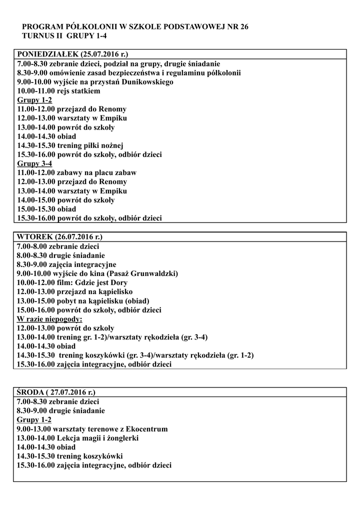 PROGRAM PÓŁKOLONII W SZKOLE PODSTAWOWEJ NR 26 TURNUS II GRUPY 1-4 PONIEDZIAŁEK (25.07.2016 r.) 7.00-8.30 zebranie dzieci, podział na grupy, drugie śniadanie 8.30-9.00 omówienie zasad bezpieczeństwa i regulaminu półkolonii 9.00-10.00 wyjście na przystań Dunikowskiego 10.00-11.00 rejs statkiem Grupy 1-2 11.00-12.00 przejazd do Renomy 12.00-13.00 warsztaty w Empiku 13.00-14.00 powrót do szkoły 14.00-14.30 obiad 14.30-15.30 trening piłki nożnej 15.30-16.00 powrót do szkoły, odbiór dzieci Grupy 3-4 11.00-12.00 zabawy na placu zabaw 12.00-13.00 przejazd do Renomy 13.00-14.00 warsztaty w Empiku 14.00-15.00 powrót do szkoły 15.00-15.30 obiad 15.30-16.00 powrót do szkoły, odbiór dzieci WTOREK (26.07.2016 r.) 7.00-8.00 zebranie dzieci 8.00-8.30 drugie śniadanie 8.30-9.00 zajęcia integracyjne 9.00-10.00 wyjście do kina (Pasaż Grunwaldzki) 10.00-12.00 film: Gdzie jest Dory 12.00-13.00 przejazd na kąpielisko 13.00-15.00 pobyt na kąpielisku (obiad) 15.00-16.00 powrót do szkoły, odbiór dzieci W razie niepogody: 12.00-13.00 powrót do szkoły 13.00-14.00 trening gr. 1-2)/warsztaty rękodzieła (gr. 3-4) 14.00-14.30 obiad 14.30-15.30 trening koszykówki (gr. 3-4)/warsztaty rękodzieła (gr. 1-2) 15.30-16.00 zajęcia integracyjne, odbiór dzieci ŚRODA ( 27.07.2016 r.) 7.00-8.30 zebranie dzieci 8.30-9.00 drugie śniadanie Grupy 1-2 9.00-13.00 warsztaty terenowe z Ekocentrum 13.00-14.00 Lekcja magii i żonglerki 14.00-14.30 obiad 14.30-15.30 trening koszykówki 15.30-16.00 zajęcia integracyjne, odbiór dzieci Grupy 3-4 9.00-10.00 wyjście na kręgle (Skytower) 10.00-11.00 gra w kręgle 11.00-12.00 przejazd na kąpielisko 12.00-15.00 pobyt na kąpielisku (obiad) 15.00-16.00 powrót do szkoły, odbiór dzieci W razie niepogody: 11.00-12.00 powrót do szkoły 12.00-13.00 Lekcja magii i żonglerki 13.00-14.00 trning koszykówki 14.00-14.30 obiad 14.30-15.30 zajęcia z chustą Klanzy 15.30-16.00 zajęcia integracyjne, odbiór dzieci CZWARTEK ( 28.07.2016 r.) 7.00-8.00 zebranie dzieci 8.00-8.30 drugie śniadanie 8.30-9.00 zajęcia integracyjne Grupy 1-2 9.00-10.00 wyjście na kręgle (Skytower) 10.00-11.00 gra w kręgle 11.00-12.00 przejazd na kąpielisko 12.00-15.00 pobyt na kąpielisku (obiad) 15.00-16.00 powrót do szkoły, odbiór dzieci W razie niepogody: 11.00-12.00 powrót do szkoły 12.00-13.00 duże banki mydlane 13.00-14.00 trning piłki nożnej 14.00-14.30 obiad 14.30-15.30 zajęcia z chustą Klanzy/modelowanie balonów 15.30-16.00 zajęcia integracyjne, odbiór dzieci Grupy 3-4 8.30-10.00 wyjscie na warsztaty w Arsenale Miejskim 10.00-11.30 warsztaty: Dzieckiem być...w starożytnym Rzymie 11.30-13.00 powrót do szkoły 13.00-14.00 duże bańki mydlane 14.00-14.30 obiad 14.30-15.30 trening piłki nożnej 15.30-16.00 zajęcia integracyjne, odbiór dzieci PIĄTEK ( 29.07.2016 r.) 7.00-8.00 zebranie dzieci 8.00-8.30 drugie śniadanie Grupy 1-2 8.30-10.00 wyjście na warsztaty w Arsenale Miejskim 10.00-11.30 warsztaty: Dzieckiem być...w starożytnym Rzymie 11.30-12.30 przejazd na przystań Zwierzyniecką 12.30-13.30 pływanie na kajakach 13.30-14.30 powrót do szkoły 14.30-15.00 obiad 15.00-16.00 zakończenie półkolonii, odbiór dzieci Grupy 3-4 8.30-9.30 trening piłki nożnej 9.30-11.00 wyjście na przystań Zwierzyniecką 11.00-12.00 pływanie na kajakach 12.00-13.00 powrót do szkoły 13.00-14.00 modelowanie balonów 14.00-14.30 obiad 14.30-16.00 zakończenie półkolonii, odbiór dzieci