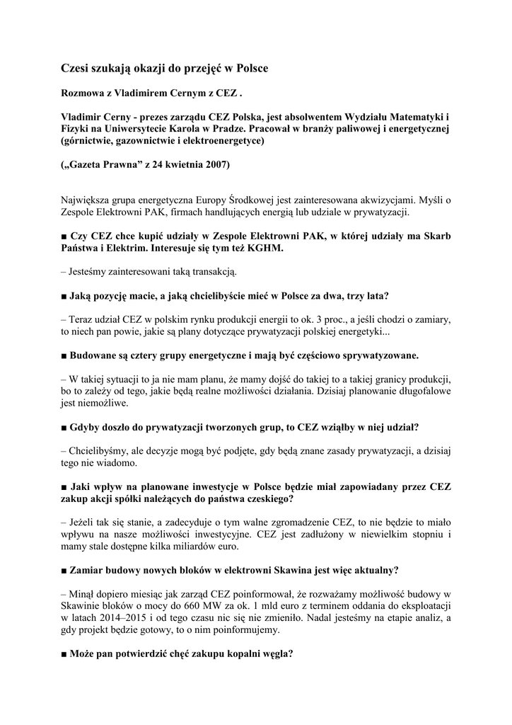 Czesi szukają okazji do przejęć w Polsce Rozmowa z Vladimirem Cernym z CEZ . Vladimir Cerny - prezes zarządu CEZ Polska, jest absolwentem Wydziału Matematyki i Fizyki na Uniwersytecie Karola w Pradze. Pracował w branŜy paliwowej i energetycznej (górnictwie, gazownictwie i elektroenergetyce) („Gazeta Prawna” z 24 kwietnia 2007) Największa grupa energetyczna Europy Środkowej jest zainteresowana akwizycjami. Myśli o Zespole Elektrowni PAK, firmach handlujących energią lub udziale w prywatyzacji. ■ Czy CEZ chce kupić udziały w Zespole Elektrowni PAK, w której udziały ma Skarb Państwa i Elektrim. Interesuje się tym teŜ KGHM. – Jesteśmy zainteresowani taką transakcją. ■ Jaką pozycję macie, a jaką chcielibyście mieć w Polsce za dwa, trzy lata? – Teraz udział CEZ w polskim rynku produkcji energii to ok. 3 proc., a jeśli chodzi o zamiary, to niech pan powie, jakie są plany dotyczące prywatyzacji polskiej energetyki... ■ Budowane są cztery grupy energetyczne i mają być częściowo sprywatyzowane. – W takiej sytuacji to ja nie mam planu, Ŝe mamy dojść do takiej to a takiej granicy produkcji, bo to zaleŜy od tego, jakie będą realne moŜliwości działania. Dzisiaj planowanie długofalowe jest niemoŜliwe. ■ Gdyby doszło do prywatyzacji tworzonych grup, to CEZ wziąłby w niej udział? – Chcielibyśmy, ale decyzje mogą być podjęte, gdy będą znane zasady prywatyzacji, a dzisiaj tego nie wiadomo. ■ Jaki wpływ na planowane inwestycje w Polsce będzie miał zapowiadany przez CEZ zakup akcji spółki naleŜących do państwa czeskiego? – JeŜeli tak się stanie, a zadecyduje o tym walne zgromadzenie CEZ, to nie będzie to miało wpływu na nasze moŜliwości inwestycyjne. CEZ jest zadłuŜony w niewielkim stopniu i mamy stale dostępne kilka miliardów euro. ■ Zamiar budowy nowych bloków w elektrowni Skawina jest więc aktualny? – Minął dopiero miesiąc jak zarząd CEZ poinformował, Ŝe rozwaŜamy moŜliwość budowy w Skawinie bloków o mocy do 660 MW za ok. 1 mld euro z terminem oddania do eksploatacji w latach 2014–2015 i od tego czasu nic się nie zmieniło. Nadal jesteśmy na etapie analiz, a gdy projekt będzie gotowy, to o nim poinformujemy. ■ MoŜe pan potwierdzić chęć zakupu kopalni węgla? – Byliśmy zainteresowani zakupem kopalni, gdy w 2005 roku była ogłoszona prywatyzacja Katowickiego Holdingu Węglowego. ZłoŜyliśmy wtedy ofertę, ale ta prywatyzacja została wstrzymana. Potem jeszcze ukazała się informacja, Ŝe jesteśmy zainteresowani kopalnią Budryk, ale to była dziennikarska kaczka. Nie mamy konkretnego projektu dotyczącego zakupu kopalni. ■ Co jest najbardziej interesujące dla CEZ w Polsce? – Podstawowym biznesem kaŜdej grupy energetycznej jest produkcja i sprzedaŜ energii. W Polsce na razie mamy elektrownie. ■ Jak pan ocenia projekt ustawy o rozwiązaniu kontraktów długoterminowych? To was teŜ dotyczy. Macie elektrociepłownię Elcho? – To jest powaŜny problem, bo inwestycja w Elcho jest ściśle związana z KDT-em. KDT ułatwił elektrociepłowni dostęp do kredytów, trwa proces finansowania budowy i zmiana jego reguł nie jest łatwa. ■ Jest pan przeciwko rozwiązaniu KDT-ów? – MoŜna być za lub przeciwko w przypadku konkretnego projektu rozwiązania KDT-ów, a jaki jest teraz projekt? ■ Ten, który jest w Sejmie. – Wokół tego projektu toczą się dyskusje i nie wiadomo, jaki będzie miał ostatecznie kształt. Teraz jasne jest tylko, Ŝe nie ma prostej odpowiedzi na pytanie o skutki rozwiązania KDT-ów, bo zaleŜą one od wielu parametrów, a niektóre nie są znane. Na przykład nie wiadomo, jaka będzie cena energii w przyszłości. Niemniej uwaŜam, Ŝe KDT-y powinny zniknąć i Ŝe rynek powinien być otwarty co do cen. ■ Jakie będą skutki zmniejszenia limitów CO2 dla Polski? – Nie wiem, jak Polska da sobie z tym radę, bo jeŜeli jest coś pewnego w przyszłości polskiej energetyki to to, Ŝe zapotrzebowanie na energię będzie rosło. I w momencie, gdy zezwoleń na emisję CO2 będzie mało, a trzeba będzie produkować więcej, to będzie teŜ trzeba kupić uprawnienia. ■ MoŜna inwestować w energetykę odnawialną czy elektrociepłownie, które od czasu do czasu moŜna kupić. – Nie jest tak, Ŝe CEZ kupi wszystko co się pokaŜe. W ciągu ostatniego roku nie było oferty sprzedaŜy Ŝadnej elektrociepłowni, którą bylibyśmy zainteresowani, a interesują nas firmy o mocy przynajmniej 100 MW. Natomiast chcemy inwestować w elektrownie wiatrowe i w Czechach, i w Polsce. Rozmawiał Ireneusz Chojnacki