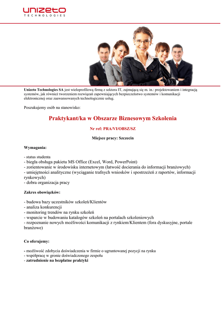 Unizeto Technologies SA jest wieloprofilową firmą z sektora IT, zajmującą się m. in.: projektowaniem i integracją systemów, jak również tworzeniem rozwiązań zapewniających bezpieczeństwo systemów i komunikacji elektronicznej oraz zaawansowanych technologicznie usług. Poszukujemy osób na stanowisko: Praktykant/ka w Obszarze Biznesowym Szkolenia Nr ref: PRA/VI/OBSZ/SZ Miejsce pracy: Szczecin Wymagania: - status studenta - biegła obsługa pakietu MS Office (Excel, Word, PowerPoint) - zorientowanie w środowisku internetowym (łatwość docierania do informacji branżowych) - umiejętności analityczne (wyciąganie trafnych wniosków i spostrzeżeń z raportów, informacji rynkowych) - dobra organizacja pracy Zakres obowiązków: - budowa bazy uczestników szkoleń/Klientów - analiza konkurencji - monitoring trendów na rynku szkoleń - wsparcie w budowaniu katalogów szkoleń na portalach szkoleniowych - rozpoznanie nowych możliwości komunikacji z rynkiem/Klientem (fora dyskusyjne, portale branżowe) Co oferujemy: - możliwość zdobycia doświadczenia w firmie o ugruntowanej pozycji na rynku - współpracę w gronie doświadczonego zespołu - zatrudnienie na bezpłatne praktyki Oferty zawierające cv i list motywacyjny prosimy przesłać pocztą elektroniczną na adres e-mail: [email protected] z umieszczeniem w temacie e-maila numeru referencyjnego. Informujemy, że skontaktujemy się z wybranymi kandydatami. Prosimy o zamieszczenie w aplikacji następującej klauzuli: "Wyrażam zgodę na przetwarzanie moich danych osobowych zawartych w przesłanej aplikacji dla potrzeb niezbędnych do realizacji procesu rekrutacji zgodnie z ustawą z dnia 29 sierpnia 1997 r. (Dz. U. z 2002 r. Nr 101, poz. 926, z późn. zm.)."