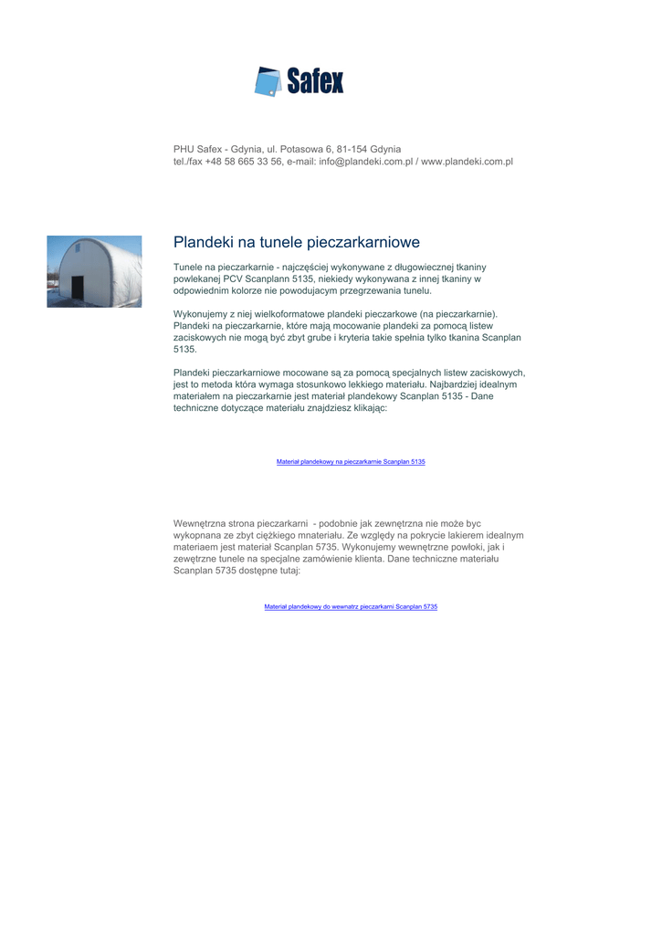 PHU Safex - Gdynia, ul. Potasowa 6, 81-154 Gdynia tel./fax +48 58 665 33 56, e-mail: [email protected] / www.plandeki.com.pl Plandeki na tunele pieczarkarniowe Tunele na pieczarkarnie - najczęściej wykonywane z długowiecznej tkaniny powlekanej PCV Scanplann 5135, niekiedy wykonywana z innej tkaniny w odpowiednim kolorze nie powodujacym przegrzewania tunelu. Wykonujemy z niej wielkoformatowe plandeki pieczarkowe (na pieczarkarnie). Plandeki na pieczarkarnie, które mają mocowanie plandeki za pomocą listew zaciskowych nie mogą być zbyt grube i kryteria takie spełnia tylko tkanina Scanplan 5135. Plandeki pieczarkarniowe mocowane są za pomocą specjalnych listew zaciskowych, jest to metoda która wymaga stosunkowo lekkiego materiału. Najbardziej idealnym materiałem na pieczarkarnie jest materiał plandekowy Scanplan 5135 - Dane techniczne dotyczące materiału znajdziesz klikając: Materiał plandekowy na pieczarkarnie Scanplan 5135 Wewnętrzna strona pieczarkarni - podobnie jak zewnętrzna nie może byc wykopnana ze zbyt ciężkiego mnateriału. Ze względy na pokrycie lakierem idealnym materiaem jest materiał Scanplan 5735. Wykonujemy wewnętrzne powłoki, jak i zewętrzne tunele na specjalne zamówienie klienta. Dane techniczne materiału Scanplan 5735 dostępne tutaj: Materiał plandekowy do wewnatrz pieczarkarni Scanplan 5735