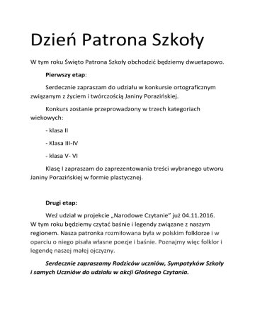 Dzień Patrona Szkoły W tym roku Święto Patrona Szkoły obchodzić będziemy dwuetapowo. Pierwszy etap: Serdecznie zapraszam do udziału w konkursie ortograficznym związanym z życiem i twórczością Janiny Porazińskiej. Konkurs zostanie przeprowadzony w trzech kategoriach wiekowych: - klasa II - Klasa III-IV - klasa V- VI Klasę I zapraszam do zaprezentowania treści wybranego utworu Janiny Porazińskiej w formie plastycznej. Drugi etap: Weź udział w projekcie „Narodowe Czytanie” już 04.11.2016. W tym roku będziemy czytać baśnie i legendy związane z naszym regionem. Nasza patronka rozmiłowana była w polskim folklorze i w oparciu o niego pisała własne poezje i baśnie. Poznajmy więc folklor i legendę naszej małej ojczyzny. Serdecznie zapraszamy Rodziców uczniów, Sympatyków Szkoły i samych Uczniów do udziału w akcji Głośnego Czytania. REGULAMIN KONKURSU ORTOGRAFICZNEGO Opiekun konkursu: polonista Renata Król-Wcisło 1. Organizator konkursu: SP w Szczytnikach 2. Cele konkursu: 1. Zapoznanie z życiem i twórczością Janiny Porazińskiej 2. zachęcanie uczniów do poznawania reguł ortograficznych 3. zachęcanie uczniów do posługiwania się w piśmie poprawną polszczyzną 4. doskonalenie poprawności ortograficznej i gramatycznej 5. uwrażliwianie uczniów na piękno języka polskiego 6. popularyzacja konkursu jako jednej z form rozwijania zainteresowań i uzdolnień 3. Zasady uczestnictwa: ‐konkurs przeznaczony jest dla uczniów klas : II‐VI Szkoły Podstawowej w Szczytnikach 4.Przebieg konkursu: ‐konkurs odbędzie się 27 października 2016 roku ‐nauczyciel w każdej z klas przeprowadza dyktando konkursowe wśród uczniów ‐najlepsi uczestnicy konkursu otrzymają nagrody i dyplomy 5.Ocena prac konkursowych ‐wygrywa uczeń, który nie popełnił błędu lub popełnił tylko jeden błąd ‐interpunkcja ‐staranność napisanego dyktanda 6.Zakres wymaganego materiału pisowania małą i wielką literą pisownia wyrazów z: ó‐u, rz‐ż, ch‐h znajomość tytułów utworów Janiny Porazińskiej znajomość treści niektórych utworów (z gazetki)