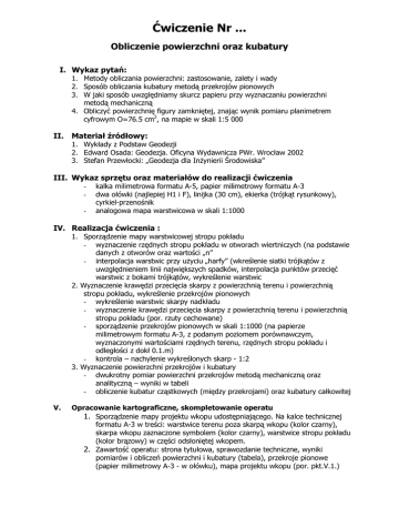 Ćwiczenie Nr ... Obliczenie powierzchni oraz kubatury I. Wykaz pytań: 1. Metody obliczania powierzchni: zastosowanie, zalety i wady 2. Sposób obliczania kubatury metodą przekrojów pionowych 3. W jaki sposób uwzględniamy skurcz papieru przy wyznaczaniu powierzchni metodą mechaniczną 4. Obliczyć powierzchnię figury zamkniętej, znając wynik pomiaru planimetrem cyfrowym O=76.5 cm2, na mapie w skali 1:5 000 II. Materiał źródłowy: 1. Wykłady z Podstaw Geodezji 2. Edward Osada: Geodezja. Oficyna Wydawnicza PWr. Wrocław 2002 3. Stefan Przewłocki: „Geodezja dla Inżynierii Środowiska” III. Wykaz sprzętu oraz materiałów do realizacji ćwiczenia - kalka milimetrowa formatu A-5, papier milimetrowy formatu A-3 dwa ołówki (najlepiej H1 i F), linijka (30 cm), ekierka (trójkąt rysunkowy), cyrkiel-przenośnik analogowa mapa warstwicowa w skali 1:1000 IV. Realizacja ćwiczenia : 1. Sporządzenie mapy warstwicowej stropu pokładu - wyznaczenie rzędnych stropu pokładu w otworach wiertniczych (na podstawie danych z otworów oraz wartości „n” - interpolacja warstwic przy użyciu „harfy” (wkreślenie siatki trójkątów z uwzględnieniem linii największych spadków, interpolacja punktów przecięć warstwic z bokami trójkątów, wykreślenie warstwic 2. Wyznaczenie krawędzi przecięcia skarpy z powierzchnią terenu i powierzchnią stropu pokładu, wykreślenie przekrojów pionowych - wykreślenie warstwic skarpy nadkładu - wyznaczenie krawędzi przecięcia skarpy z powierzchnią terenu i powierzchnią stropu pokładu (por. rzuty cechowane) - sporządzenie przekrojów pionowych w skali 1:1000 (na papierze milimetrowym formatu A-3, z podanym poziomem porównawczym, wyznaczonymi wartościami rzędnych terenu, rzędnych stropu pokładu i odległości z dokł 0.1.m) - kontrola – nachylenie wykreślonych skarp - 1:2 3. Wyznaczenie powierzchni przekrojów i kubatury - dwukrotny pomiar powierzchni przekrojów metodą mechaniczną oraz analityczną – wyniki w tabeli - obliczenie kubatur cząstkowych (między przekrojami) oraz kubatury całkowitej V. Opracowanie kartograficzne, skompletowanie operatu 1. Sporządzenie mapy projektu wkopu udostępniającego. Na kalce technicznej formatu A-3 w treści: warstwice terenu poza skarpą wkopu (kolor czarny), skarpa wkopu zaznaczone symbolem (kolor czarny), warstwice stropu pokładu (kolor brązowy) w części odsłoniętej wkopem. 2. Zawartość operatu: strona tytułowa, sprawozdanie techniczne, wyniki pomiarów i obliczeń powierzchni i kubatury (tabela), przekroje pionowe (papier milimetrowy A-3 - w ołówku), mapa projektu wkopu (por. pkt.V.1.)