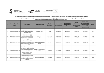 Lista projektów przyjętych do dofinansowania w ramach konkursu zamkniętego nr LRPO/2.2/1/2013 dla Działania 2.2 "Poprawa konkurencyjności małych i średnich przedsiębiorstw poprzez inwestycje" Priorytet II „Stymulowanie wzrostu inwestycji w przedsiębiorstwach i wzmocnienie potencjału innowacyjnego” Lubuskiego Regionalnego Programu Operacyjnego na lata 2007-2013 . Wartość wnioskowanego dofinansowania (PLN) Udział środków EFRR w całkowitej wartości projektu (co stanowi 85% dofinansowania) Punkty L.p. Numer referencyjny wniosku Tytuł projektu Nazwa Beneficjenta Siedziba Beneficjenta Całkowita wartość projektu (PLN) Wartość wydatków kwalifikowalnych (PLN) 1. RPLB.02.02.00-00-007/13 Rozwój przedsiębiorstwa Hemet poprzez wprowadzenie nowego produktu na rynek Hemet sp. z o.o. Żary 610 500,00 480 000,00 240 000,00 204 000,00 108 RPLB.02.02.00-08-026/13 Wdrożenie innowacyjnej technologii obróbki implantów kręgosłupowych wytworzonych technologią EBT LFC sp. z o.o. Czerwieńsk 735 000,00 735 000,00 367 500,00 312 375,00 106,5 3. RPLB.02.02.00-08-046/13 Wdrożenie do produkcji innowacyjnych produktów chemii gospodarczej na bazie własnych rozwiązań B+R Marba International Marek Bąbelek Racula 7 950 000,00 7 950 000,00 3 975 000,00 3 378 750,00 106,5 4. Wzrost konkurencyjności firmy PARTNER S.C poprzez wdrożenie nowej innowacyjnej technologii Partner s.c Krzysztof Knap, RPLB.02.02.00-08-049/13 procesowej i produktowej w Józef Wisniewski produkcji fototapet i innych dekoracji ściennych Wiechlice 2 379 433,36 1 869 400,00 934 700,00 794 495,00 106,5 5. Uruchomienie produkcji belek naczep ciężarowych za pomocą technologii nitowania radialnopunktowego Kożuchów 746 241,00 606 700,00 303 350,00 257 847,50 105,5 2. RPLB.02.02.00-08-027/13 WN INDUSTRY Sp.z. o.o 6. RPLB.02.02.00-08-030/13 Przedsiębiorstwo Wielobranżowe Luksusowe opakowania czyli PET MASTERCHEM Marcin jak szkło Wiśniewski Piotr Wasilewski SP.J 7. RPLB.02.02.00-08-050/13 Wdrożenie technik wirtualizacji w nowe dziedziny usług IT (Virtual Data Center) RPLB.02.02.00-08-012/13 Poprawa konkurencyjności formy Zakład Produkcyjno poprzez wdrożenie innowacji Usługowy Kazimierz Jońca procesowej i dywersyfikacje Sp.zo.o produkcji RPLB.02.02.00-08-043/13 Wdrożenie innowacyjnej technologii budowy murów oporowych zbrojonych geosiatką Allan Block RPLB.02.02.00-08-037/13 Nabycie automatycznej sortującej linii do produkcji okien PCV RPLB.02.02.00-08-040/13 Wzrost konkurencyjności Drukarni CHROMA na arenie międzynarodowej poprzez inwestycję w innowacyjną technologię druku cyfrowego RPLB.02.02.00-08-036/13 Wdrożenie innowacji technologicznych, procesowych i produktowych w firmie WEXPOL poprzez zakup maszyn 8. 9. 10. 11. 12. 13. RPLB.02.02.00-08-023/13 14. RPLB.02.02.00-00-002/13 Przylep 9 733 236,00 7 905 200,00 3 952 600,00 3 359 710,00 105,5 Nowa Sól 2 287 800,00 1 860 000,00 930 000,00 790 500,00 105 Międzyrzecz 832 710,00 677 000,00 338 500,00 287 725,00 104 Płoty 938 490,00 763 000,00 381 500,00 324 275,00 104 Świebodzin 2 460 000,00 2 000 000,00 1 000 000,00 850 000,00 103 Krzysztof Raczkowski CHROMA Drukarnia Żary 565 800,00 460 000,00 230 000,00 195 500,00 102,5 WEXPOOL Sp.z.o.o Dąbrówka Wielkopolska 3 554 700,00 2 890 000,00 1 445 000,00 1 228 250,00 102 Kostrzyń nad Odrą 3 874 500,00 3 150 000,00 1 575 000,00 1 338 750,00 100,5 Racula 633 450,00 515 000,00 257 500,00 218 875,00 100 Sinersio Polska Sp.zo.o Ziel-Bruk Makarewicz Edward Makarewicz Przedsiębiorstwo Produkcyjno Handlowo Usługowe „Okno-Nowe” Artur Chrzanowski, Artur Łazarewicz, Mirosław Wzmocnienie potencjału innowacyjnego Piekarni Bagietka Jack P.P.U.H Marek Robert w Kostrzynie poprzez Jackowski Piekarnia uruchomienie produkcji tzw. Bagietka pieczywa Clean Label na bazie nowatorskiej technologii fermentacji dzikich drożdży Modernizacja procesu produkcji Przedsiębiorstwo poprzez wdrożenie laserowej Elektrometalowe JS technologii wykrawania blach i INTEGRAL Sp. z.o.o profili 15. RPLB.02.02.00-08-013/13 Innowacyjne sterowanie numeryczne urządzenia do produkcji nowych wyrobów Przedsiębiorstwo Wielobranżowe ROLTEX Spółka z.o.o Brzezie 1 905 270,00 1 549 000,00 774 500,00 658 325,00 100 Gubin 2 357 110,50 1 916 350,00 958 175,00 814 448,75 100 16. RPLB.02.02.00-08-029/13 Rozwój przedsiębiorstwa poprzez wdrożenie innowacyjnej linii Produkcja Konstrukcji technologicznej do produkcji Metalowych Eksport-Import szczelnych kołowych przewodów Wioletta Poniatowska wentylacyjnych 17. RPLB.02.02.00-08-060/13 Dywersyfikacja produkcji Mestilu poprzez inwestycję w innowację procesową i produktową Zakład Mechaniczny Mestil Sp.z.o.o Gorzów Wlkp 2 198 969,40 1 767 780,00 883 890,00 751 306,50 98,5 18. RPLB.02.02.00-00-003/13 Budowa innowacyjnej linii technologicznej w celu wprowadzenia nowych ekologicznych produktów firmy BESTEM Bestem Sp.z.o.o Zbąszynek 4 920 000,00 4 000 000,00 2 000 000,00 1 700 000,00 96,5 19. RPLB.02.02.00-08-020/13 Innowacje w instalacjach sanitarnych Przedsiębiorstwo UsługowoHandlowe Sanitar Jan Kordacz Gorzów Wlkp 660 165,60 536 720,00 268 360,00 228 106,00 96,5 20. Innowacyjne produkty artykułów Prywatne Przedsiębiorstwo higienicznych dla segmentu AFH RPLB.02.02.00-00-010/13 Produkcyjno - Handlowe poprzez zmianę procesu LAMIX Mirosław Laszko technologicznego w PPP-H LAMIX Witnica 7 744 920,00 7 740 000,00 3 870 000,00 3 289 500,00 96,0 21. RPLB.02.02.00-08-048/13 Wdrożenie innowacyjnej technologii pozyskiwania energii cieplnej i elektrycznej z udziałem wodorowego generatora energii Czerwieńsk 1 179 570,00 959 000,00 479 500,00 407 575,00 96 22. Wdrożenie technologii gięcia blach o wysokiej wytrzymałości z I.M.C Engineering Poland RPLB.02.02.00-00-004/13 zastosowaniem prasy Sp. z.o.o krawędziowej Gorzów Wlkp 1 601 460,00 1 302 000,00 651 000,00 553 350,00 95 23. Wprowadzenie innowacyjnych metod wytwarzania blokowych znaków graficznych z różnych metali Szczaniec