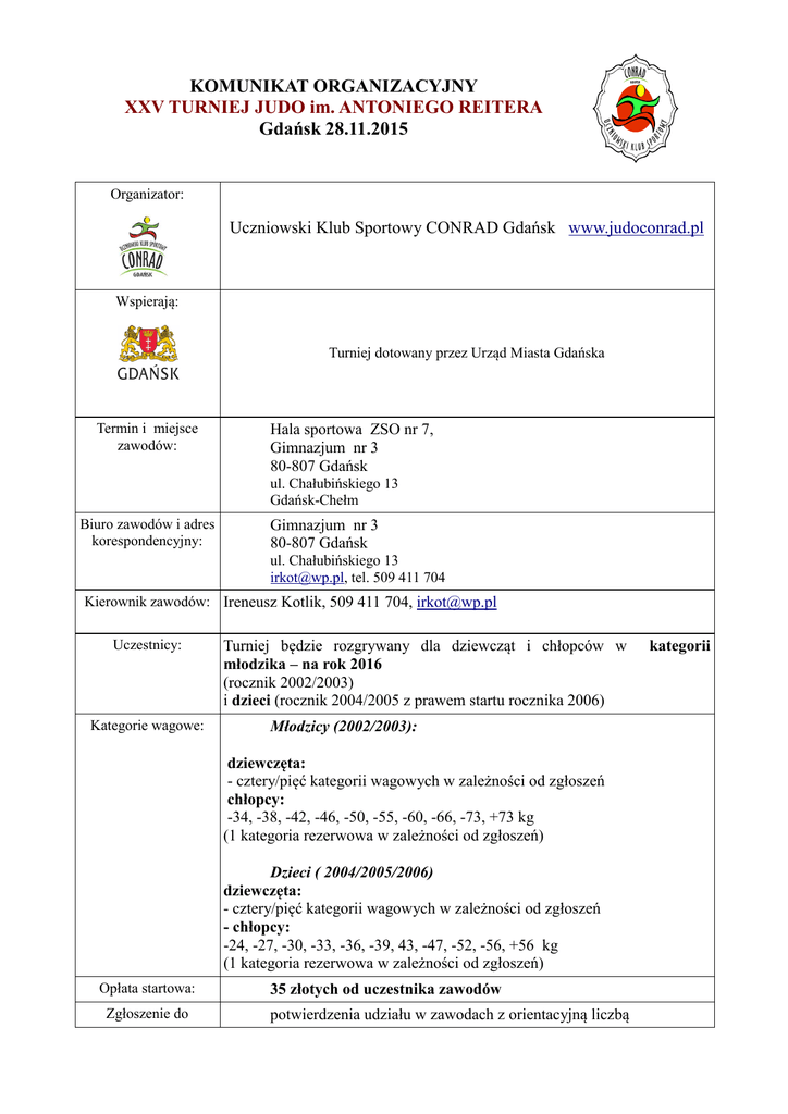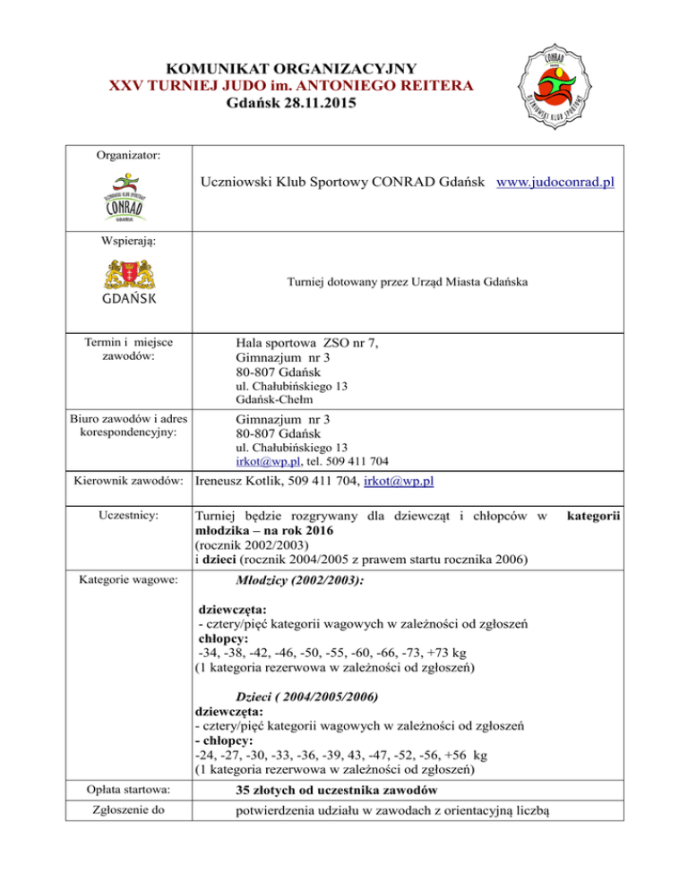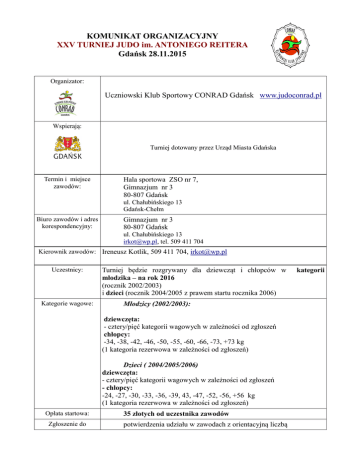 KOMUNIKAT ORGANIZACYJNY XXV TURNIEJ JUDO im. ANTONIEGO REITERA Gdańsk 28.11.2015 Organizator: Uczniowski Klub Sportowy CONRAD Gdańsk www.judoconrad.pl Wspierają: Turniej dotowany przez Urząd Miasta Gdańska Termin i miejsce zawodów: Hala sportowa ZSO nr 7, Gimnazjum nr 3 80-807 Gdańsk ul. Chałubińskiego 13 Gdańsk-Chełm Biuro zawodów i adres korespondencyjny: Gimnazjum nr 3 80-807 Gdańsk ul. Chałubińskiego 13 [email protected], tel. 509 411 704 Kierownik zawodów: Ireneusz Kotlik, 509 411 704, [email protected] Uczestnicy: Kategorie wagowe: Turniej będzie rozgrywany dla dziewcząt i chłopców w młodzika – na rok 2016 (rocznik 2002/2003) i dzieci (rocznik 2004/2005 z prawem startu rocznika 2006) Młodzicy (2002/2003): dziewczęta: - cztery/pięć kategorii wagowych w zależności od zgłoszeń chłopcy: -34, -38, -42, -46, -50, -55, -60, -66, -73, +73 kg (1 kategoria rezerwowa w zależności od zgłoszeń) Dzieci ( 2004/2005/2006) dziewczęta: - cztery/pięć kategorii wagowych w zależności od zgłoszeń - chłopcy: -24, -27, -30, -33, -36, -39, 43, -47, -52, -56, +56 kg (1 kategoria rezerwowa w zależności od zgłoszeń) Opłata startowa: Zgłoszenie do 35 złotych od uczestnika zawodów potwierdzenia udziału w zawodach z orientacyjną liczbą kategorii zawodów: zawodników prosimy przesyłać na meila [email protected] do 25.11.2015 roku Ważenie : WAGA- DZIECI - badania lekarskie w dniu zawodów godz. 9.00 –10.00 WAGA- MŁODZIK - badania lekarskie w dniu zawodów godz. 13.00 –14.00 Program zawodów: Losowanie i weryfikacja W dniu zawodów godz. 10.00. - 11.15 Walki eliminacyjne w kategorii dzieci po zakończonej weryfikacji. Otwarcie turnieju: Dzieci, młodzicy godzina 13.00 walki finałowe, dekoracja w grupie dzieci. Walki młodzików po zakończeniu dekoracji dzieci, ok. godziny 15.00 Ilość mat: System rozgrywek: Nagrody: Zawody przeprowadzone zostaną na czterech matach. Do dwóch walk przegranych, system grupowy do sześciu zawodników. Indywidualne za miejsca I, II, III,V dyplomy, medale, nagrody rzeczowe; Drużynowo za I, II, III,IV,V – puchary i w klasyfikacji łącznej medalowej. Złoto 5 pkt srebro 3 pkt brąz 1 pkt W systemie grupowym do sześciu zawodników: złoto 3 pkt srebro 2pkt brąz 1 pkt Sprawy sporne: W sprawach spornych decyduje sędzia główny zawodów i organizator.