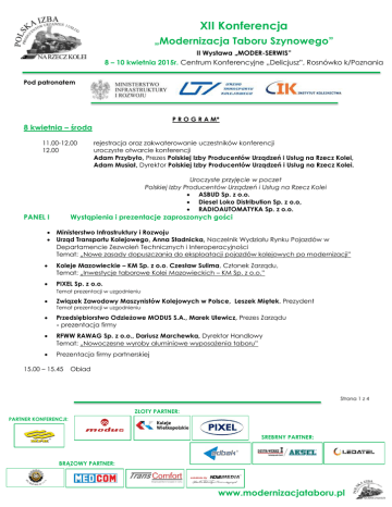 XII Konferencja „Modernizacja Taboru Szynowego” II Wystawa „MODER-SERWIS” 8 – 10 kwietnia 2015r. Centrum Konferencyjne „Delicjusz”, Rosnówko k/Poznania Pod patronatem P R O G R A M* 8 kwietnia – środa 11.00-12.00 12.00 rejestracja oraz zakwaterowanie uczestników konferencji uroczyste otwarcie konferencji Adam Przybyło, Prezes Polskiej Izby Producentów Urządzeń i Usług na Rzecz Kolei, Adam Musiał, Dyrektor Polskiej Izby Producentów Urządzeń i Usług na Rzecz Kolei. Uroczyste przyjęcie w poczet Polskiej Izby Producentów Urządzeń i Usług na Rzecz Kolei ASBUD Sp. z o.o. Diesel Loko Distribution Sp. z o.o, RADIOAUTOMATYKA Sp. z o.o. PANEL I Wystąpienia i prezentacje zaproszonych gości Ministerstwo Infrastruktury i Rozwoju Urząd Transportu Kolejowego, Anna Stadnicka, Naczelnik Wydziału Rynku Pojazdów w Departamencie Zezwoleń Technicznych i Interoperacyjności Temat: „Nowe zasady dopuszczania do eksploatacji pojazdów kolejowych po modernizacji” Koleje Mazowieckie – KM Sp. z o.o. Czesław Sulima, Członek Zarządu, Temat: „Inwestycje taborowe Kolei Mazowieckich – KM Sp. z o.o.” PIXEL Sp. z o.o. Temat prezentacji w uzgodnieniu Związek Zawodowy Maszynistów Kolejowych w Polsce, Leszek Miętek, Prezydent Przedsiębiorstwo Odzieżowe MODUS S.A., Marek Ulewicz, Prezes Zarządu - prezentacja firmy RFWW RAWAG Sp. z o.o., Dariusz Marchewka, Dyrektor Handlowy Temat: „Nowoczesne wyroby aluminiowe wyposażenia taboru” Prezentacja firmy partnerskiej Temat prezentacji w uzgodnieniu 15.00 – 15.45 Obiad Strona 1 z 4 ZŁOTY PARTNER: PARTNER KONFERENCJI: SREBRNY PARTNER: BRĄZOWY PARTNER: www.modernizacjataboru.pl 16.00 – 18.00 PANEL II LEDATEL Sp. z o.o. i Wspólnicy Sp. K. Instytut Kolejnictwa, Andrzej Żurkowski , Dyrektor Instytutu Kolejnictwa Temat: „Modernizacja taboru kolejowego do przewozów pasażerskich jako element nowoczesnej oferty przewozowej” Novamedia innovision Sp. z o.o., Eryk Woźniak, Dyrektor Sprzedaży AKSEL Sp. z o.o./ DEUTA WERKE Temat: „Systemy Deuta-Werke i AKSEL w zakresie bezpieczeństwa i ergonomii zarządzania taborem” Szybka Kolej Miejska Sp. z o.o., Agata Bogucka, Inspektor ds. Technicznych Temat: : „Modernizacja taboru Szybkiej Kolei Miejskiej na przestrzeni 10 lat funkcjonowania” PUT GRAW Sp. z o.o., Juliusz Grabczyk, Prezes. Temat: „Pomiar parametrów geometrycznych kół taboru” Diesel Loko Distribution Sp. z o.o, Grzegorz Zemla, Prezes Zarządu Temat: „Zastosowanie nowoczesnych rozwiązań w modernizacji wózków taboru kolejowego starszej generacji - prezentacja produktów firmy Miller Ingenuity” Temat prezentacji w uzgodnieniu Temat prezentacji w uzgodnieniu PANEL DYSKUSYJNY 18.15 „Kupować czy modernizować ?” Prowadzący Bartłomiej Buczek, Ekspert Izby Członek Zarządu, PKP Szybka Kolej Miejska w Trójmieście Sp. z o.o. Przedsiębiorstwo Odzieżowe MODUS S.A. – pokaz „Modny Uniform” 20.00 Uroczysta kolacja z udziałem zaproszonych gości 9 kwietnia – czwartek 7.00 – 8.30 9.00 9.00 9.25 Śniadanie PANEL III - WYJAZD STUDYJNY Zbiórka przed hotelem Odjazd FRANOWO - Zajezdnia Miejskiego Przedsiębiorstwa Komunikacji w Poznaniu 14.00 – 15.00 15.30 – 18.30 Obiad w hotelu PANEL IV CoRAIL Sp. z o.o. Piotr Kozłowski, Kierownik Sprzedaży Temat: „Modernizacja zaplecza technicznego i optymalizacja procesów obsługowych” Miejskie Przedsiębiorstwo Komunikacji w Poznaniu, Wojciech Tulibacki, Prezes Zarządu Temat: „MPK Poznań wczoraj i dziś” Strona 2 z 4 ZŁOTY PARTNER: PARTNER KONFERENCJI: SREBRNY PARTNER: BRĄZOWY PARTNER: www.modernizacjataboru.pl EDBAK Sp. z o.o. Paweł Jaskowiak, Menadżer ds. Handlu Temat: „EDBAK sp. z o.o. - producent części metalowych dla branży kolejowej” Koleje Wielkopolskie Sp. z o.o., Włodzimierz Wilkanowicz, Prezes Zarządu Temat: „Doświadczenia przewoźnika w procesach serwisowania pojazdów kolejowych” SOSNOWSKI Sp. z o.o. Sp.K. Temat: „Nowoczesne wyposażenie hal obsługi taboru kolejowego na przykładzie zrealizowanych inwestycji” Przewozy Regionalne Sp. z o.o. – Dariusz Liszewski, Członek Zarządu, Temat: „Standaryzacja taboru eksploatowanego przez przewoźników pasażerskich” HEICO Poland Sp.z o.o. Krzysztof Włodarz, Dyrektor Generalny Temat: „Jak skutecznie rozwiązać problem luzujących się śrub i nakrętek” PKP Szybka Kolej Miejska w Trójmieście Sp. z o.o., Sławomir Pipke, Dyrektor ds. Eksploatacji Temat: „Eksploatacja zmodernizowanych EZT PKP Szybkiej Kolei Miejskiej w Trójmieście” ENTE Sp. z o.o. ,Maciej Wszołek , Menedżer ds. Współpracy Partnerskiej Temat: „Praktyczne wykorzystanie nowoczesnych technologii w transporcie szynowym” Warszawska Kolej Dojazdowa Sp. z o.o., Łukasz Łyszkowski, Technolog, Wydział Napraw i Utrzymania Taboru Temat: „Inwestycje taborowe związane ze zmianami napięcia zasilania sieci trakcyjnej” 20.00 Plenerowe grillowanie z atrakcjami – ogród grillowy w hotelu „Delicjusz” „Fireshow w podniebnej perspektywie” (strój nieformalny) 23.00 Wieczór klubowy oraz bowling – bilard. 10 kwietnia – piątek 7.30 – 9.00 10.00 Śniadanie PANEL V Łódzka Kolej Aglomeracyjna Sp. z o.o., Andrzej Wasilewski, Prezes Zarządu Temat: „Utrzymanie taboru Łódzkiej Kolei Aglomeracyjnej w nowoczesnym Zapleczu Utrzymania Łódź Widzew” HellermannTyton GmbH, Paweł Petykiewicz, Railway Market Specialist Temat: „Nowoczesne rozwiązania zarządzania okablowaniem w pojazdach szynowych na bazie produktów HellermannTyton” Prezentacja firm z branży PKP Szybka Kolej Miejska w Trójmieście Sp. z o.o., Bartłomiej Buczek, Członek Zarządu, Dyrektor ds. Przewozów Temat: „Modelowe rozwiązania w zakresie utrzymania taboru kolejowego” 11.00 – 11.30 Dyskusja oraz podsumowanie konferencji Strona 3 z 4 ZŁOTY PARTNER: PARTNER KONFERENCJI: SREBRNY PARTNER: BRĄZOWY PARTNER: www.modernizacjataboru.pl Losowanie upominków wśród uczestników konferencji WY
