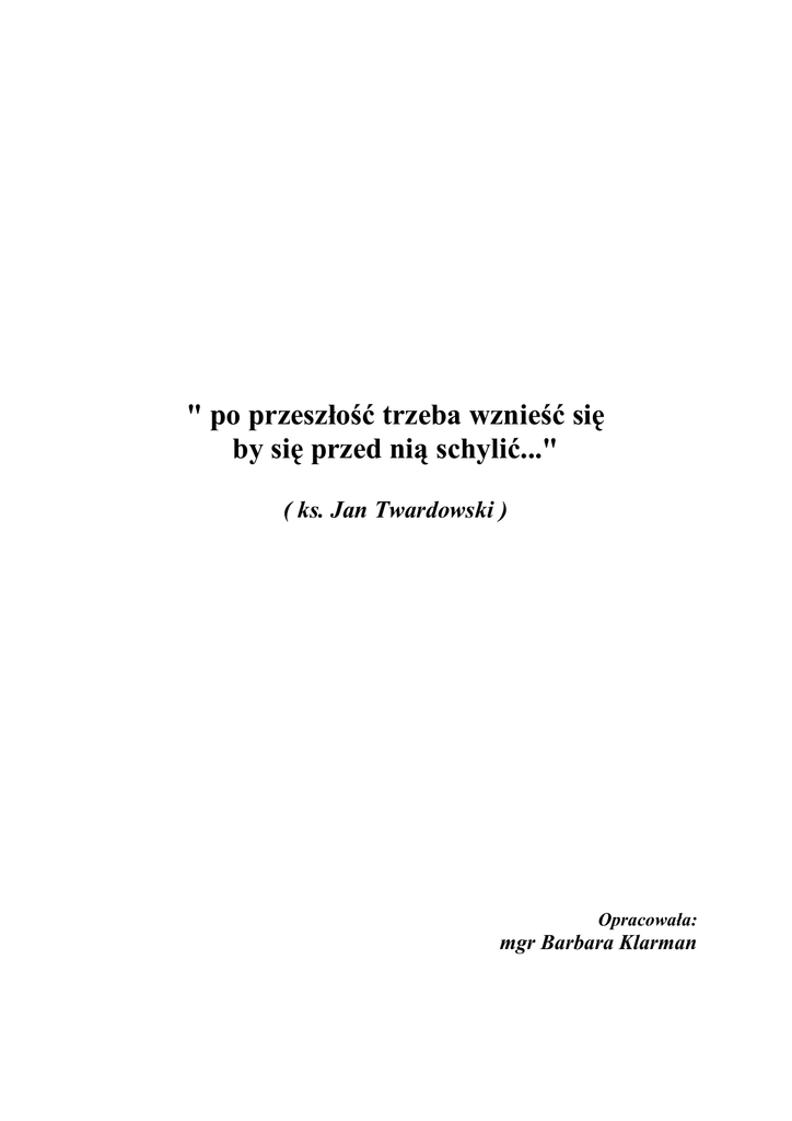 " po przeszłość trzeba wznieść się by się przed nią schylić..." ( ks. Jan Twardowski ) Opracowała: mgr Barbara Klarman KALENDARIUM DZIEJÓW PUBLICZNEJ SZKOŁY PODSTAWOWEJ W BARANOWIE SANDOMIERSKIM • 1816 R. - Zostaje założona na mocy dekretu gubernialnego przez Annę z Potockich Krasicką jednoklasowa szkoła ludowa w Baranowie nad Wisłą; jej pierwszym nauczycielem został Jakub Arciszewski . • 1889 R. - Następuje przekształcenie baranowskiej szkoły ludowej z 1- klasowej w 3 - klasową ; jej tymczasowym kierownikiem zostaje Ludwik Napoleon Wnękowski. • 1897 R. - Przemianowanie 3- klasowej szkoły etatowej na 4 klasową pospolitą szkołę ludową mieszaną w Baranowie Galicyjskim; jej stałym kierownikiem został Piotr Bara. • 1910 R. - Rozpoczęcie budowy nowego budynku szkolnego dla baranowskiej szkoły ludowej z inicjatywy Ludwika Napoleona Wnękowskiego - nowego kierownika szkoły i Jana Solaka - ówczesnego proboszcza. • 1912 R. - Oddanie do użytku nowego , piętrowego budynku szkolnego dla szkoły powszechnej w Baranowie Galicyjskim. • 1914 - 1918 - Zamiana budynku szkolnego na kwatery i szpital wojskowy dla żołnierzy armii austriackiej i rosyjskiej . • 1919 R. - Rozpoczęcie roku szkolnego 1919/ 1920 w baranowskiej szkole po raz pierwszy w wolnej i niepodległej Polsce. • 1921 R. - Wprowadzenie do baranowskiej szkoły ludowej dodatkowej klasy - klasy piątej. • 1924 R. - Reorganizacja Trywialnej Szkoły Powszechnej w Baranowie Galicyjskim z 5 - klasowej w 7 - klasową. • 1939 R. - Przekształcenie budynku szkolnego na • • • • • • • • • • prowizoryczny szpital wojskowy dla polskich żołnierzy z Armii " Kraków", a później na kwatery dla niemieckich oddziałów Werhmahtu. 1939 - 1944 - Prowadzenie podczas okupacji hitlerowskiej zajęć lekcyjnych w 6- klasowej szkole powszechnej poza budynkiem szkolnym na terenie miasta. 1944 R. - Rozpoczęcie z dniem 1 września na nowo zajęć lekcyjnych w budynku szkolnym po okupacji niemieckiej ; kierownikiem szkoły jest Stanisław Wołoszyński . 1962 R. - Zatwierdzenie planów budowy nowego budynku szkolnego z państwowych funduszy i wyznaczenie terminu jego budowy. 1963 R. - Przekształcenie baranowskiej szkoły podstawowej z 7- klasowej na 8 -klasową w związku z reorganizacją polskiego systemu oświaty. 1966 R. - Rozpoczęcie budowy nowego budynku szkolnego tzw. " tysiąclatki" w Baranowie Sandomierskim. 1966 R. - Przekazanie do użytku nowego budynku szkolnego tzw. " baranowskiej tysiąclatki" społeczności szkolnej. 1968 R. - Objęcie stanowiska kierownika baranowskiej szkoły podstawowej przez Józefa Ramockiego. 1971 R. - Powstanie Zbiorczej Szkoły Gminnej ze szkołami podstawowymi w Baranowie Sandomierskim, Skopaniu Fabrycznym, Woli Baranowskiej, Knapach, Durdach, Dąbrowicy, Ślęzakach i Łążku. 1973 R. - Rozpoczęcie budowy przewiązki łączącej obydwa budynki szkolne. 1976 R. - Zakończenie gruntownego remontu tzw. " starej szkoły" i oddanie do użytku przewiązki szkolnej. • 1982 R. - Objęcie stanowiska dyrektora w baranowskiej szkole podstawowej przez Edmunda Janasa . • 1984 R. - Stanowisko dyrektora w miejscowej szkole • • • • • • • • • • podstawowej obejmuje Józefa Lis. 1985 R. - nowym dyrektorem w Szkole Podstawowej w Baranowie Sandomierskim zostaje Maria Trembecka. 1989 R. - Nowym dyrektorem w szkole podstawowej jest Janina Kurzępa. 1990 - 1991 - wybór Aliny Lis na nowego dyrektora baranowskiej szkoły podstawowej i zatwierdzenie jej na stanowisku przez władze kuratoryjne. 1993 R. - wykonanie ex librisu dla Szkoły Podstawowej w Baranowie Sandomierskim przez Jana Panka szkolnego matematyka i plastyka. 1996 R. - Rozpoczęcie budowy miejskiej hali sportowej na terenie otoczenia baranowskiej szkoły podstawowej. 1998 R. - Uroczyste otwarcie hali sportowej i oddanie jej do użytku dla społeczności miasta i gminy Baranów Sandomierski. 1999 R. - Przekształcenie 8 - wydziałowej Szkoły Podstawowej w 6 - wydziałową Publiczną Szkołę Podstawową w Baranowie Sandomierskim. Objęcie stanowiska dyrektora przez Eugenię Kołek. Otrzymanie dla szkoły od MEN kompleksowo wyposażonej pracowni komputerowo- internetowej. 2000 R. - Zakończenie ostatniego roku szkolnego w XX wieku i II tysiącleciu. Pożegnanie rocznika ostatnich ośmioklasistów w historii baranowskiej szkoły podstawowej. 2005 R. – Na mocy uchwały Rady Miejskiej w Baranowie Sandomierskim Publiczna Szkoła Podstawowa staje się częścią nowej placówki oświatowej na terenie miasta – Zespołu Szkół i Placówek w Baranowie Sandomierskim 2007 R. – Publiczna Szkoła Podstawowa otrzymuje Patrona i sztandar- nadanie imienia Księdza Jana Twardowskiego. KIEROWNICY I DYREKTORZY W HISTORII BARANOWSKIEJ SZKOŁY PODSTAWOWEJ 1/ JAKUB ARCISZEWSKI - Kierownik Szkoły Ludowej w Baranowie Galicyjskim w latach 1816 - 1856. 2/ FRANCISZEK NIKLAS - Kierownik Trywialnej Szkoły Ludowej w Baranowie Galicyjskim w latach 1856 - 1889. 3/ LUDWIK NAPOLEON WNĘKOWSKI - Tymczasowy kierownik Trywialnej Szkoły Ludowej w Baranowie Galicyjskim w latach 1889 - 1890. Kierownik Trywialnej Szkoły Ludowej w latach 1908 - 1932. 4/ PIOTR BARA - Kierownik Szkoły Ludowej w Baranowie Galicyjskim w latach 1890 - 1908. 5/ JANINA WNĘKOWSKA - Tymczasowy kierownik baranowskiej Szkoły Powszechnej w latach 1932 - 1933. 6/ STANISŁAW WOŁOSZYŃSKI - Kierownik Publicznej Szkoły Powszechnej w Baranowie Sandomierskim w latach 1933 - 1968. 7/ JÓZEF RAMOCKI -Kierownik Szkoły Podstawowej w Baranowie Sandomierskim w latach 1968 - 1971. Dyrektor Szkoły Podstawowej w Baranowie Sandomierskim w latach 1971 - 1982. 8/ EDMUND JANAS - Dyrektor Szkoły Podstawowej w Baranowie Sandomierskim w latach 1982 1984. 9/ JÓZEFA LIS - Dyrektor Szkoły Podstawowej w Baranowie Sandomierskim w latach 1984 - 1985. 10/ MARIA TREMBECKA - Dyrektor Szkoły Podstawowej w Baranowie Sandomierskim w latach 1985 - 1989. 11/ JANINA 