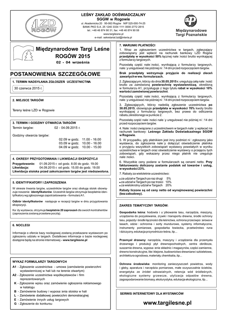 LEŚNY ZAKŁAD DOŚWIADCZALNY SGGW w Rogowie ul. Akademicka 20 95-063 Rogów NIP 525-000-74-25 BANK PKO S.A. 25 1240 3334 1111 0000 2772 2815 tel.: +48 46 874 90 31, fax: +48 46 874 90 08 www.targilesne.pl e-mail: [email protected] Międzynarodowe Targi Leśne ROGÓW 2015 02 - 04 września POSTANOWIENIA SZCZEGÓŁOWE 1. TERMIN NADSYŁANIA ZGŁOSZEŃ UCZESTNICTWA 30 czerwca 2015 r. Międzynarodowe Targi Poznańskie 7. WARUNKI PŁATNOŚCI 1. Wraz ze zgłoszeniem uczestnictwa w targach, zgłaszający zobowiązany jest wpłacić na rachunek bankowy LZD Rogów przedpłatę w wysokości 50% łącznej należności brutto wynikającej z formularzy targowych. Pozostałą część należności, wynikającą z formularzy targowych, należy uregulować nie później niż 14 dni przed rozpoczęciem targów. Brak przedpłaty wstrzymuje przyjęcie do realizacji zleceń zawartych w ww. formularzach. 2. Zgłaszającym, którzy do dnia 30.05.2015 r. uregulują całą należność brutto za zamówioną powierzchnię wystawienniczą, określoną w formularzu A1, przysługuje z tego tytułu rabat w wysokości 10% wartości zamówionej powierzchni. Pozostałą część należności, wynikającą z formularzy targowych, należy uregulować nie później niż 14 dni przed rozpoczęciem targów. 2. MIEJSCE TARGÓW Tereny leśne LZD w Rogowie 3. Zgłaszających, którzy nadeślą zgłoszenie uczestnictwa po 30.05.2015, obowiązuje przedpłata w wysokości 70% kwoty brutto wynikającej z formularzy targowych, bez prawa do odliczenia rabatu,określonego w punkcie 2. 3. TERMIN I GODZINY OTWARCIA TARGÓW Pozostałą część należności należy uregulować nie później niż 14 dni przed rozpoczęciem targów. Termin targów: 02 - 04.09.2015 r. Godziny otwarcia targów: 02.09 w godz. 11.00 - 16.00 03.09 w godz. 10.00 - 16.00 04.09 w godz. 10.00 - 15.00 4. OKRESY PRZYGOTOWANIA I LIKWIDACJI EKSPOZYCJI Przygotowanie: 01.09.2015 r. od godz. 8.00 do godz. 19.00 Likwidacja: 04.09.2015 r. od godz. 15.00 do godz. 19.00 Likwidacja stoiska przed zakończeniem targów jest niedozwolona. 5. IDENTYFIKATORY I ZAPROSZENIA W okresie trwania targów, uczestników targów oraz obsługę stoisk obowiązuje noszenie identyfikatorów. Uczestnik targów otrzymuje bezpłatnie identyfikatory wg zgłoszonego zapotrzebowania – formularz A1. 4. Należności związane z uczestnictwem w targach należy wpłacać na rachunek bankowy: Leśnego Zakładu Doświadczalnego SGGW w Rogowie. 5. W przypadku, gdy płatnikiem jest inny podmiot niż zgłoszony jako wystawca, do zgłoszenia należy dołączyć oświadczenie płatnika o przyjęciu wszystkich zobowiązań wystawcy powstałych w wyniku uczestnictwa w targach oraz oświadczenie wystawcy o przejęciu tych zobowiązań, gdy wskazany przez niego płatnik nie ureguluje należności. 6. Wszystkie ceny podane w formularzach są cenami netto. Przy fakturowaniu doliczony zostanie podatek od towarów i usług, w wysokości 23%. 7. Rabaty za wieloletnie uczestnictwo: ! za udział w Targach po raz drugi 5% ! za udział w Targach po raz trzeci 10% ! za wielokrotny udział w Targach 20% Rabaty liczone są od ceny netto od wynajmowanej powierzchni (bez zabudowy). Odbiór identyfikatorów następuje w recepcji targów w dniu przygotowania ekspozycji. Każdy wystawca, otrzymuje bezpłatnie 20 zaproszeń dla swoich kontrahentów (zaproszenia zostaną przesłane pocztą). 6. NOCLEGI Informacje o ofercie bazy noclegowej zostaną przekazane wystawcom po zgłoszeniu udziału w targach. Dodatkowo informacje o bazie noclegowej dostępne będą na stronie internetowej – www.targilesne.pl WYKAZ FORMULARZY TARGOWYCH A1 - Zgłoszenie uczestnictwa - umowa (zamówienie powierzchni wystawienniczej w hali lub na terenie otwartym) A2 - Zgłoszenie uczestnictwa współwystawców i firm reprezentowanych K - Zgłoszenie wpisu oraz zamówienie ogłoszenia reklamowego w katalogu B - Zamówienie budowy i wyposażenia stoiska w hali L - Zamówienie dodatkowej powierzchni demonstracyjnej E - Zamówienie innych usług targowych G - Zgłoszenie do konkursu ZAKRES TEMATYCZNY TARGÓW: Gospodarka leśna: hodowla i użytkowanie lasu, narzędzia, maszyny, urządzenia do pozyskiwania, zrywki i transportu drewna, środki ochrony lasu, pojazdy i środki łączności dla leśnictwa, ochrona przeciwpożarowa w lasach, odzież ochronna i sorty mundurowe, systemy informatyczne, instrumenty pomiarowe, gospodarka łowiecka, przetwórstwo runa i dziczyzny, edukacja przyrodniczo-leśna, itp... Przemysł drzewny: narzędzia, maszyny i urządzenia dla przemysłu drzewnego i produkcji płyt drewnopochodnych, centra obróbcze, suszarnie drewna, wyposażenie składnic i magazynów, części zamienne, drewno konstrukcyjne, lite i klejone, budownictwo drewniane i szkieletowe, architektura ogrodowa, materiały, chemikalia, itp... Ochrona środowiska: monitoring zanieczyszczeń powietrza, wody i gleby, aparatura i narzędzia pomiarowe, małe oczyszczalnie ścieków, energetyka ze źródeł odnawialnych, retencja wód śródleśnych, ekologiczne systemy grzewcze, utylizacja odpadów drewna, zagospodarowanie biomasy, ekoturystyka, edukacja ekologiczna, itp... SERWIS INTERNETOWY DLA WYSTAWCÓW www.targilesne.pl REGULAMIN Dla uczestników imprez targowych organizowanych przez LEŚNY ZAKŁAD DOŚWIADCZALNY w ROGOWIE 1. Postanowienia ogólne. 1.1. Użyte w Regulaminie określenia oznaczają: a) LZD - organizator targów: Międzynarodowe Targi Leśne Rogów 2015 b) Wystawca - każdy uczestnik targów c) targi - imprezy targowe, wystawy itp. organizowane przez LZD d) zgłoszenie - umowa uczestnictwa w targach e) Regulamin - regulamin dla uczestników targów organizowanych przez LZD 1.2. Przepisy niniejszego Regulaminu dotyczą uczestnictwa w targach organizowanych przez LZD i obowiązują wszystkich Wystawców. 1.3. Regulamin stanowi integralną część umowy o uczestnictwie w targach. 1.4. Postanowienia szczegółowe ustalane przez LZD odrębnie dla poszczególn