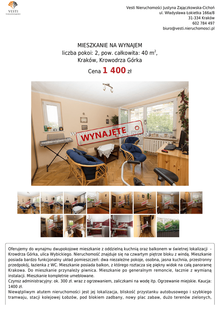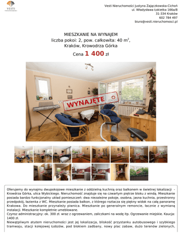 Vesti Nieruchomości Justyna Zajączkowska-Cichoń ul. Władysława Łokietka 166a/8 31-334 Kraków 602 784 497 [email protected] MIESZKANIE NA WYNAJEM liczba pokoi: 2, pow. całkowita: 40 m2, Kraków, Krowodrza Górka Cena 1 400 zł Oferujemy do wynajmu dwupokojowe mieszkanie z oddzielną kuchnią oraz balkonem w świetnej lokalizacji Krowdrza Górka, ulica Wybickiego. Nieruchomość znajduje się na czwartym piętrze bloku z windą. Mieszkanie posiada bardzo funkcjonalny układ pomieszczeń: dwa niezależne pokoje, osobna, jasna kuchnia, przestronny przedpokój, łazienka z WC. Mieszkanie posiada balkon, z którego roztacza się piękny widok na całą panoramę Krakowa. Do mieszkanie przynależy piwnica. Mieszkanie po generalnym remoncie, łacznie z wymianą instalacji. Mieszkanie kompletnie umeblowane. Czynsz administracyjny: ok. 300 zł. wraz z ogrzewaniem, zaliczkami na wodę itp. Ogrzewanie miejskie. Kaucja: 1400 zł. Niewątpliwym atutem nieruchomości jest jej lokalizacja, bliskość przystanku autobusowego i szybkiego tramwaju, stacji kolejowej Łobzów, pod blokiem zadbany, nowy plac zabaw, dużo terenów zielonych, Vesti Nieruchomości Justyna Zajączkowska-Cichoń ul. Władysława Łokietka 166a/8 31-334 Kraków 602 784 497 [email protected] rozwinięta infrastruktura: sklepy, szkoły, przedszkola, hipermarkety.Mieszkanie idealne zarówno dla młodych ludzi, jak i rodziny. Gorąco polecam i zapraszam na prezentacje. Symbol 235/VST/MW Typ nieruchomości MIESZKANIE Województwo MAŁOPOLSKIE Gmina Kraków Miejscowość Kraków Dzielnica - osiedle Krowodrza Górka Ulica Wybickiego Cena 1 400 PLN Pow. całkowita 40,00 m2 Cena za m2 35,00 PLN Cena negocjowana NIE Czynsz i inne opłaty stałe 300,00 PLN Kaucja 1 400,00 PLN Rodzaj mieszkania 2-POKOJOWE Liczba pięter 10 Piętro 4 Liczba pokoi 2 Rodzaj budynku WIEŻOWIEC Standard BARDZO DOBRY Typ kuchni Z OKNEM, ODDZIELNA Wyposażenie kuchni PEŁNE Stan łazienki DOBRY Umeblowanie PEŁNE Źródło c.w. SIEĆ MIEJSKA Ogrzewanie C.O. Z SIECI MIEJSKIEJ Podpiwniczenie /piwnica PIWNICA Stan instalacji PO WYMIANIE Winda w nieruchomości JEST Rodzaj okien PLASTIKOWE Rodzaj podłogi PARKIET Balkon JEST Widok na zachód JEST Nr Licencji 13491 Justyna Zajączkowska-Cichoń Pośrednik w obrocie nieruchomościami 602 784 497 [email protected] Więcej ofert na stronie www.vesti.nieruchomosci.pl