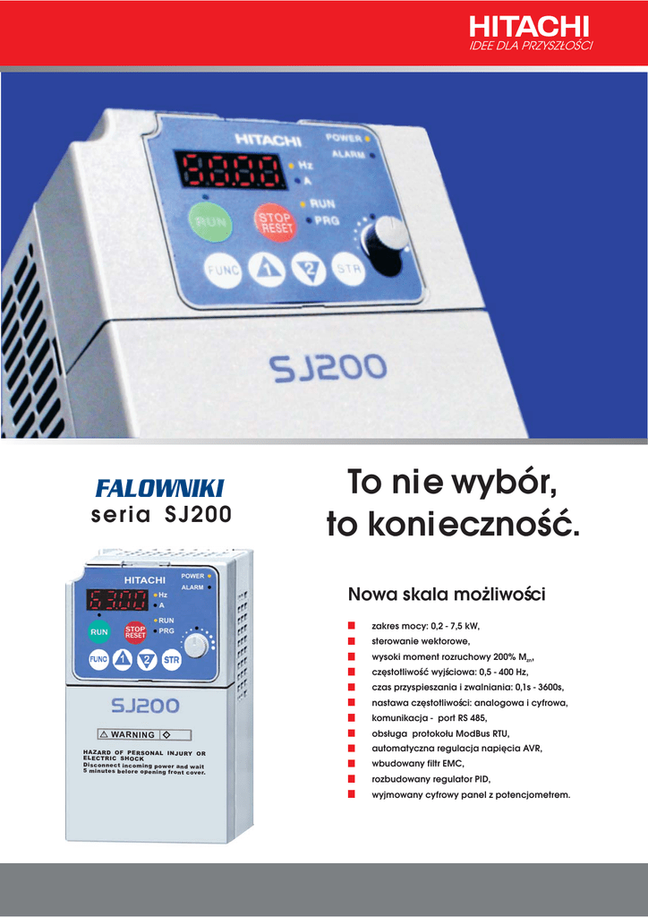IDEE DLA PRZYSZ£OŒCI FALOWNIKI seria SJ200 To nie wybór, to koniecznoœæ. Nowa skala mo¿liwoœci zakres mocy: 0,2 - 7,5 kW, sterowanie wektorowe, wysoki moment rozruchowy 200% Mzn, czêstotliwoœæ wyjœciowa: 0,5 - 400 Hz, czas przyspieszania i zwalniania: 0,1s - 3600s, nastawa czêstotliwoœci: analogowa i cyfrowa, komunikacja - port RS 485, ! WARNING ! HAZARD OF PERSONAL INJURY OR ELECTRIC SHOCK Disconnec t incoming power and wait 5 minutes belore opening front cover. obs³uga protoko³u ModBus RTU, automatyczna regulacja napiêcia AVR, wbudowany filtr EMC, rozbudowany regulator PID, wyjmowany cyfrowy panel z potencjometrem. Dane techniczne falowników: IDEE DLA PRZYSZ£OŒCI seria SJ200 NFE Model Maksymalna moc wspó³pracuj¹cego silnika [kW] HFE 002 004 005 007 011 015 022 004 007 015 022 030 040 055 075 0,2 0,4 0,55 0,75 1,1 1,5 2,2 0,4 0,75 1,5 2,2 3,0 4,0 5,5 7,5 1-fazowe: 180 ÷ 252V f= 47 ÷ 63Hz Znamionowe napiêcie zasilania 3-fazowe: 342 ÷ 506V f=47 ÷ -63Hz 3-fazowe: 180 ÷ 252V f= 47 ÷ 63Hz 3-fazowe: 200 ÷ 240V (w powi¹zaniu z napiêciem wejœciowym) Znamionowe napiêcie wyjœciowe 3-fazowe: 380 ÷ 460V (w powi¹zaniu z napiêciem wejœciowym) Znamionowy pr¹d wejœciowy [A] (jednofazowy/trójfazowy) 3,5/2.0 5,8/3.4 6,7/3.9 9,0/5.2 11,2/6.5 17,5/10.0 24,0/14.0 2,0 3,3 5,0 7,0 10,0 11,0 16,5 20,0 Znamionowy pr¹d wyjœciowy [A] 1,6 2,6 3,0 4,0 5,0 8,0 11,0 1,5 2,5 3,8 5,5 7,8 8,6 13,0 16,0 200% Mzn ju¿ przy 1Hz bez autostrojenia Moment rozruchowy ~100% Bez opornika Moment hamuj¹cy ~20% ~100% ~150% Z opornikiem ~70% ~20% ~150% ~100% Hamowanie pr¹dem sta³ym rozpoczyna siê po zwolnieniu silnika do fmin Parametry hamowania ustawiane przy pomocy pulpitu cyfrowego (czêstotliwoœæ minimalna, czas hamowania oraz si³a hamuj¹ca) Pr¹dem sta³ym Wymiary [mm] ~70% Szerokoœæ 80 110 110 180 Wysokoœæ 140 155 155 220 G³êbokoœæ Masa [kg] 103 117 139 0,70 0,80 1,3 166 2,3 166 139 2,8 1,7 1,3 155 2,8 5,5 5,7 Nadnapiêciowe. Parametry sygna³u wyjœciowego falownika Podnapiêciowe. Czêstotliwoœæ wyjœciowa 0.5 - 400Hz Charakterystyka sterowania U/f Sta³omomentowa lub o momencie zredukowanym oraz sterowanie wektorowe (SLV). Nadpr¹dowe. Przeci¹¿eniowe. Zaniku napiêcia zasilania. Zabezpieczenia B³¹d doziemienia (przed startem). Cyfrowa Pulpit cyfrowy, listwa Analogowa Potencjometr, listwa Cyfrowa ±0.01% fmax Automatyczne ograniczenie czêstotliwoœci kluczowania tranzystorów. Analogowa ±0.2% fmax Wyjmowany. Termiczne. Nastawa czêstotliwoœci Obni¿anie napiêcia przy przekroczeniu zadanego pr¹du. Optymalizacja hamowania w celu unikniêcia generatorowej pracy silnika. Dok³adnoœæ regulacji czêstotliwoœci wyjœciowej Port RS-485 obs³uguj¹cy ModBus RTU. Rozdzielczoœæ czêstotliwoœci Nastawa cyfrowa - 0.01Hz Nastawa analogowa fmax/1000 Ograniczenie czêstotliwoœci wyjœciowej Programowane poziomy od do³u i góry. Czas przyspieszania i zwalniania Od 0,1s do 3600s wg charakterystyki liniowej lub nieliniowej. Dostêpne dwa zestawy nastaw. Przyciski (RUN, STOP, FUNCTION, 1, 2, STR). Panel WskaŸniki LED statusu pracy. Potencjometr. Autotuning. Listwa steruj¹ca Wejœcia Wyjœcia Wyœwietlacz. Automatyczna regulacja napiêcia. FW - ruch w przód start/stop, RV - ruch w ty³ start/stop, CF1-CF4 - wielopoziomowa nastawa prêdkoœci, JG - bieg próbny, 2CH - drugi zestaw czasów przyspieszania i zwalniania, FRS - wybieg, EXT - wy³¹cznik zewnêtrzny, RS - reset, SFT - zablokowanie nastaw, PTC - zabezpieczenie termiczne, USP - zabezpieczenie przed samoczynnym rozruchem, AT - rodzaj sygna³u steruj¹cego, DB - hamowanie pr¹dem sta³ym, SET - drugi zestaw parametrów, UP/DWN - funkcje motopotencjometru. FA1/FA2 - sygnalizacja osi¹gniêcia (przekroczenia) czêstotliwoœci, RUN - sygnalizacja pracy, OL - sygnalizacja przeci¹¿enia, OD - sygnalizacja przekroczenia sygna³u uchybu, AL - sygnalizacja b³êdu. Automatyczny rozruch po zaniku napiêcia. Funkcje (wybrane) Historia awarii. Regulator PID. Wyœwietlanie bie¿¹cej wartoœci f (Hz), I (A). Podbicie momentu. Sterowanie lokalne/zdalne. Zdalny panel steruj¹cy. Programator. Opcje Okablowanie. D³awik sieciowy i silnikowy. Filtr. Oprogramowanie ProDrive. Przyk³adowe oznaczenia falowników SJ200-004-NFE, SJ200-004-HFE Warunki zewnêtrzne Stopieñ ochrony/lokalizacja Temperatura otoczenia Temperatura sk³adowania Wilgotnoœæ Kolor IP 20 we wnêtrzu bez kurzu i bez gazów ¿r¹cych 1000m n.p.m. Bez os³ony: -10°C ÷ 50°C Podczas krótkotrwa³ego transportu -25°C ÷ 70°C 20% ÷ 90% (bez skraplania) Szary Dystrybutor :