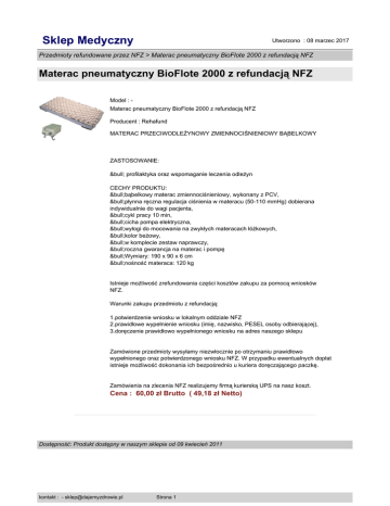 Sklep Medyczny Utworzono : 08 marzec 2017 Przedmioty refundowane przez NFZ > Materac pneumatyczny BioFlote 2000 z refundacją NFZ Materac pneumatyczny BioFlote 2000 z refundacją NFZ Model : Materac pneumatyczny BioFlote 2000 z refundacją NFZ Producent : Rehafund MATERAC PRZECIWODLEŻYNOWY ZMIENNOCIŚNIENIOWY BĄBELKOWY ZASTOSOWANIE: • profilaktyka oraz wspomaganie leczenia odleżyn CECHY PRODUKTU: •bąbelkowy materac zmiennociśnieniowy, wykonany z PCV, •płynna ręczna regulacja ciśnienia w materacu (50-110 mmHg) dobierana indywidualnie do wagi pacjenta, •cykl pracy 10 min, •cicha pompa elektryczna, •wyłogi do mocowania na zwykłych materacach łóżkowych, •kolor beżowy, •w komplecie zestaw naprawczy, •roczna gwarancja na materac i pompę •Wymiary: 190 x 90 x 6 cm •nośność materaca: 120 kg Istnieje możliwość zrefundowania części kosztów zakupu za pomocą wniosków NFZ. Warunki zakupu przedmiotu z refundacją: 1.potwierdzenie wniosku w lokalnym oddziale NFZ 2.prawidłowe wypełnienie wniosku (imię, nazwisko, PESEL osoby odbierającej), 3.doręczenie prawidłowo wypełnionego wniosku na adres naszego sklepu Zamówione przedmioty wysyłamy niezwłocznie po otrzymaniu prawidłowo wypełnionego oraz potwierdzonego wniosku NFZ. W przypadku ewentualnych dopłat istnieje możliwość dokonania ich bezpośrednio u kuriera doręczającego paczkę. Zamówienia na zlecenia NFZ realizujemy firmą kurierską UPS na nasz koszt. Cena : 60,00 zł Brutto ( 49,18 zł Netto) Dostępność: Produkt dostępny w naszym sklepie od 09 kwiecień 2011 kontakt : - [email protected] Strona 1