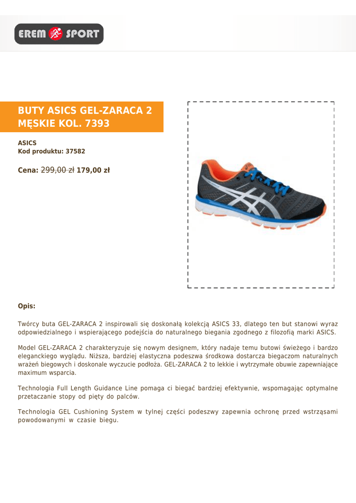 BUTY ASICS GEL-ZARACA 2 MĘSKIE KOL. 7393 ASICS Kod produktu: 37582 Cena: 299,00 zł 179,00 zł Opis: Twórcy buta GEL-ZARACA 2 inspirowali się doskonałą kolekcją ASICS 33, dlatego ten but stanowi wyraz odpowiedzialnego i wspierającego podejścia do naturalnego biegania zgodnego z filozofią marki ASICS. Model GEL-ZARACA 2 charakteryzuje się nowym designem, który nadaje temu butowi świeżego i bardzo eleganckiego wyglądu. Niższa, bardziej elastyczna podeszwa środkowa dostarcza biegaczom naturalnych wrażeń biegowych i doskonale wyczucie podłoża. GEL-ZARACA 2 to lekkie i wytrzymałe obuwie zapewniające maximum wsparcia. Technologia Full Length Guidance Line pomaga ci biegać bardziej efektywnie, wspomagając optymalne przetaczanie stopy od pięty do palców. Technologia GEL Cushioning System w tylnej części podeszwy zapewnia ochronę przed wstrząsami powodowanymi w czasie biegu. Idealny dla: Supinator Neutralny Tabela rozmiarów: