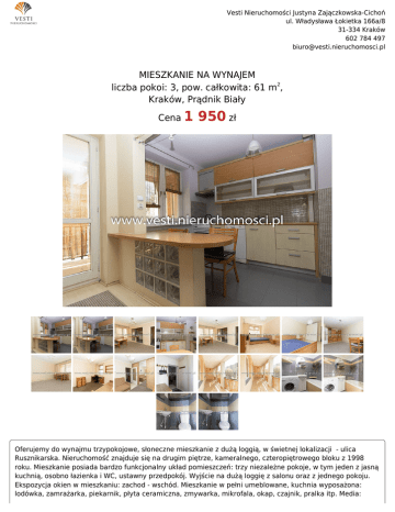 Vesti Nieruchomości Justyna Zajączkowska-Cichoń ul. Władysława Łokietka 166a/8 31-334 Kraków 602 784 497 [email protected] MIESZKANIE NA WYNAJEM liczba pokoi: 3, pow. całkowita: 61 m2, Kraków, Prądnik Biały Cena 1 950 zł Oferujemy do wynajmu trzypokojowe, słoneczne mieszkanie z dużą loggią, w świetnej lokalizacji - ulica Rusznikarska. Nieruchomość znajduje się na drugim piętrze, kameralnego, czteropiętrowego bloku z 1998 roku. Mieszkanie posiada bardzo funkcjonalny układ pomieszczeń: trzy niezależne pokoje, w tym jeden z jasną kuchnią, osobno łazienka i WC, ustawny przedpokój. Wyjście na dużą loggię z salonu oraz z jednego pokoju. Ekspozycja okien w mieszkaniu: zachod - wschód. Mieszkanie w pełni umeblowane, kuchnia wyposażona: lodówka, zamrażarka, piekarnik, płyta ceramiczna, zmywarka, mikrofala, okap, czajnik, pralka itp. Media: Vesti Nieruchomości Justyna Zajączkowska-Cichoń ul. Władysława Łokietka 166a/8 31-334 Kraków 602 784 497 [email protected] czynsz administracyjny wraz z ogrzewaniem: ok. 500 zł, dodatkowo płatny jedynie prąd. Ogrzewanie miejskie. Możliwość podłączenia taniego i szybkiego internetu UPC. Wokół budynku wystarczająca ilość miejsc do parkowania. Niewątpliwym atutem mieszkania jest jego lokalizacja: tylko 9 minut tramwajem do Galerii Krakowskiej, dworca PKP, w pobliżu przystanek tramwajowy, autobusowy, pętla szybkiego tramwaju, stacja kolejowa Łobzów. Wokół nieruchomości doskonale rozwinięta infrastruktura: supermarket Tesco, Kaufland, Biedronka, restauracja KFC, Telepizza, żłobek, przedszkola, szkoła itp. Gorąco polecam i zapraszam na prezentacje. Symbol 202/VST/MW Typ nieruchomości MIESZKANIE Województwo MAŁOPOLSKIE Gmina Kraków Miejscowość Kraków Dzielnica - osiedle Prądnik Biały Ulica Rusznikarska Rodzaj rynku WTÓRNY Cena 1 950 PLN Pow. całkowita 61,00 m2 Cena za m2 31,97 PLN Cena negocjowana TAK Czynsz i inne opłaty stałe 500,00 PLN Kaucja 1 950,00 PLN Minimalny okres wynajmu 1 rok Rodzaj mieszkania 3-POKOJOWE Liczba pięter 4 Piętro 2 Liczba pokoi 3 Rodzaj budynku BLOK Rok budowy 1998 Standard BARDZO DOBRY Konstrukcja budynku PUSTAK Technika budowy TRADYCYJNA Typ kuchni Z OKNEM, POŁĄCZONA Z SALONEM, POŁĄCZONA Z JADALNIĄ Wyposażenie kuchni PEŁNE Umeblowanie PEŁNE Źródło c.w. SIEĆ MIEJSKA Ogrzewanie C.O. Z SIECI MIEJSKIEJ Loggia JEST Widok na wschód JEST Widok na zachód JEST Forma własności SPÓŁDZIELCZE WŁASNOŚCIOWE Z KW Nr Licencji 13491 Justyna Zajączkowska-Cichoń Pośrednik w obrocie nieruchomościami 602 784 497 [email protected] Więcej ofert na stronie www.vesti.nieruchomosci.pl