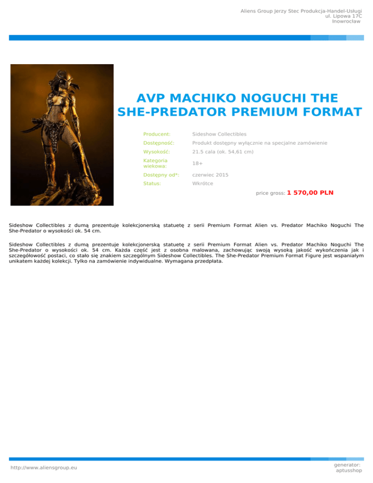 Aliens Group Jerzy Stec Produkcja-Handel-Usługi ul. Lipowa 17C Inowrocław AVP MACHIKO NOGUCHI THE SHE-PREDATOR PREMIUM FORMAT Producent: Sideshow Collectibles Dostępność: Produkt dostępny wyłącznie na specjalne zamówienie Wysokość: 21.5 cala (ok. 54,61 cm) Kategoria wiekowa: 18+ Dostępny od*: czerwiec 2015 Status: Wkrótce price gross: 1 570,00 PLN Sideshow Collectibles z dumą prezentuje kolekcjonerską statuetę z serii Premium Format Alien vs. Predator Machiko Noguchi The She-Predator o wysokości ok. 54 cm. Sideshow Collectibles z dumą prezentuje kolekcjonerską statuetę z serii Premium Format Alien vs. Predator Machiko Noguchi The She-Predator o wysokości ok. 54 cm. Każda część jest z osobna malowana, zachowując swoją wysoką jakość wykończenia jak i szczegółowość postaci, co stało się znakiem szczególnym Sideshow Collectibles. The She-Predator Premium Format Figure jest wspaniałym unikatem każdej kolekcji. Tylko na zamówienie indywidualne. Wymagana przedpłata. http://www.aliensgroup.eu generator: aptusshop