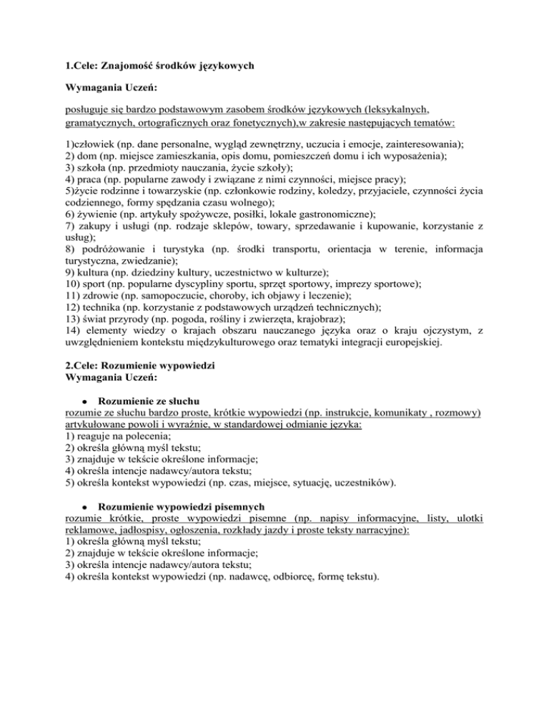 1.Cele: Znajomość środków językowych Wymagania Uczeń