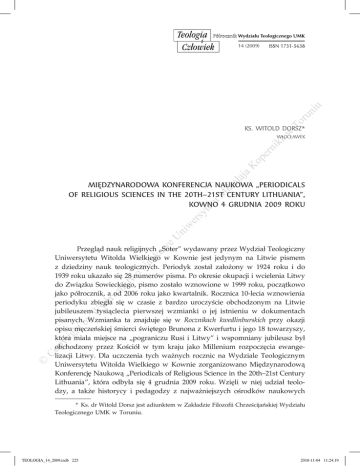 To ru ni u 14 (2009) aw Ks. Witold Dorsz* oł aj a K op er ni k włocławek eU ni w er sy te tu M ik Międzynarodowa Konferencja Naukowa „Periodicals of Religious Sciences in the 20th–21st Century Lithuania”, Kowno 4 grudnia 2009 roku © Co py t ig ht b y W yd a w ni c tw o N au ko w Przegląd nauk religijnych „Soter” wydawany przez Wydział Teologiczny Uniwersytetu Witolda Wielkiego w Kownie jest jedynym na Litwie pismem z dziedziny nauk teologicznych. Periodyk został założony w 1924 roku i do 1939 roku ukazało się 28 numerów pisma. Po okresie okupacji i wcielenia Litwy do Związku Sowieckiego, pismo zostało wznowione w 1999 roku, początkowo jako półrocznik, a od 2006 roku jako kwartalnik. Rocznica 10-lecia wznowienia periodyku zbiegła się w czasie z bardzo uroczyście obchodzonym na Litwie jubileuszem tysiąclecia pierwszej wzmianki o jej istnieniu w dokumentach pisanych. Wzmianka ta znajduje się w Rocznikach kwedlinburskich przy okazji opisu męczeńskiej śmierci świętego Brunona z Kwerfurtu i jego 18 towarzyszy, która miała miejsce na „pograniczu Rusi i Litwy” i wspomniany jubileusz był obchodzony przez Kościół w tym kraju jako Millenium rozpoczęcia ewangelizacji Litwy. Dla uczczenia tych ważnych rocznic na Wydziale Teologicznym Uniwersytetu Witolda Wielkiego w Kownie zorganizowano Międzynarodową Konferencję Naukową „Periodicals of Religious Science in the 20th–21st Century Lithuania”, która odbyła się 4 grudnia 2009 roku. Wzięli w niej udział teolodzy, a także historycy i pedagodzy z najważniejszych ośrodków naukowych * Ks. dr Witold Dorsz jest adiunktem w Zakładzie Filozofii Chrześcijańskiej Wydziału Teologicznego UMK w Toruniu. TEOLOGIA_14_2009.indb 225 2010-11-04 11:24:19 Litwy oraz reprezentanci środowisk teologicznych z Łotwy oraz z Polski (UMK i KUL), współpracujących z Wydziałem Teologicznym w Kownie i redakcją pisma „Soter”. Obchodzone jubileusze stanowiły doskonałą okazję do analizy dorobku kowieńskiego kwartalnika teologicznego i jego porównania podobnymi periodykami ukazującymi się we współpracujących ośrodkach w Polsce, refleksji nad wkładem pisma w dialog ze współczesną nauką i kulturą i w ewangelizację w kontekście tysiąclecia rozpoczęcia chrystianizacji Litwy oraz debaty nad najważniejszymi problemami, wyzwaniami i kierunkami rozwoju pism naukowych z dziedziny teologii i nauk religijnych na Litwie i w krajach ościennych w XX i XXI wieku. Spośród referatów dotyczących historii i analizy zawartości pisma „Soter” na szczególną uwagę zasługują dwa z nich, wygłoszone przez prof. dr. hab. Alfonsasa Motuzasa, zastępcę redaktora naczelnego pisma oraz ks. prałata prof. dr. hab. Vytautasa Steponasa Vaičiūnasa, pierwszego dziekana Wydziału Teologicznego na Uniwersytecie Witolda Wielkiego w Kownie i redaktora naczelnego „Sotera”. Profesor Motuzas poświęcił swój referat historiografii przywróconego do życia po niemal sześćdziesięcioletniej przerwie pisma: okolicznościom jego wznowienia, historii rozwoju i drodze do przekształcenia go w międzynarodowy periodyk naukowy. Inicjatywa powrotu do wydawania pisma pojawiła się w związku z 10 rocznicą ponownego otwarcia Uniwersytetu Witolda Wielkiego, zamkniętego przez władze sowieckie w 1949 roku i przywróconego do istnienia na fali ruchu przebudowy Litwy w 1989 roku. Na posiedzeniu Rady Wydziału Teologicznego 16 czerwca 1998 roku postawiono wniosek o przywrócenie wydawania przeglądu religijnego „Soter”, co spotkało się z aprobatą władz Wydziału Teologicznego i rektora Uniwersytetu oraz władz ministerialnych. W 1999 roku „Soter” otrzymał numer ISSN oraz potrzebne fundusze z uczelni i w czerwcu tegoż roku ukazał się jego pierwszy numer. Początkowo pismo wychodziło jako półrocznik, od 2003 roku rozpoczęto wydawać trzy numery rocznie, a w 2006 roku przekształciło się w kwartalnik. W ciągu 10 lat od wznowienia ukazały się 32 numery periodyku. Już w 2000 roku uruchomiono stronę internetową pisma, na której są dostępne w formacie PDF w pełnej wersji dotychczas wydane numery „Sotera”. Periodyk jest też dostępny w litewskich bibliotekach cyfrowych oraz w CEEOL (Central and Eastern European Online Library) i Directory of Open Access Journal, a od 2006 roku także indeksowany w The Philosopher’s Index, najbardziej wszechstronnej i uznanej bibliograficznej bazie danych ze wszystkich dziedzin filozofii. Istotnymi momentami na drodze nadania i poszerzenia międzynarodowego charakteru pisma były i są międzynarodowe konferencje organizowane w Kownie, których pokłosie publikowane jest na łamach kwartalnika, udział członków redakcji w sympozjach zagranicznych, w tym w dorocznych zjazdach dziekanów wydziałów teologicznych w Polsce u Ks. Witold Dorsz © Co py t ig ht b y W yd a w ni c tw o N au ko w eU ni w er sy te tu M ik oł aj a K op er ni k aw To ru ni 226 TEOLOGIA_14_2009.indb 226 2010-11-04 11:24:19 © Co py t ig ht b y W yd a w ni c tw o N au ko w eU ni w er sy te tu M ik oł aj a K op er ni k aw To ru ni oraz coroczne spotkania Międzynarodowego i Regionalnego Kolegium Redakcyjnego, na których poddawane jest ocenie funkcjonowanie periodyku i ustalane są linie jego dalszego rozwoju. Ksiądz prałat profesor Vaičiūnas poświęcił swój referat analizie ilościowej i jakościowej artykułów opublikowanych w ciągu minionego dziesięciolecia na łamach „Sotera”. W 30 numerach i 5 suplementach, które ukazały się w okresie od 1999 do 2009 roku, od numeru 1(29) do 30(58), opublikowano w sumie 414 artykułów, z których 21% dotyczyło problematyki teologicznej, 15% filozofii, 2% liturgii, 19% chrześcijańskiej pedagogiki i psychologii, 10% historii Kościoła, 13% katolickiej nauki społecznej, 20% etnologii i religiologii. Pogłębiona analiza tych publikacji dokonana przez autora referatu ukazała znaczenie „Sotera” w wypełnianiu przez Ko