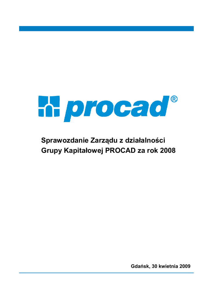 Sprawozdanie Zarządu z działalności Grupy Kapitałowej PROCAD za rok 2008 Gdańsk, 30 kwietnia 2009 Sprawozdanie Zarządu z działalności Grupy Kapitałowej PROCAD za rok 2008 1. Grupa Kapitałowa PROCAD Grupa kapitałowa PROCAD powstała w pierwszym półroczu 2008 roku, po objęciu kontroli nad DES ART Spółką z o.o. w Gdyni. Objęcie kontroli nastąpiło w dniu 24.04.2008 roku, w związku z nabyciem pakietu 51 % udziałów w kapitale zakładowym Spółki. Na dzień sporządzenia niniejszego sprawozdania Grupę Kapitałową PROCAD stanowią jednostka dominująca PROCAD SA oraz jednostka zaleŜna DES ART Spółka z o.o. Ponadto w skład Grupy wchodzą: PROJEKT–BIZ Sp. z o.o. z siedzibą w Gdańsku oraz CADOR Sp. z o.o. z siedzibą w Gdyni w której DES ART Spółka z o.o. posiada 100 % udziałów w kapitale zakładowym. Oba podmioty są wyłączone z konsolidacji ze względu na nieistotną wartość ich pozycji bilansowych. Struktura Grupy Kapitałowej została opisana w punkcie 7 „Opis organizacji grupy kapitałowej Emitenta, ze wskazaniem jednostek podlegających konsolidacji oraz skutków zmian w strukturze Grupy” w Informacjach dodatkowych do skonsolidowanego sprawozdania finansowego. 1.1 Podmiot dominujący PROCAD SA powstała 26 maja 2006 roku w wyniku przekształcenia PROCAD Sp. z o.o. w Spółkę Akcyjną. PROCAD Sp. z o.o. została zawiązana 20 grudnia 1993 roku w Kancelarii Notarialnej E. Panc w Gdańsku przy ulicy Pniewskiego 8/2, początkowo pod nazwą „W.M. – CENTRUM CAD” Sp. z o.o. i postanowieniem Sądu Rejonowego w Gdańsku z dnia 23 grudnia 1993 roku została wpisana do rejestru handlowego w dziale B pod nr 9283. W dniu 25 sierpnia1994 roku Uchwałą Nadzwyczajnego Zgromadzenia Wspólników dokonano zmiany nazwy Spółki na „W.M. - PROCAD Studio” Spółka z o.o. Postanowieniem z dnia 3 września 2001 Sądu Rejonowego w Gdańsku, XII Wydział Gospodarczy Krajowego Rejestru Sądowego Spółka została wpisana do rejestru KRS pod numerem 0000039860 . Dnia 29 września 2004 roku Uchwałą Nadzwyczajnego Zgromadzenia Wspólników dokonano zmiany nazwy Spółki na PROCAD Spółka z o.o. Od dnia 26 maja 2006 podstawę prawną działania Spółki stanowi Statut Spółki Akcyjnej sporządzony w formie aktu notarialnego w Kancelarii Notarialnej Adama Wasaka, w Gdańsku przy ulicy Wajdeloty 18/1 (Rep. A nr 3140/2006). Postanowieniem Sądu Rejonowego Gdańsk-Północ w Gdańsku PROCAD Spółka Akcyjna została wpisana do Krajowego Rejestru Sądowego pod numerem KRS 0000258329 w dniu 1 czerwca 2006. PROCAD SA zajmuje się wdroŜeniami systemów CAD od 1994 roku. Obecnie jest największą Spółką informatyczną działającą na polskim rynku systemów Autodesk. MoŜe poszczycić się wieloma wyróŜnieniami, w tym: Autodesk Systems Center of the Year 1999/2000 (dla regionu Europy, Bliskiego Wschodu i Afryki!) oraz wieloma nagrodami za największą w Polsce sprzedaŜ produktów Autodesk. PROCAD SA oferuje kompletne rozwiązania, dostarcza sprzęt komputerowy, urządzenia peryferyjne oraz róŜnego rodzaju oprogramowanie specjalistyczne. Zapewnia serwis gwarancyjny i pogwarancyjny sprzętu komputerowego i oprogramowania. Prowadzi szkolenia w oparciu o własne centrum szkoleniowe o statusie Autodesk Authorized Training Center. Oferuje usługi wdroŜeniowe oraz pełną opiekę nad infrastrukturą IT. Pomaga w dobraniu najlepszych form finansowania inwestycji, oferuje przedłuŜone terminy płatności, raty oraz korzystny leasing operacyjny. Konsekwentnie realizuje strategię rozwoju terytorialnego - posiada obecnie 5 oddziałów (Radom, Warszawa, Poznań, Katowice i Wrocław). Sprawozdanie Zarządu z działalności Grupy Kapitałowej PROCAD w roku 2008 2/27 1.2 Podmiot zaleŜny DES ART Spółka z o.o. powstała w 2003. Spółka została zarejestrowana przez Sąd Rejonowy w Gdańsku, XVI Wydział Gospodarczy Krajowego Rejestru Sądowego z siedzibą w Gdyni w dniu 21-01-2003 r. pod numerem KRS 0000147862. Głównym obszarem działalności DES ART jest świadczenie usług w zakresie wykorzystania technik komputerowego wspomagania projektowania (CAD/CAE) w przemyśle i nauce. W dniu 18.06.2008 roku został zarejestrowany w KRS podwyŜszony kapitał zakładowy Spółki, który zwiększono do kwoty 138.800 zł w wyniku objęcia przez PROCAD SA 38 800 nowych udziałów w podwyŜszonym kapitale zakładowym DES ART. 2. Skład organu zarządzającego i nadzorującego PROCAD SA a) W skład Zarządu PROCAD SA na dzień 31 grudnia 2008 roku wchodzili: Jarosław Jarzyński - Prezes Zarządu, Janusz Szczęśniak - Wiceprezes Zarządu, Maciej Horeczy - Wiceprezes Zarządu. b) W skład Rady Nadzorczej PROCAD SA na dzień 31 grudnia 2008 roku wchodzili: Paweł Władysław Kowalski - Przewodniczący Rady Nadzorczej, Mariusz Jagodziński - Sekretarz Rady Nadzorczej, Andrzej Chmielecki - Członek Rady Nadzorczej, Andrzej Przewoźnik - Członek Rady Nadzorczej, BoŜena Szczęśniak - Członek Rady Nadzorczej. W roku 2008 skład Zarządu PROCAD SA oraz skład Rady Nadzorczej PROCAD SA nie uległy zmianie. Pomiędzy dniem bilansowym, a dniem sporządzenia niniejszego sprawozdania finansowego skład Zarządu PROCAD SA oraz skład Rady Nadzorczej PROCAD SA nie uległy zmianie. 3. Skład organów zarządzającego i nadzorującego w Spółkach Grupy a) W skład Zarządu DES ART Spółka z .o.o. na dzień 31 grudnia 2008 roku wchodzili: Tomasz Dobrosielski - Prezes Zarządu b) W skład Rady Nadzorczej DES ART Spółka z o.o. na dzień 31 grudnia 2008 roku wchodzili: Maciej Krzysztof Horeczy - Przewodniczący Rady Nadzorczej Jarosław Jarzyński - Sekretarz Rady Nadzorczej Ludwik Dobrosielski - Członek Rady Nadzorczej W roku 2008 skład Zarządu DES ART Spółka z .o.o. nie uległ zmianie. Rada Nadzorcza DES ART Sp. z o.o. została powołana w dniu 09.05.2008r. Pomiędzy dniem bilansowym, a dniem sporządzenia niniejszego sprawozdania finansowego skład Zarządu DES ART Spółka z .o.o. oraz