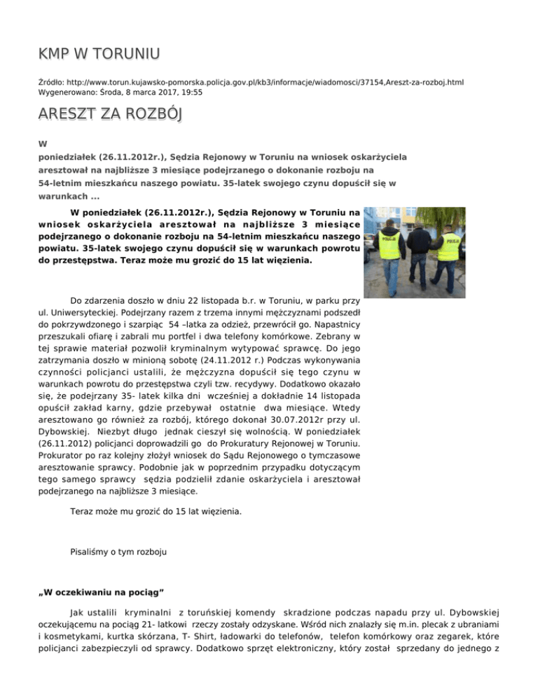 KMP W TORUNIU Źródło: http://www.torun.kujawsko-pomorska.policja.gov.pl/kb3/informacje/wiadomosci/37154,Areszt-za-rozboj.html Wygenerowano: Środa, 8 marca 2017, 19:55 ARESZT ZA ROZBÓJ W poniedziałek (26.11.2012r.), Sędzia Rejonowy w Toruniu na wniosek oskarżyciela aresztował na najbliższe 3 miesiące podejrzanego o dokonanie rozboju na 54-letnim mieszkańcu naszego powiatu. 35-latek swojego czynu dopuścił się w warunkach ... W poniedziałek (26.11.2012r.), Sędzia Rejonowy w Toruniu na wniosek oskarżyciela aresztował na najbliższe 3 miesiące podejrzanego o dokonanie rozboju na 54-letnim mieszkańcu naszego powiatu. 35-latek swojego czynu dopuścił się w warunkach powrotu do przestępstwa. Teraz może mu grozić do 15 lat więzienia. Do zdarzenia doszło w dniu 22 listopada b.r. w Toruniu, w parku przy ul. Uniwersyteckiej. Podejrzany razem z trzema innymi mężczyznami podszedł do pokrzywdzonego i szarpiąc 54 –latka za odzież, przewrócił go. Napastnicy przeszukali ofiarę i zabrali mu portfel i dwa telefony komórkowe. Zebrany w tej sprawie materiał pozwolił kryminalnym wytypować sprawcę. Do jego zatrzymania doszło w minioną sobotę (24.11.2012 r.) Podczas wykonywania czynności policjanci ustalili, że mężczyzna dopuścił się tego czynu w warunkach powrotu do przestępstwa czyli tzw. recydywy. Dodatkowo okazało się, że podejrzany 35- latek kilka dni wcześniej a dokładnie 14 listopada opuścił zakład karny, gdzie przebywał ostatnie dwa miesiące. Wtedy aresztowano go również za rozbój, którego dokonał 30.07.2012r przy ul. Dybowskiej. Niezbyt długo jednak cieszył się wolnością. W poniedziałek (26.11.2012) policjanci doprowadzili go do Prokuratury Rejonowej w Toruniu. Prokurator po raz kolejny złożył wniosek do Sądu Rejonowego o tymczasowe aresztowanie sprawcy. Podobnie jak w poprzednim przypadku dotyczącym tego samego sprawcy sędzia podzielił zdanie oskarżyciela i aresztował podejrzanego na najbliższe 3 miesiące. Teraz może mu grozić do 15 lat więzienia. Pisaliśmy o tym rozboju „W oczekiwaniu na pociąg” Jak ustalili kryminalni z toruńskiej komendy skradzione podczas napadu przy ul. Dybowskiej oczekującemu na pociąg 21- latkowi rzeczy zostały odzyskane. Wśród nich znalazły się m.in. plecak z ubraniami i kosmetykami, kurtka skórzana, T- Shirt, ładowarki do telefonów, telefon komórkowy oraz zegarek, które policjanci zabezpieczyli od sprawcy. Dodatkowo sprzęt elektroniczny, który został sprzedany do jednego z toruńskich lombardów: konsola, dysk zewnętrzny i tablet również zostały odzyskane i wkrótce wrócą do właściciela. Policjanci jeszcze dzisiaj planują doprowadzić do toruńskiej prokuratury 35- letniego sprawcę tego napadu. Teraz może mu grozić do 12 lat więzienia. Informacja z dnia 31.07.2012„W oczekiwaniu na pociąg” Wczoraj policjanci z Komisariatu na Podgórzu zostali powiadomieni o rozboju do jakiego doszło w Toruniu na ul. Dybowskiej. Około godziny 14.00 pokrzywdzony, który czekał na pociąg do Łodzi opuścił teren dworca i wraz z przygodnie poznanym mężczyzną poszedł wypić piwo. W pewnym momencie nowo poznany znajomy poprosił go o użyczenie telefonu. Po skorzystaniu nie chciał go już jednak oddać. Do tego zażądał od niego wydania zegarka. Ten jednak stanowczo odmówił. Wtedy sprawca uderzył go i znów kazał wydać zegarek. Dodatkowo kazał mu oddać T-shirta, koszulę i kurtkę skórzaną oraz pieniądze. Gdy pokrzywdzony ponownie odmówił znów został uderzony. Wtedy 21- latek z wydał rzeczy oraz plecak, w którym miał sprzęt wart kilkaset złotych a sprawca uciekł. Mimo to, iż sprawca nie posiadał stałego adresu zameldowania policjanci bardzo szybko go ustalili. Dzisiaj doszło do jego zatrzymania. Jest to 35- latek, który przebywa w Toruniu. Wcześniej był już notowany za liczne kradzieże, oszustwa i rozbój. W styczniu tego roku opuścił zakład karny po 13 -latach pozbawienia wolności. Policjanci odzyskali część skradzionych podczas napadu rzeczy, które jeszcze dzisiaj wrócą do właściciela. Wtedy będzie mógł spokojnie wrócić pierwszym pociągiem do Łodzi. Teraz może mu grozić do 12 lat więzienia Autor: rzeczniktorun1 Publikacja: rzeczniktorun1 Ocena: 0/5 (0) Tweetnij