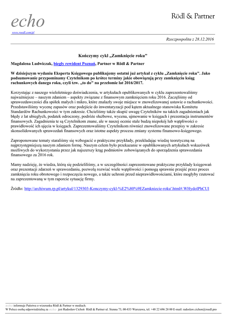 echo www.roedl.com/pl Rzeczpospolita z 28.12.2016 Kończymy cykl „Zamknięcie roku" Magdalena Ludwiczak, biegły rewident Poznań, Partner w Rödl & Partner W dzisiejszym wydaniu Eksperta Księgowego publikujemy ostatni już artykuł z cyklu „Zamknięcie roku". Jako podsumowanie przypominamy Czytelnikom po krótce terminy jakie obowiązują przy zamknięciu ksiąg rachunkowych danego roku, czyli tzw. „to do" na przełomie lat 2016/2017. Korzystając z naszego wieloletniego doświadczenia, w artykułach opublikowanych w cyklu zaprezentowaliśmy najważniejsze – naszym zdaniem – aspekty związane z finansowym zamknięciem roku 2016. Zaczęliśmy od sprawozdawczości dla spółek małych i mikro, które znalazły swoje miejsce w znowelizowanej ustawie o rachunkowości. Przedstawiliśmy wycenę zapasów oraz podejście do inwentaryzacji pod kątem aktualnego stanowiska Komitetu Standardów Rachunkowości w tym zakresie. Chcieliśmy także skupić uwagę Czytelników na takich zagadnieniach jak błędy z lat ubiegłych, podatek odroczony, podróże służbowe, wycena, ujmowanie w księgach i prezentacja instrumentów finansowych. Zagadnienia te są Czytelnikom znane, ale w naszej ocenie stale budzą niepokój lub wątpliwości o prawidłowość ich ujęcia w księgach. Zaprezentowaliśmy Czytelnikom również znowelizowane przepisy w zakresie skonsolidowanych sprawozdań finansowych oraz istotne aspekty procesu zmiany systemu finansowo-księgowego. Zaproponowane tematy staraliśmy się wzbogacić o praktyczne przykłady, przekładając wiedzę teoretyczną na najprzystępniejszą naszym zdaniem formę. Naszym celem było przekazanie w opublikowanych artykułach wskazówek możliwych do wykorzystania przez jak najszerszy krąg podmiotów zobowiązanych do sporządzenia sprawozdania finansowego za 2016 rok. Mamy nadzieję, że wiedza, którą się podzieliliśmy, a w szczególności zaprezentowane praktyczne przykłady księgowań oraz prezentacji zdarzeń w sprawozdaniu, pozwolą rozwiać wiele wątpliwości i pomogą sprawnie przejść przez proces zamknięcia roku obrotowego i rozpoczęcia nowego, a także uchroni przed nieprawidłowościami, które mogłyby rzutować na zaprezentowaną w tym raporcie sytuację firmy. Źródło: http://archiwum.rp.pl/artykul/1329303-Konczymy-cykl-%E2%80%9EZamkniecie-roku'.html#.WHydolPhCUl echo informuje Państwa o wizerunku Rödl & Partner w mediach. W Polsce osobą odpowiedzialną za echo jest Radosław Cichoń Rödl & Partner ul. Sienna 73, 00-833 Warszawa, tel. +48 22 696 28 00 E-mail: [email protected]